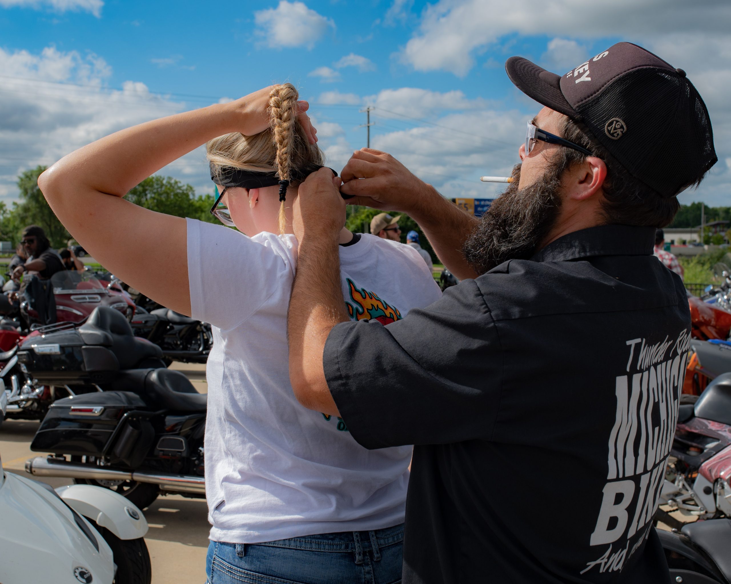 Ben Weirauch of Thunder Roads of Michigan ties Skye Jager’s bandana at the Vehicle City Harley-Davidson in preparation for a police-escorted to Bikes on the Bricks in downtown Flint, Mich. on Saturday, Sept. 9, 2023. (Michael Indriolo | Flint Beat)