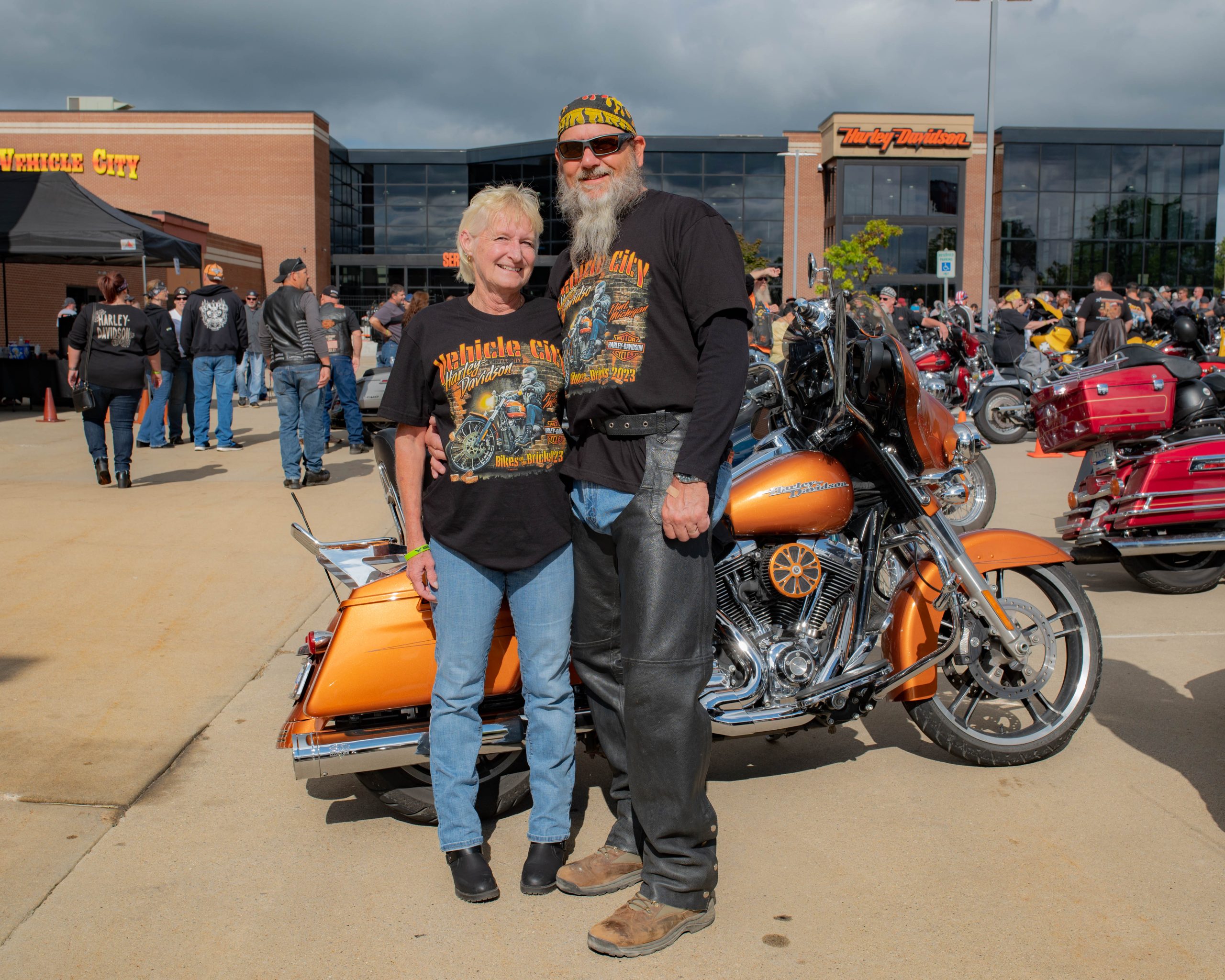 Lifelong motorcyclists Brian and Kat Beard pose for a picture with their bike at the Vehicle City Harley-Davidson in preparation for a police-escorted to Bikes on the Bricks in downtown Flint, Mich. on Saturday, Sept. 9, 2023. (Michael Indriolo | Flint Beat)