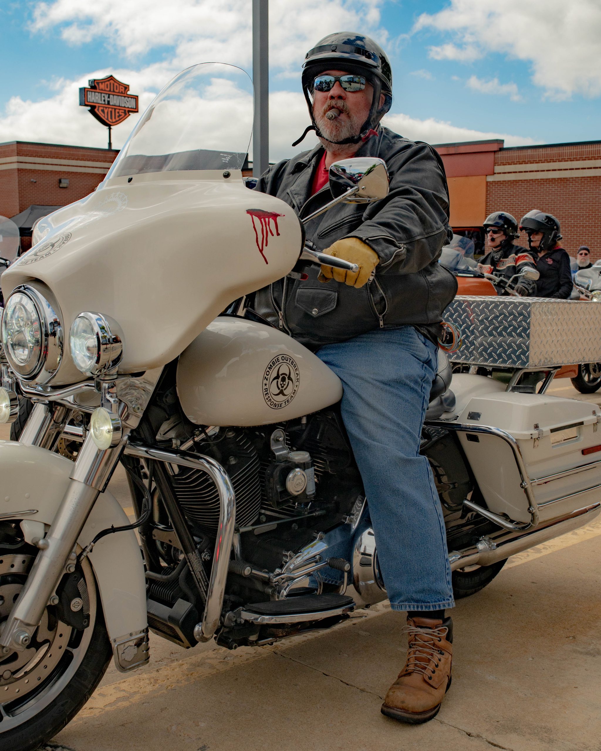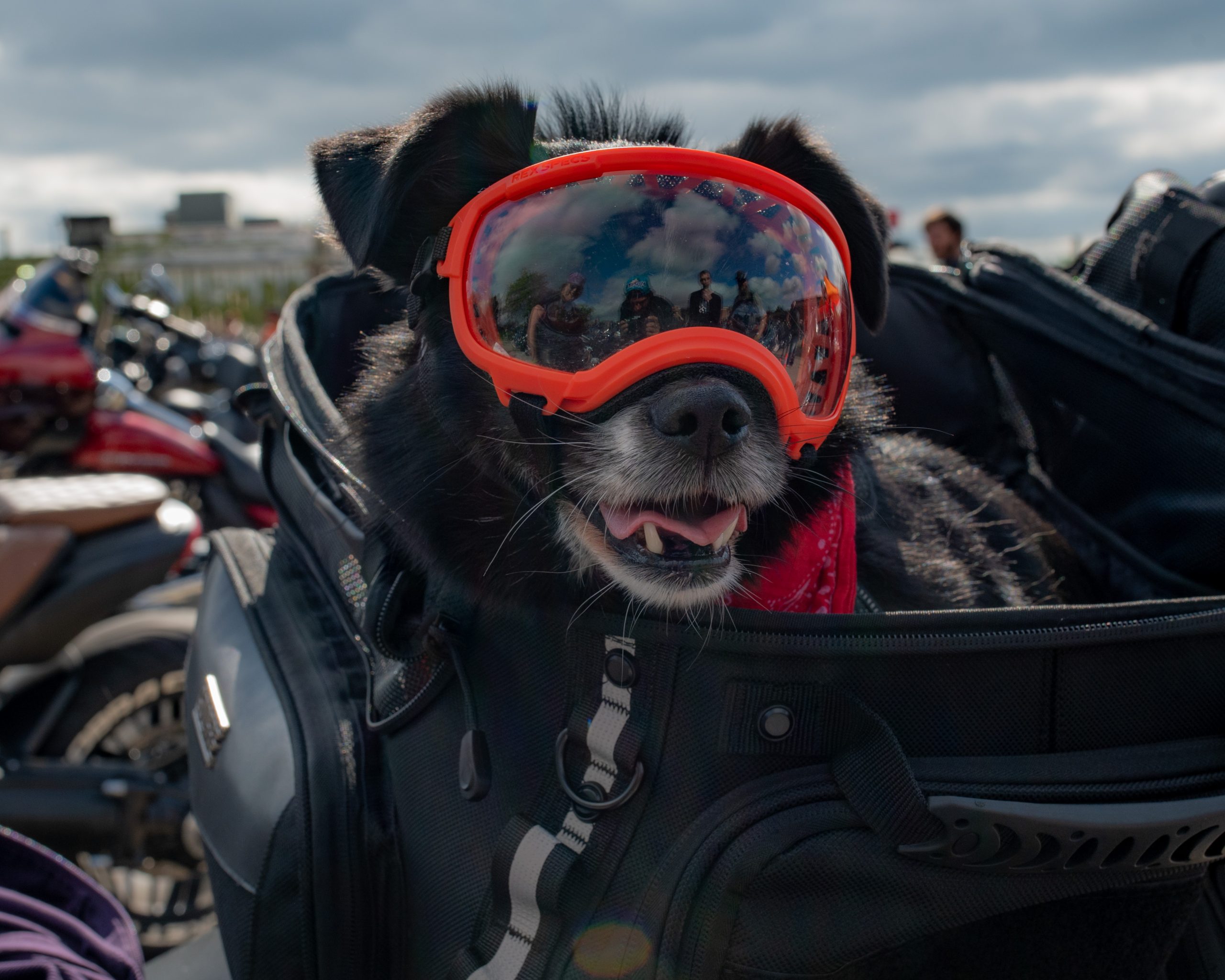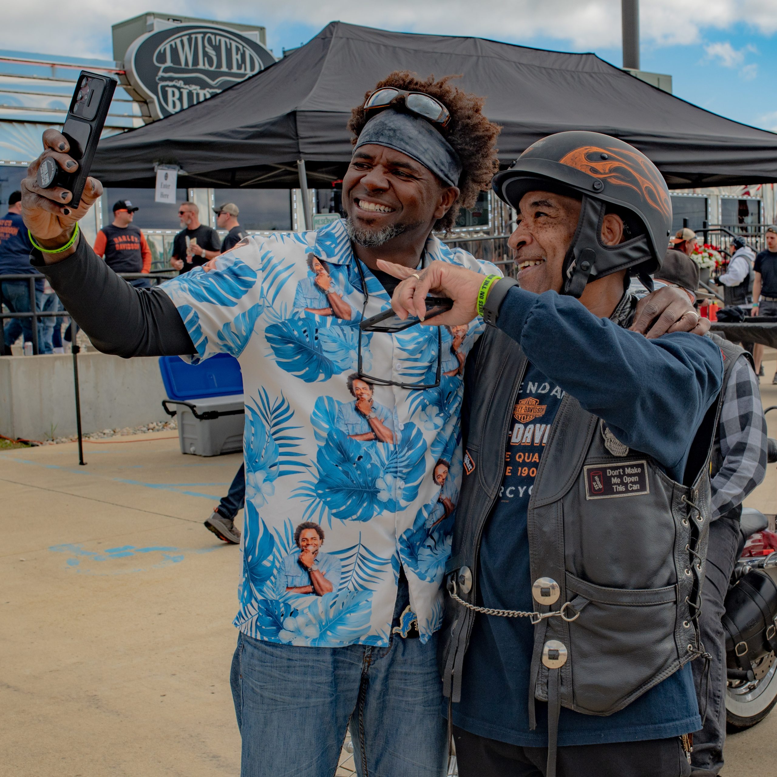 Moose the dog dons his “doggles” at the Vehicle City Harley-Davidson in preparation for a police-escorted to Bikes on the Bricks in downtown Flint, Mich. on Saturday, Sept. 9, 2023. (Michael Indriolo | Flint Beat)Tim Freeman and Marlow the entertainer take a selfie at the Vehicle City Harley-Davidson in preparation for a police-escorted to Bikes on the Bricks in downtown Flint, Mich. on Saturday, Sept. 9, 2023. (Michael Indriolo | Flint Beat)