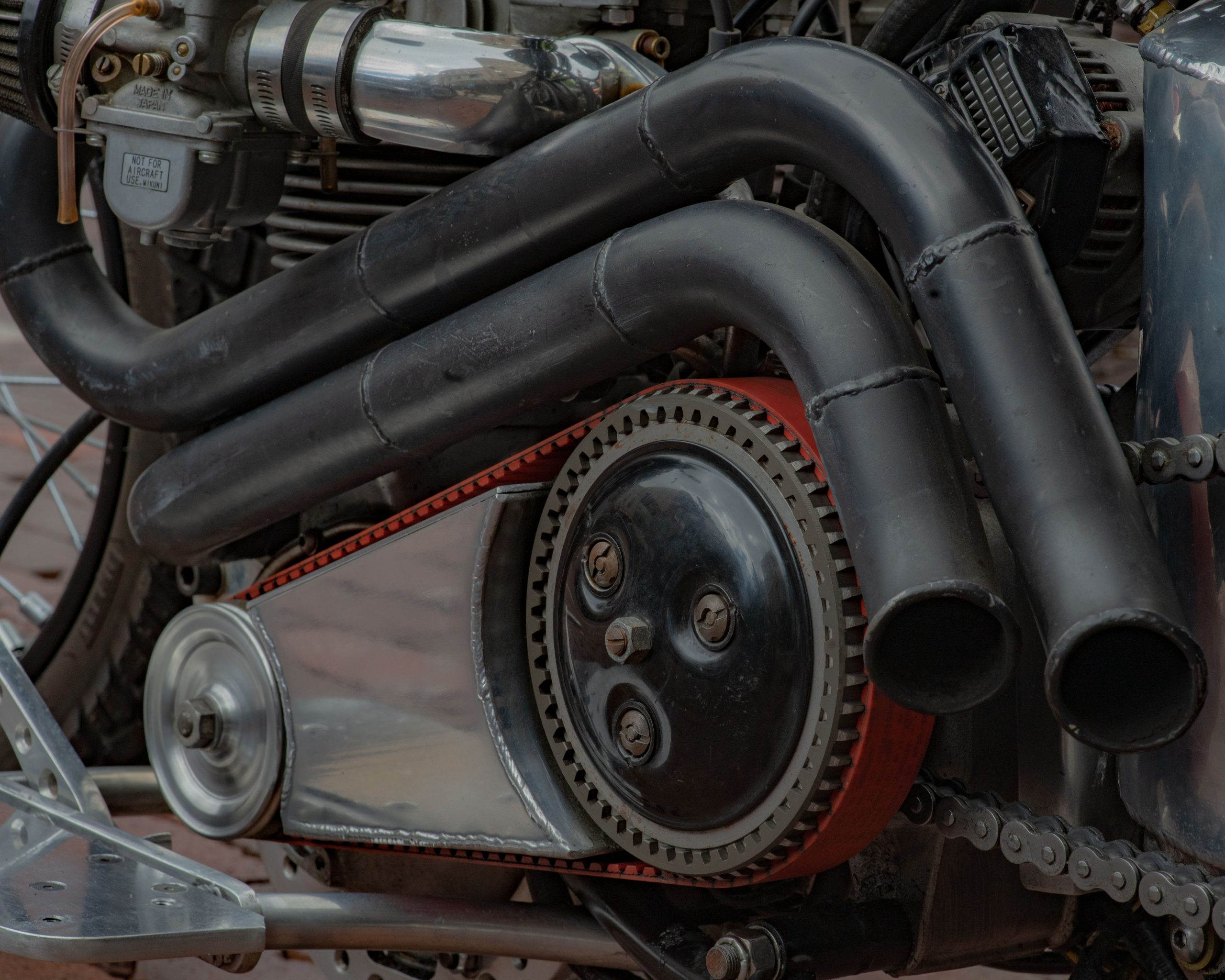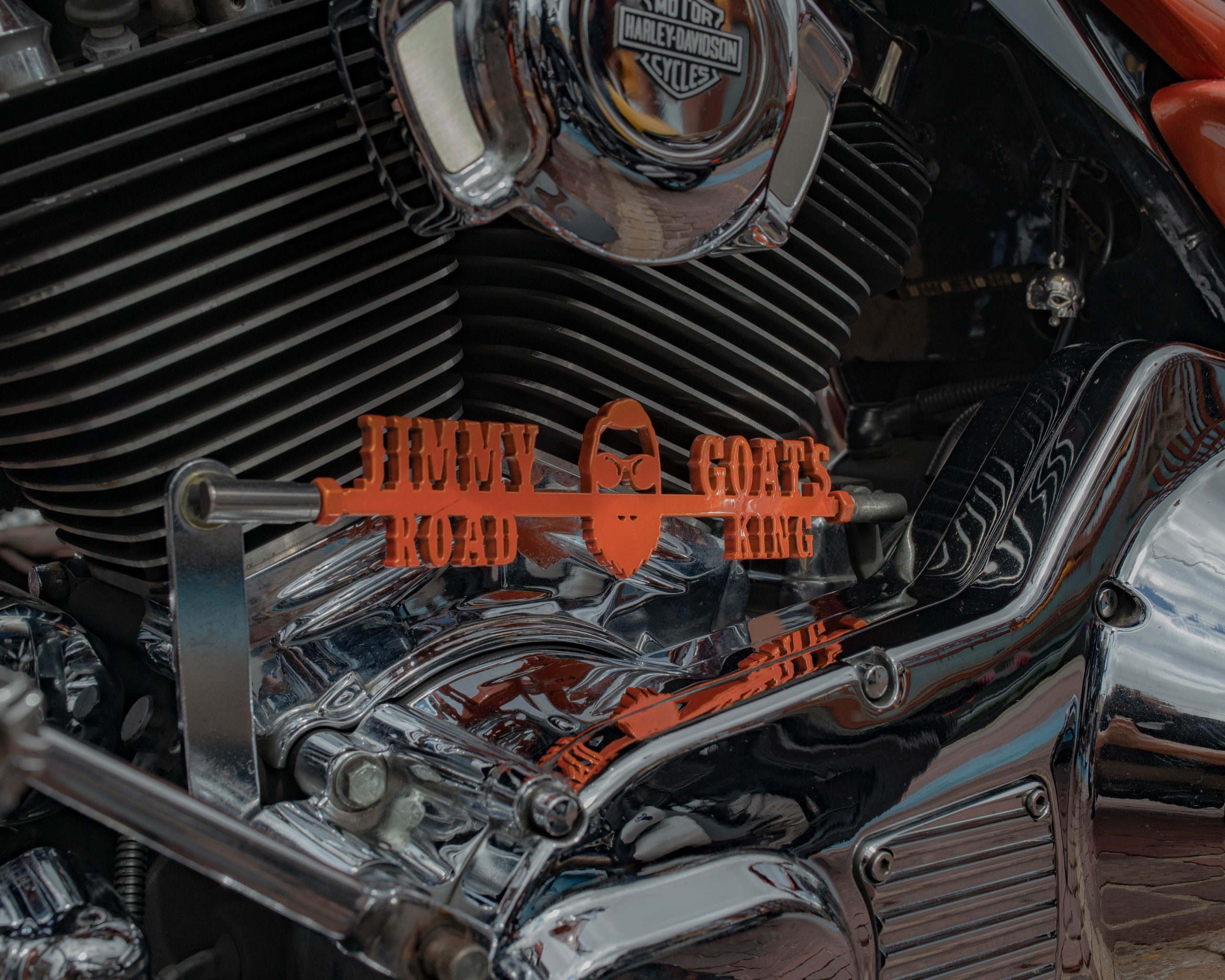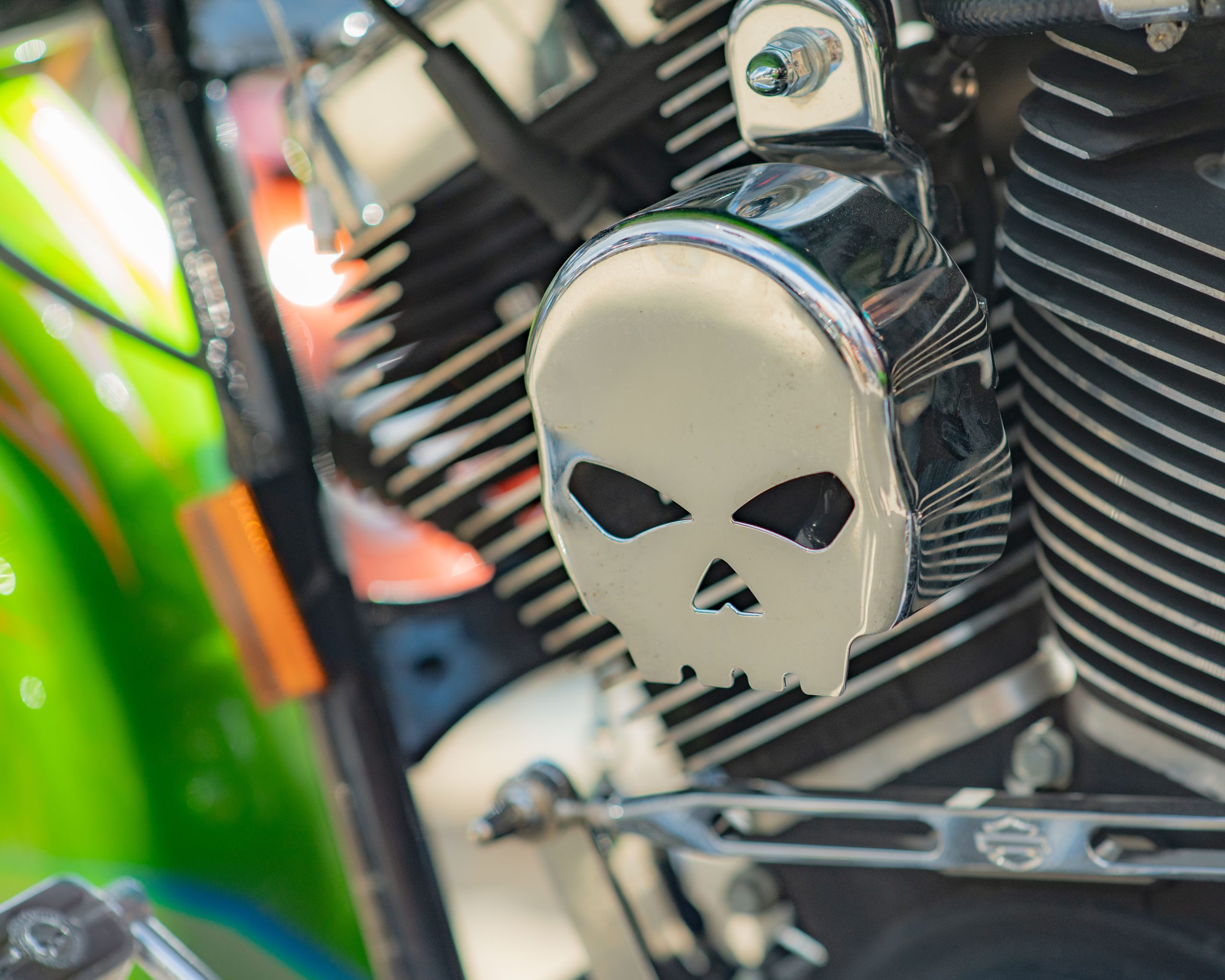 A motorcycle’s clutch cover is in the shape of a skull at the Vehicle City Harley-Davidson as motorcyclists prepare to roll out on a police-escorted to Bikes on the Bricks in downtown Flint, Mich. on Saturday, Sept. 9, 2023. (Michael Indriolo | Flint Beat)