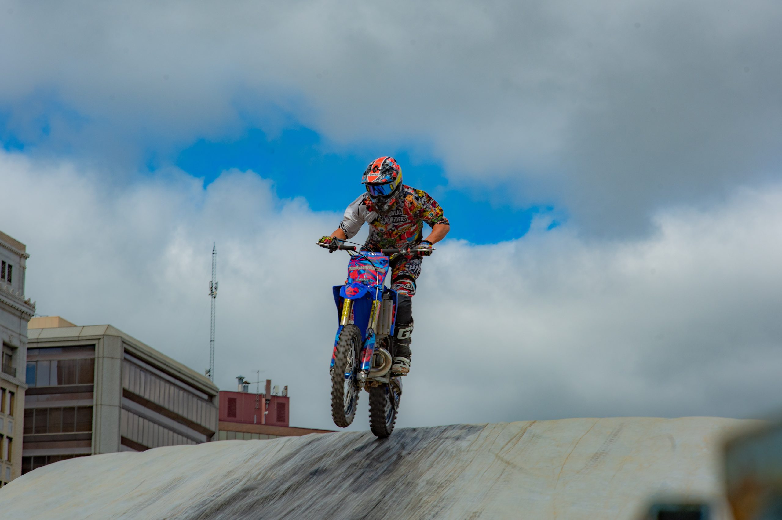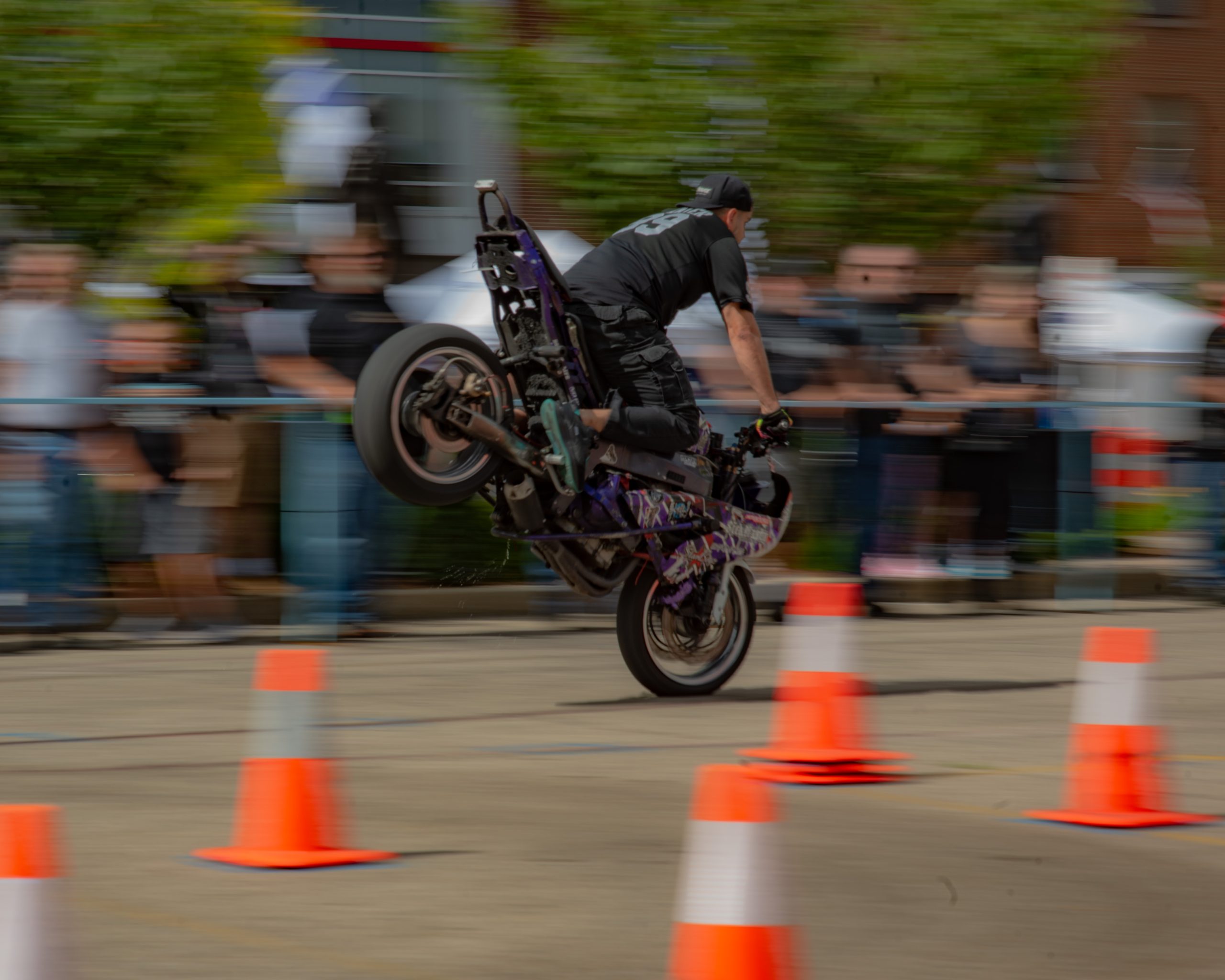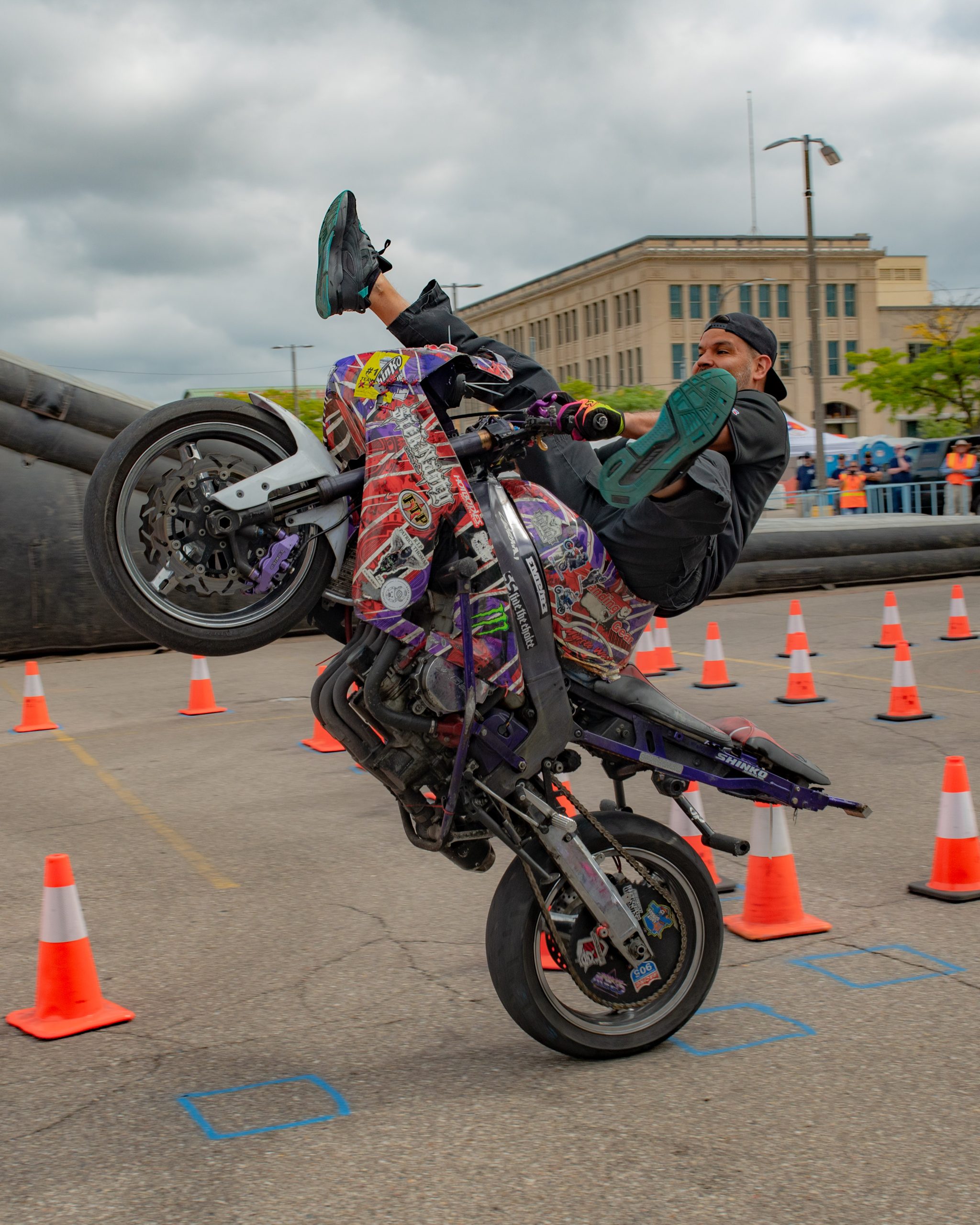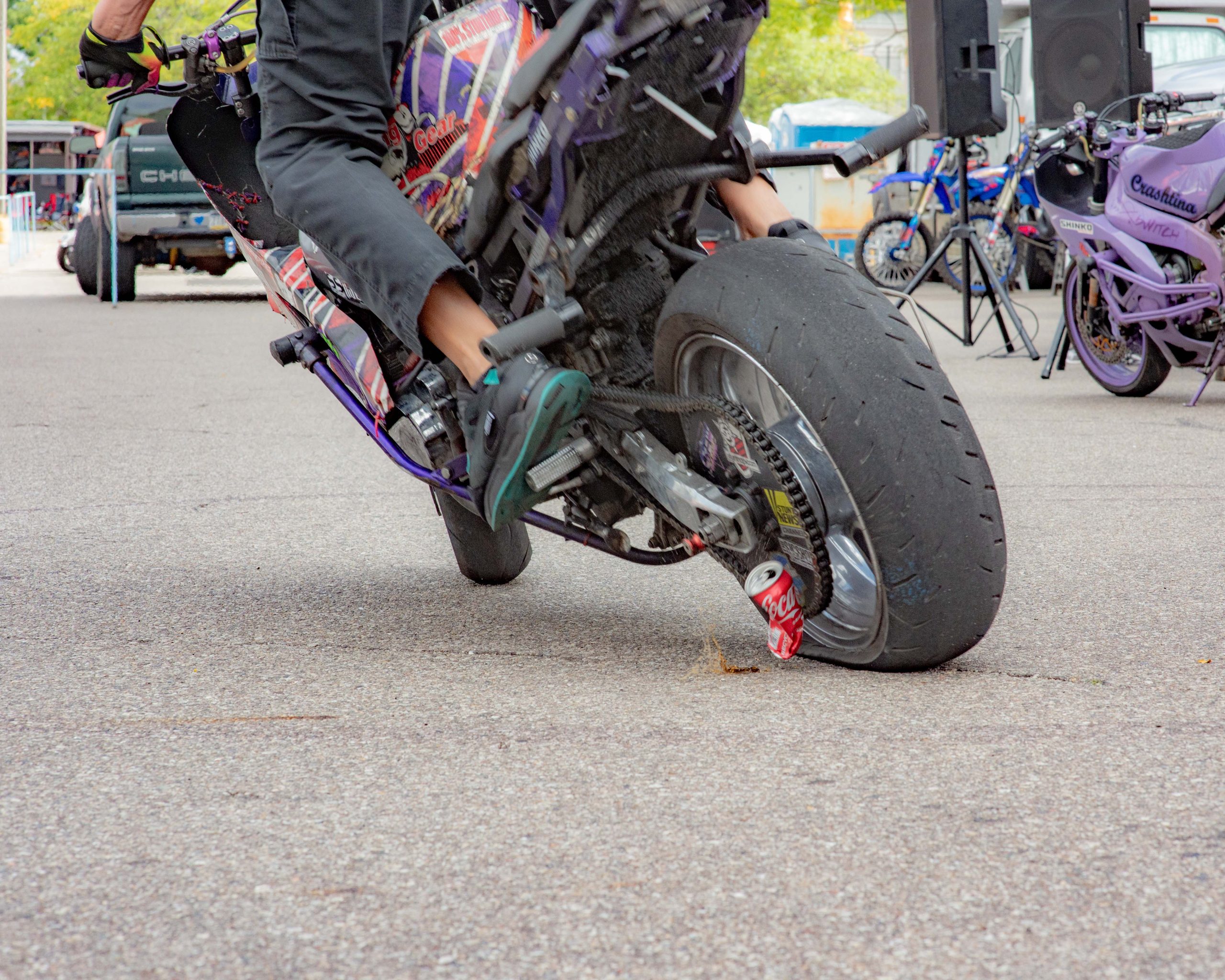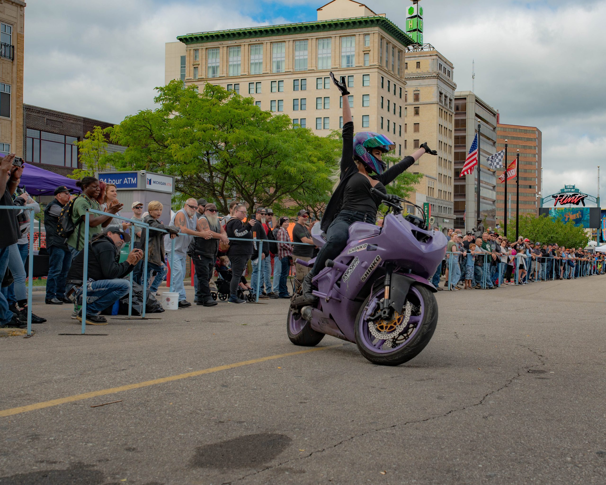 Christina Billings, also known as Crashtina, rides her motorcycle with no hands during her stunt show at Bikes on the Bricks in downtown Flint, Mich. on Saturday, Sept. 9, 2023. (Michael Indriolo | Flint Beat)Ryan Laneer of Carolina Freestyle pops a wheelie during the Crashtina stunt show at Bikes on the Bricks in downtown Flint, Mich. on Saturday, Sept. 9, 2023. (Michael Indriolo | Flint Beat)