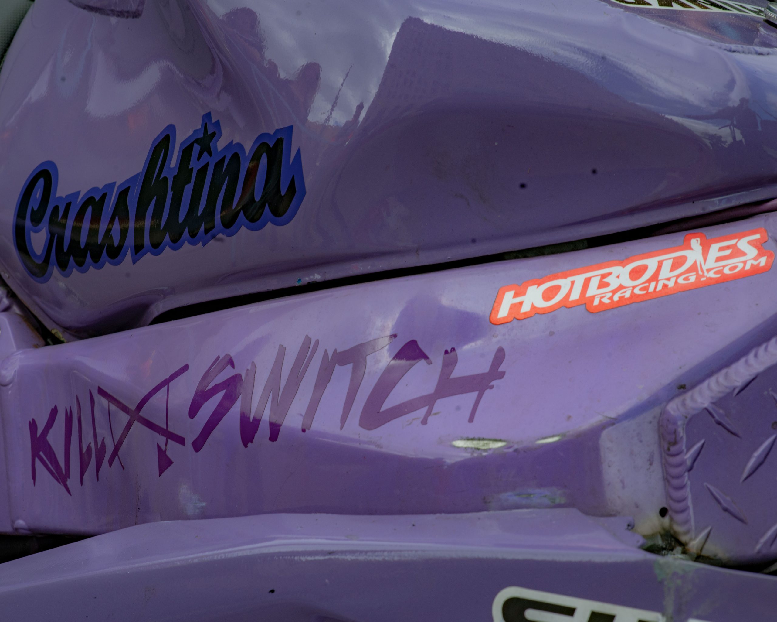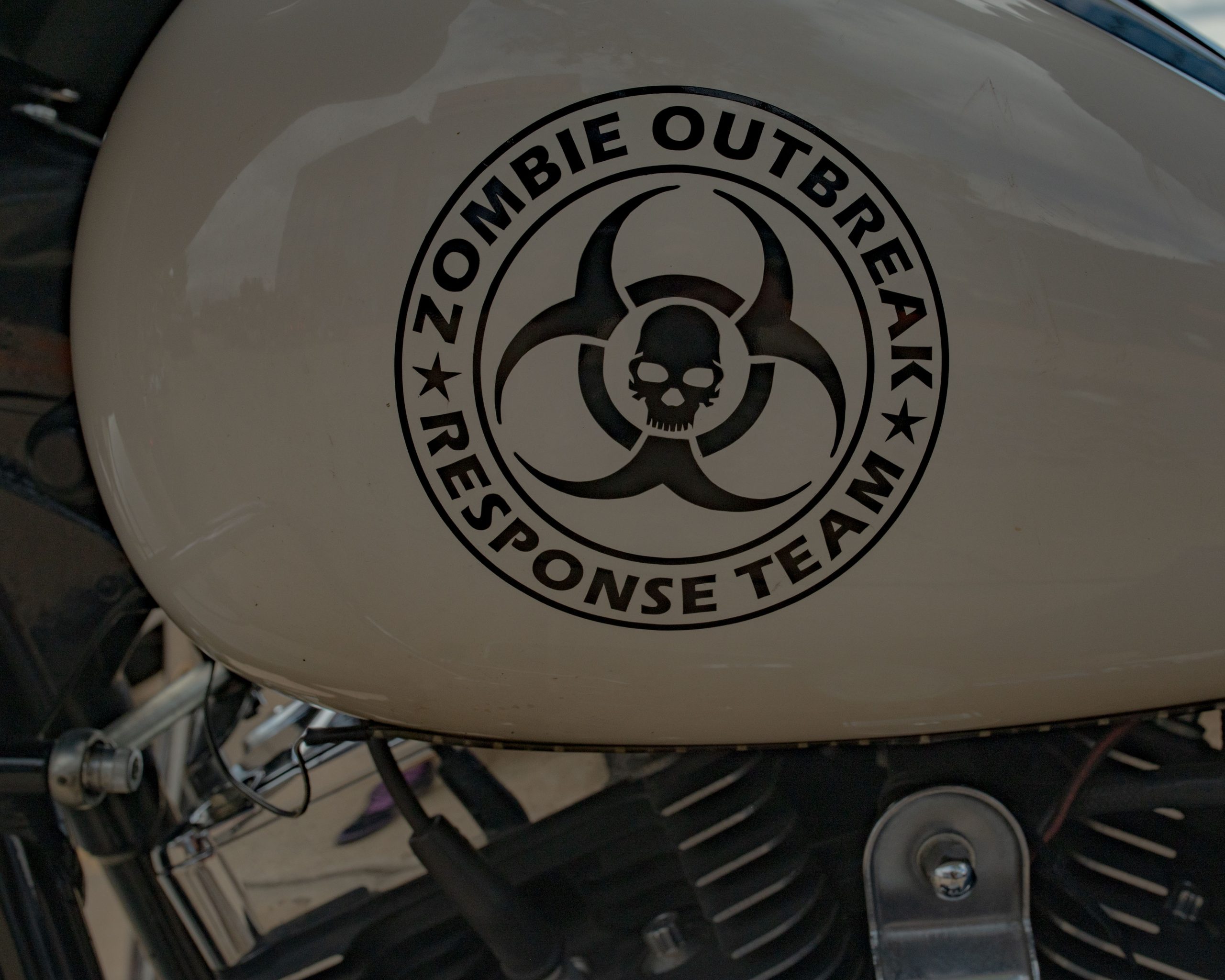 The gas tank on a motorcycle features a sticker that reads “Zombie outbreak response team” during Bikes on the Bricks in downtown Flint, Mich. on Saturday, Sept. 9, 2023. (Michael Indriolo | Flint Beat)
