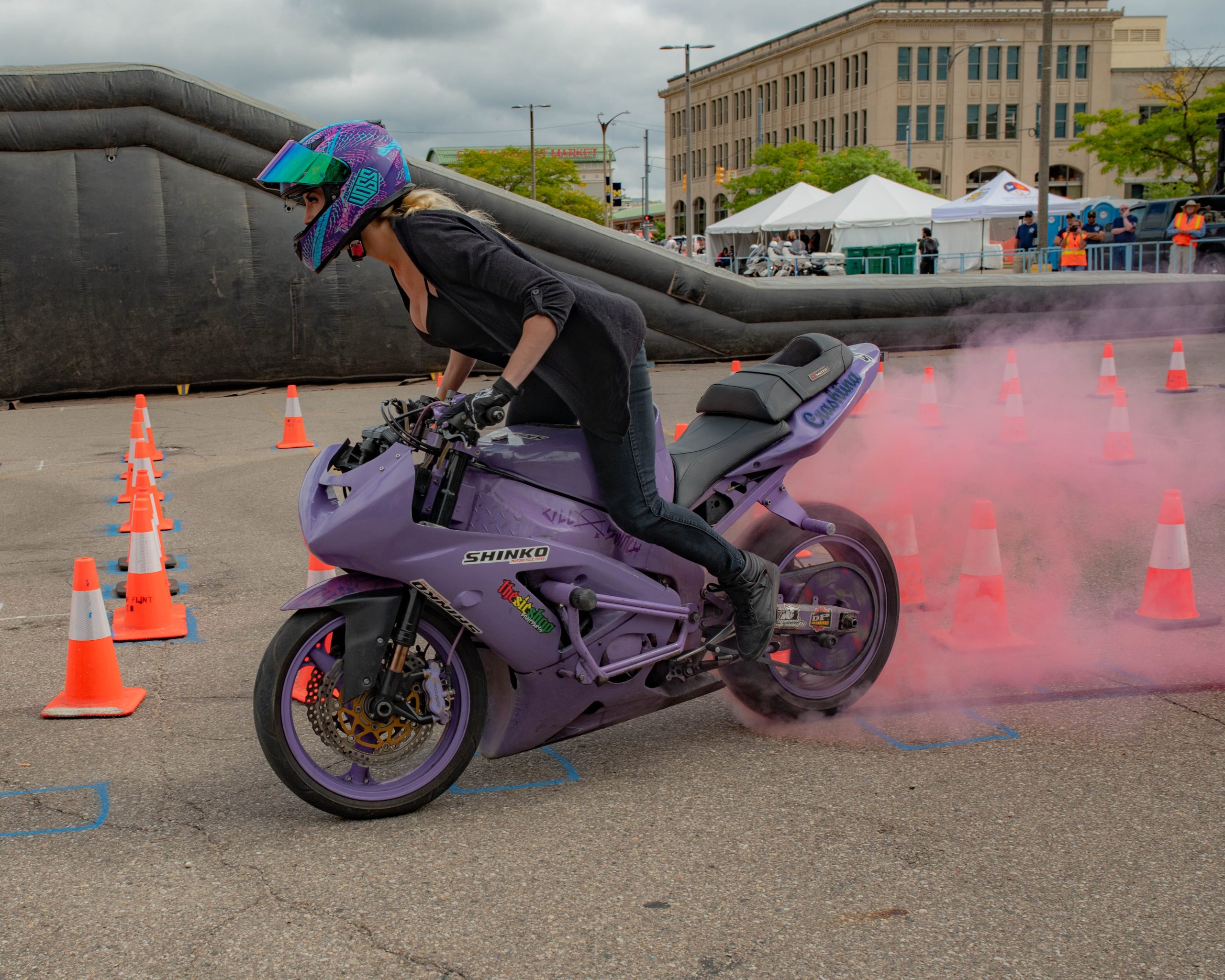 Christina Billings, also known as Crashtina, burns out during her stunt show at Bikes on the Bricks in downtown Flint, Mich. on Saturday, Sept. 9, 2023. (Michael Indriolo | Flint Beat)