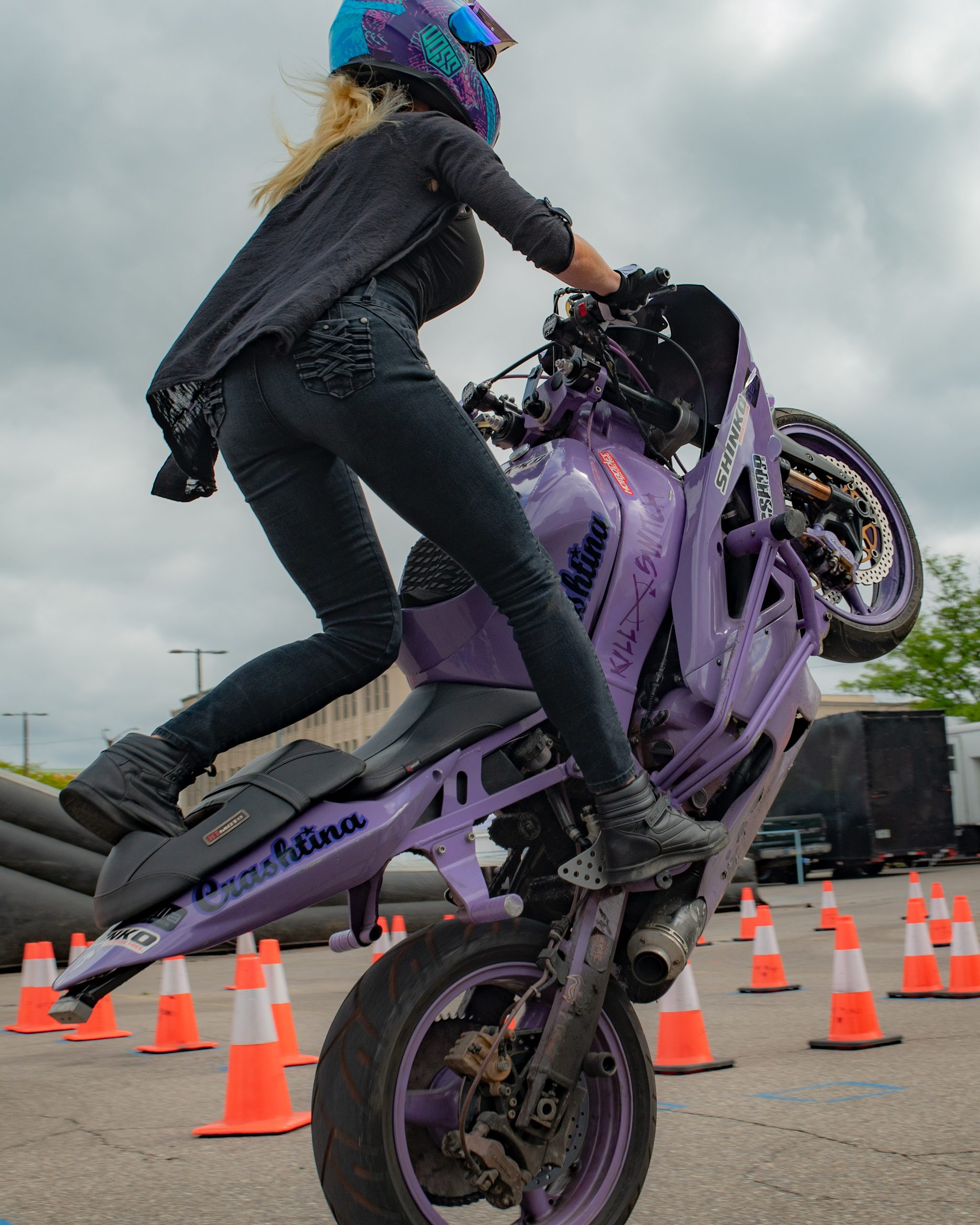 Christina Billings, also known as Crashtina, parks her bike in preparation for her stunt show at Bikes on the Bricks in downtown Flint, Mich. on Saturday, Sept. 9, 2023. (Michael Indriolo | Flint Beat)