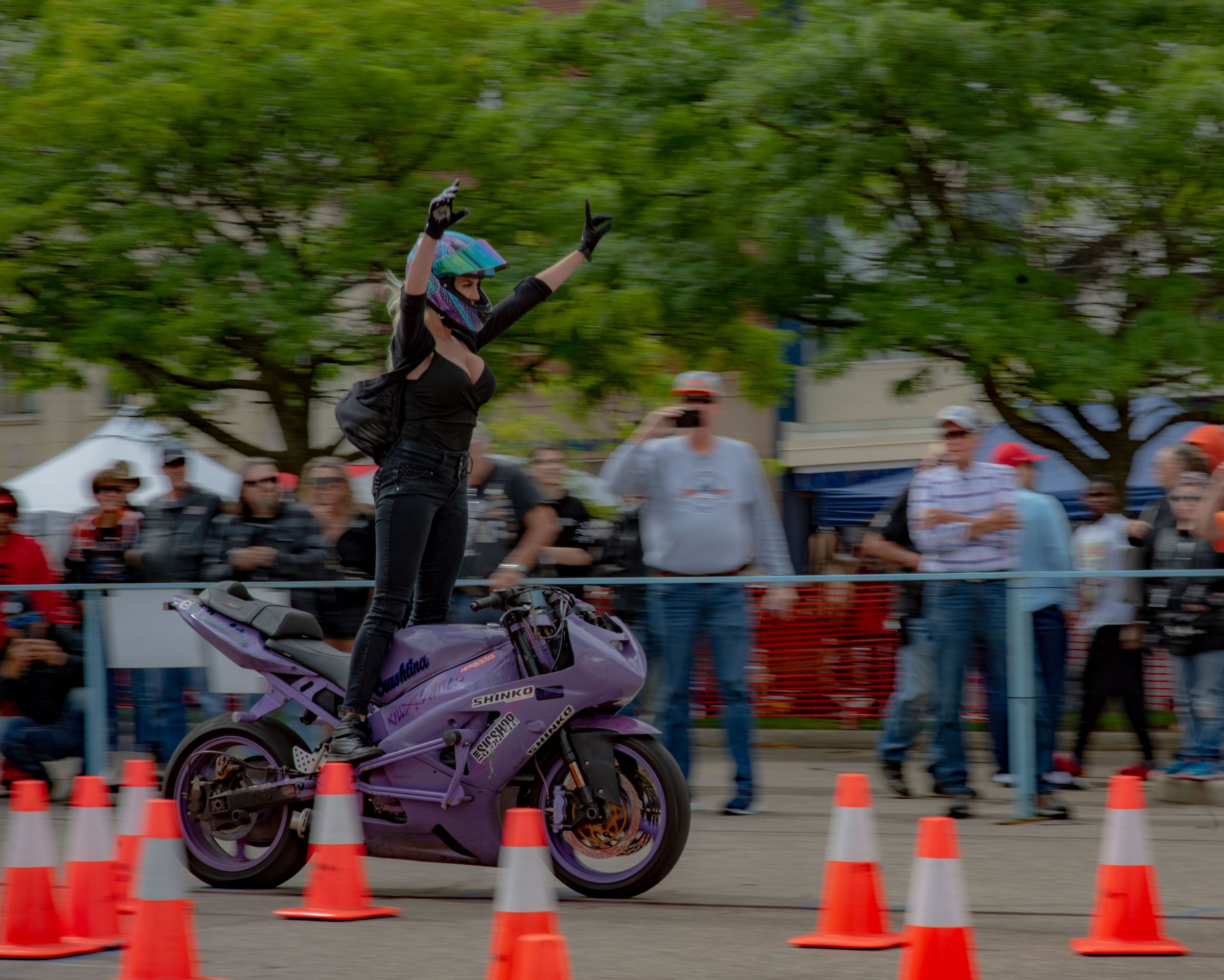 Christina Billings, also known as Crashtina, rides her motorcycle with no hands during her stunt show at Bikes on the Bricks in downtown Flint, Mich. on Saturday, Sept. 9, 2023. (Michael Indriolo | Flint Beat)