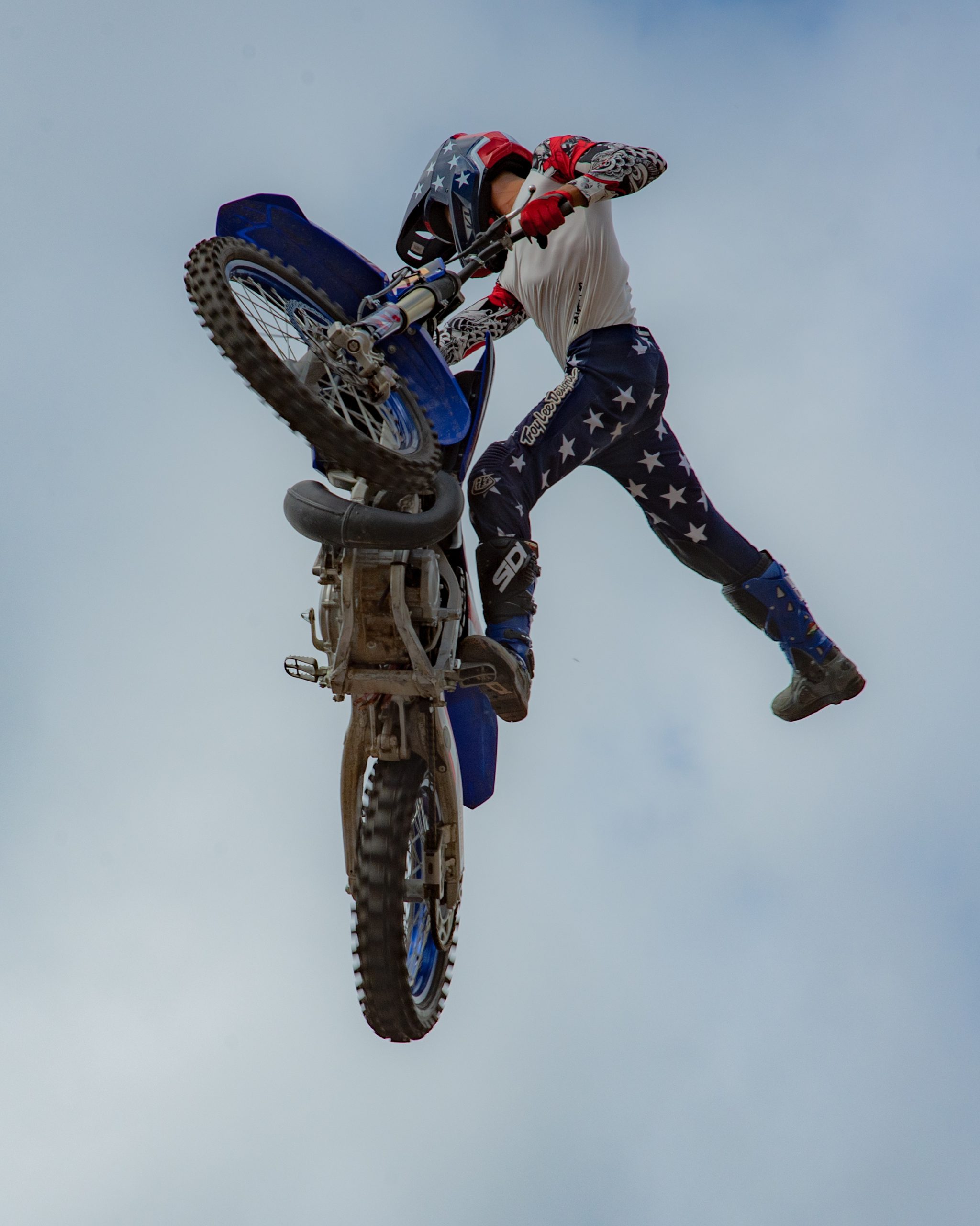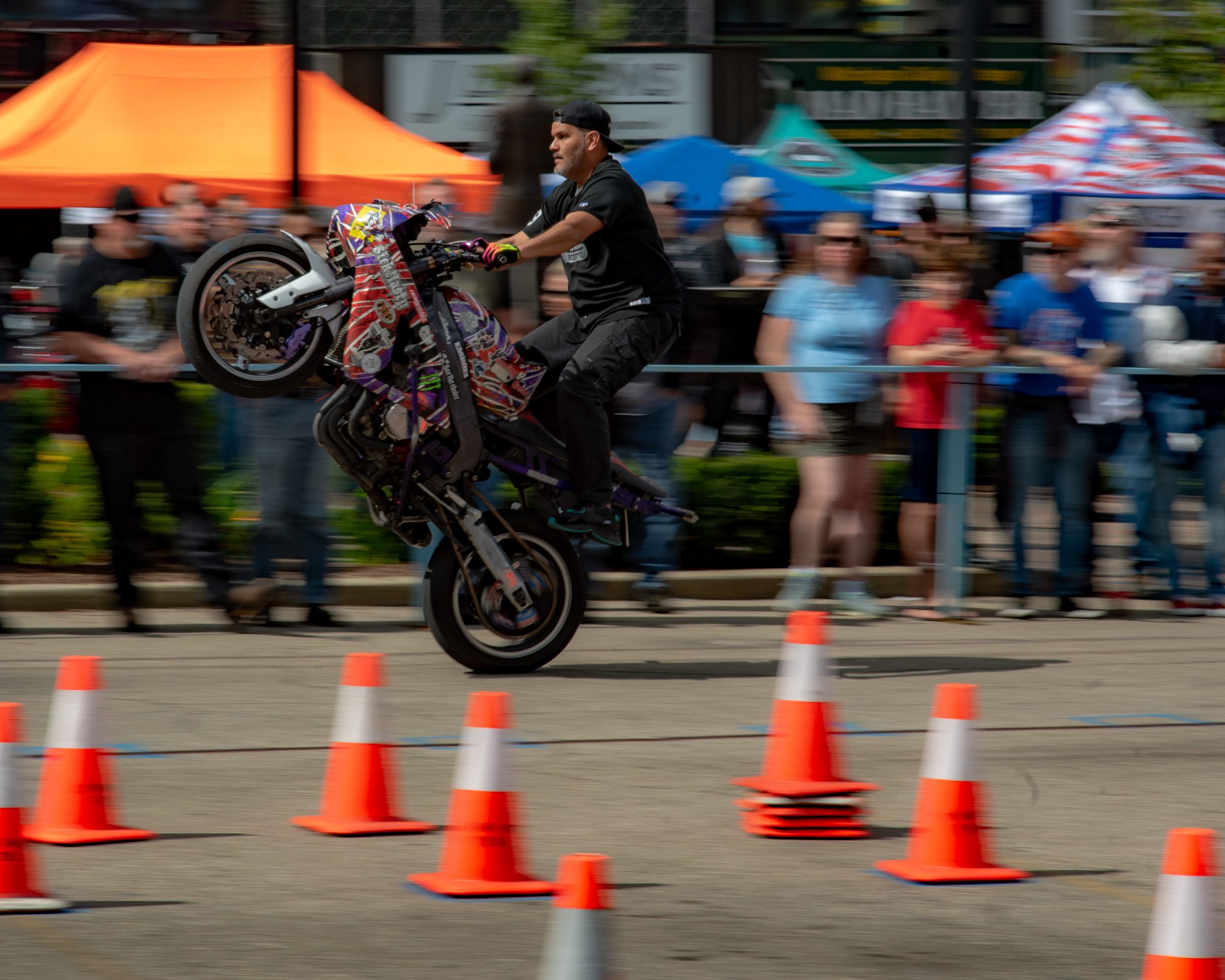 Ryan Laneer of Carolina Freestyle performs a stoppie during the Crashtina stunt show at Bikes on the Bricks in downtown Flint, Mich. on Saturday, Sept. 9, 2023. (Michael Indriolo | Flint Beat)