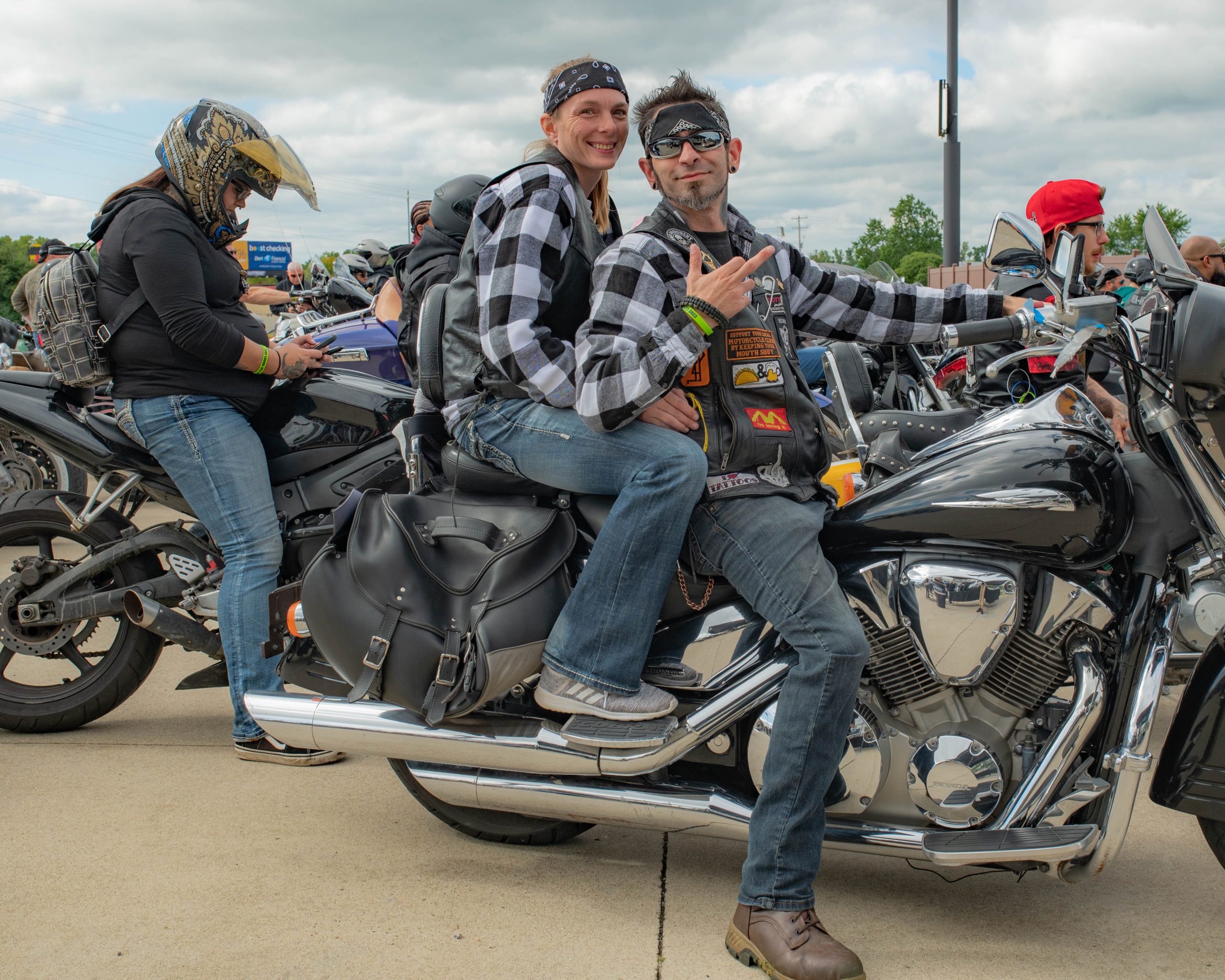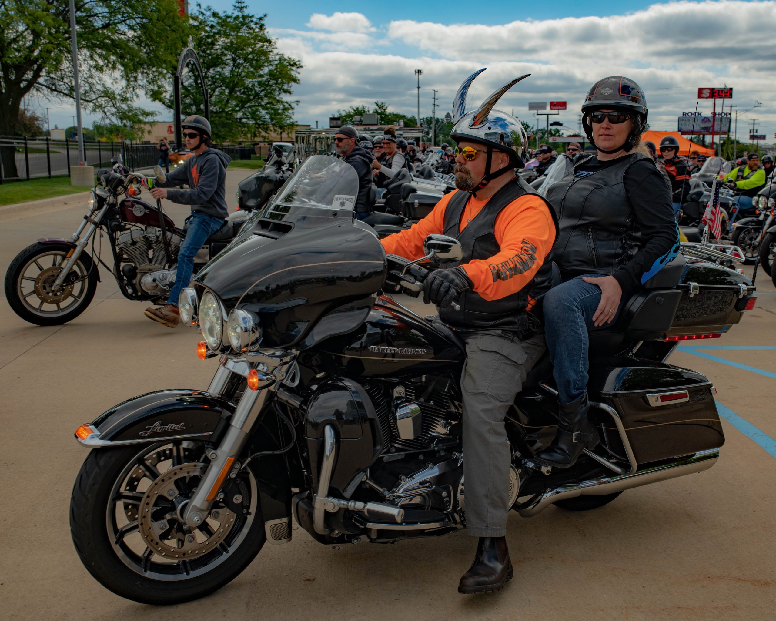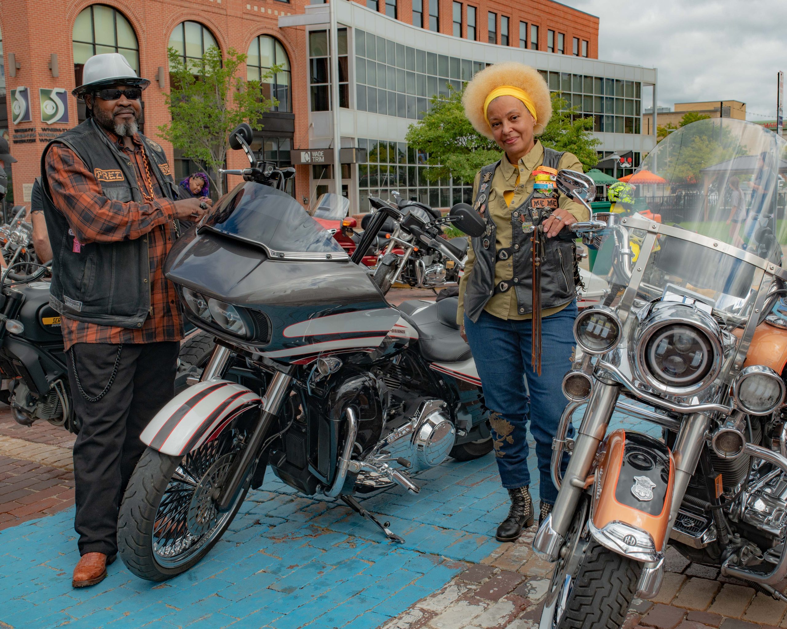 Adam “Taco” Perez and Heather Carsten pose for a picture on their bike at the Vehicle City Harley-Davidson as they prepare to roll out on a police-escorted to Bikes on the Bricks in downtown Flint, Mich. on Saturday, Sept. 9, 2023. (Michael Indriolo | Flint Beat)