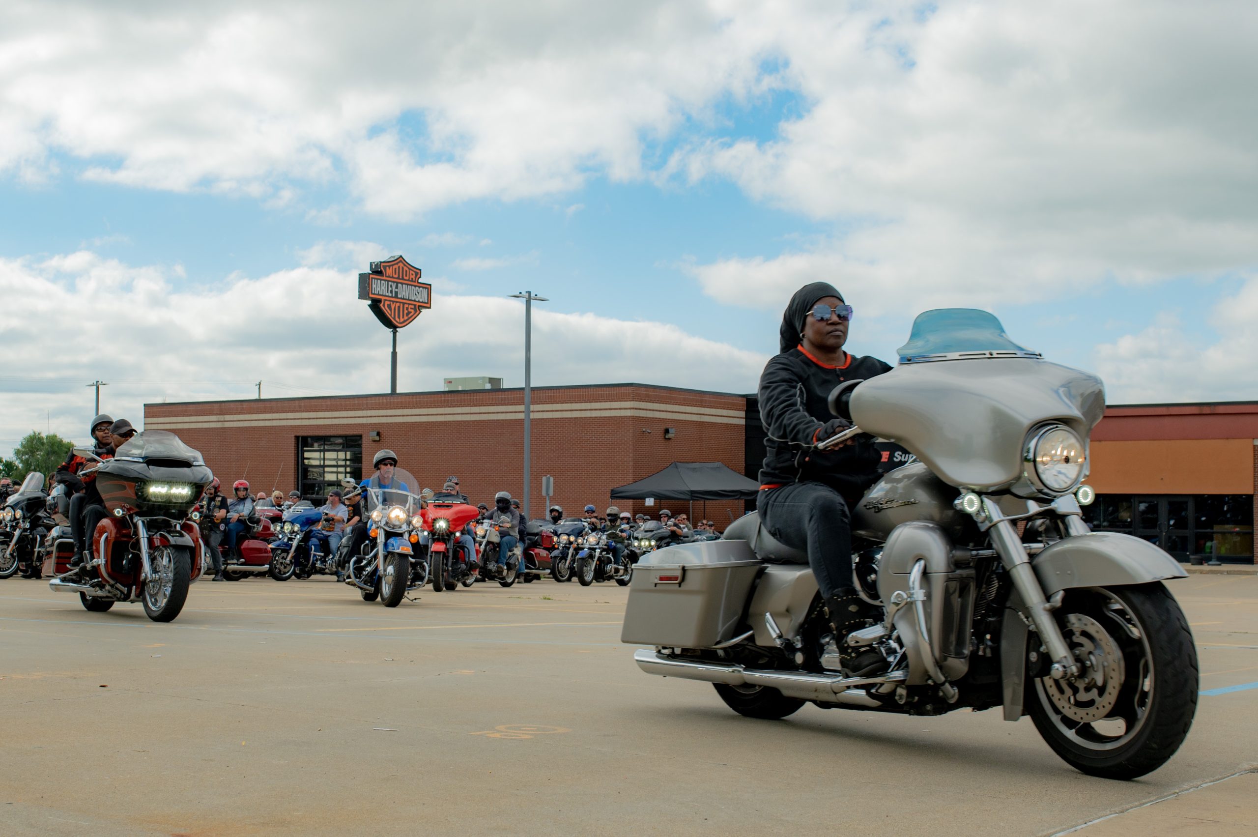 Motorcyclists at the Vehicle City Harley-Davidson prepare to roll out on a police-escorted to Bikes on the Bricks in downtown Flint, Mich. on Saturday, Sept. 9, 2023. (Michael Indriolo | Flint Beat)