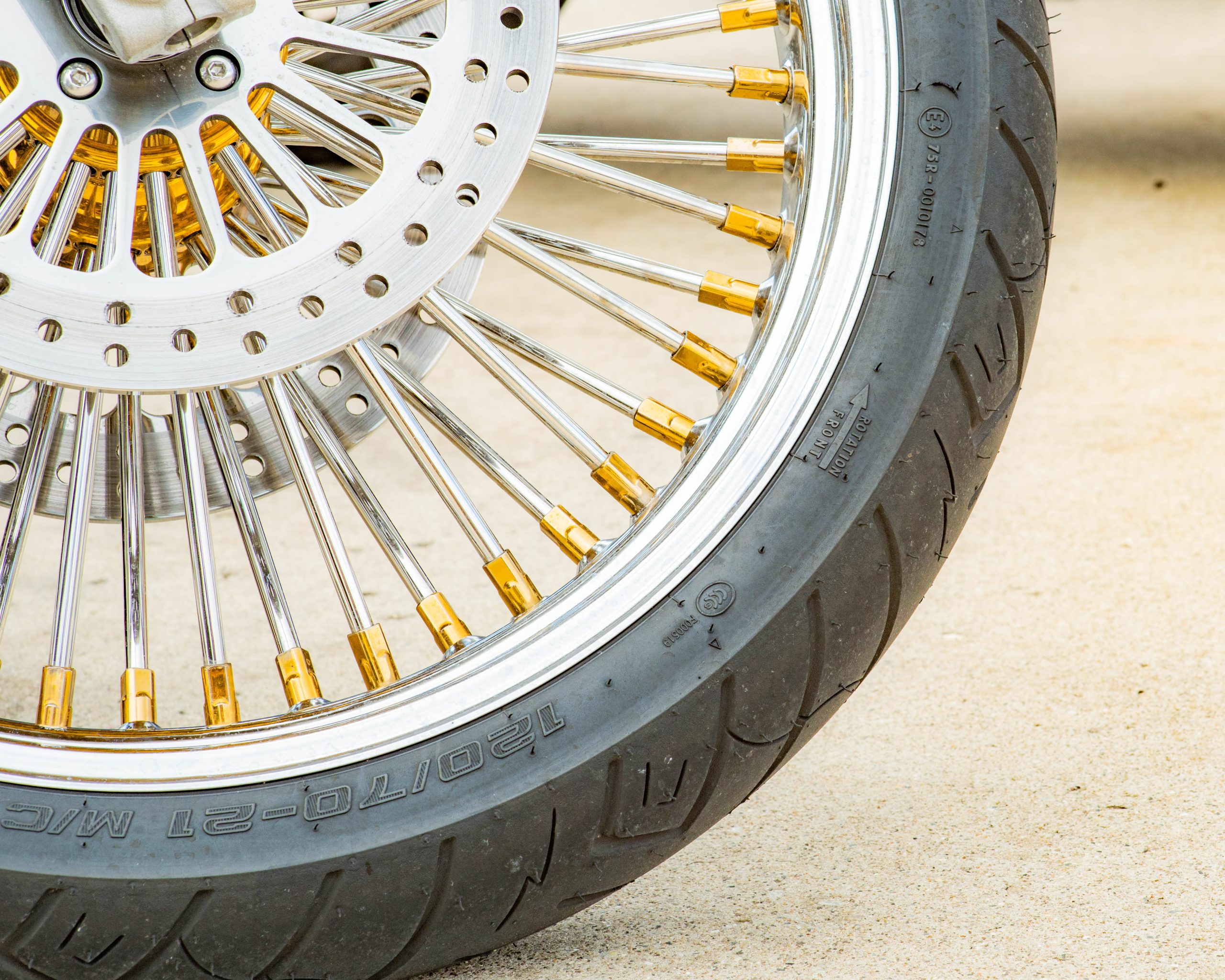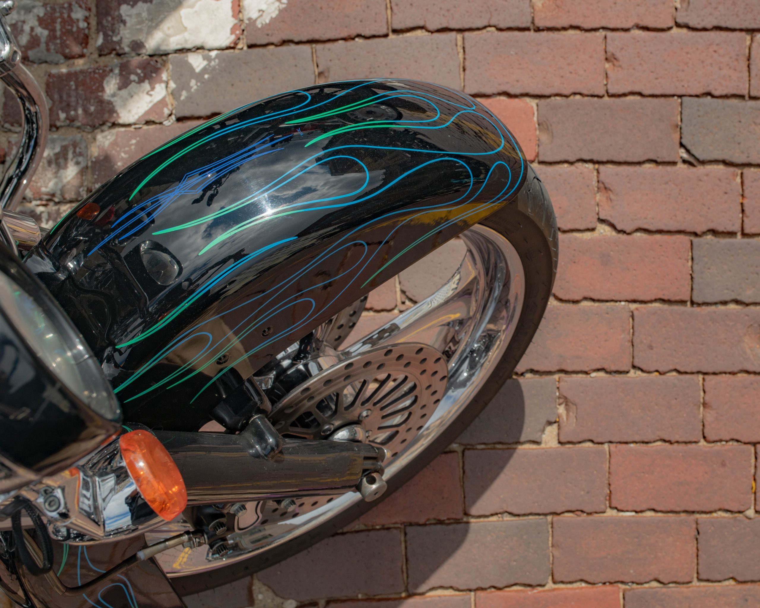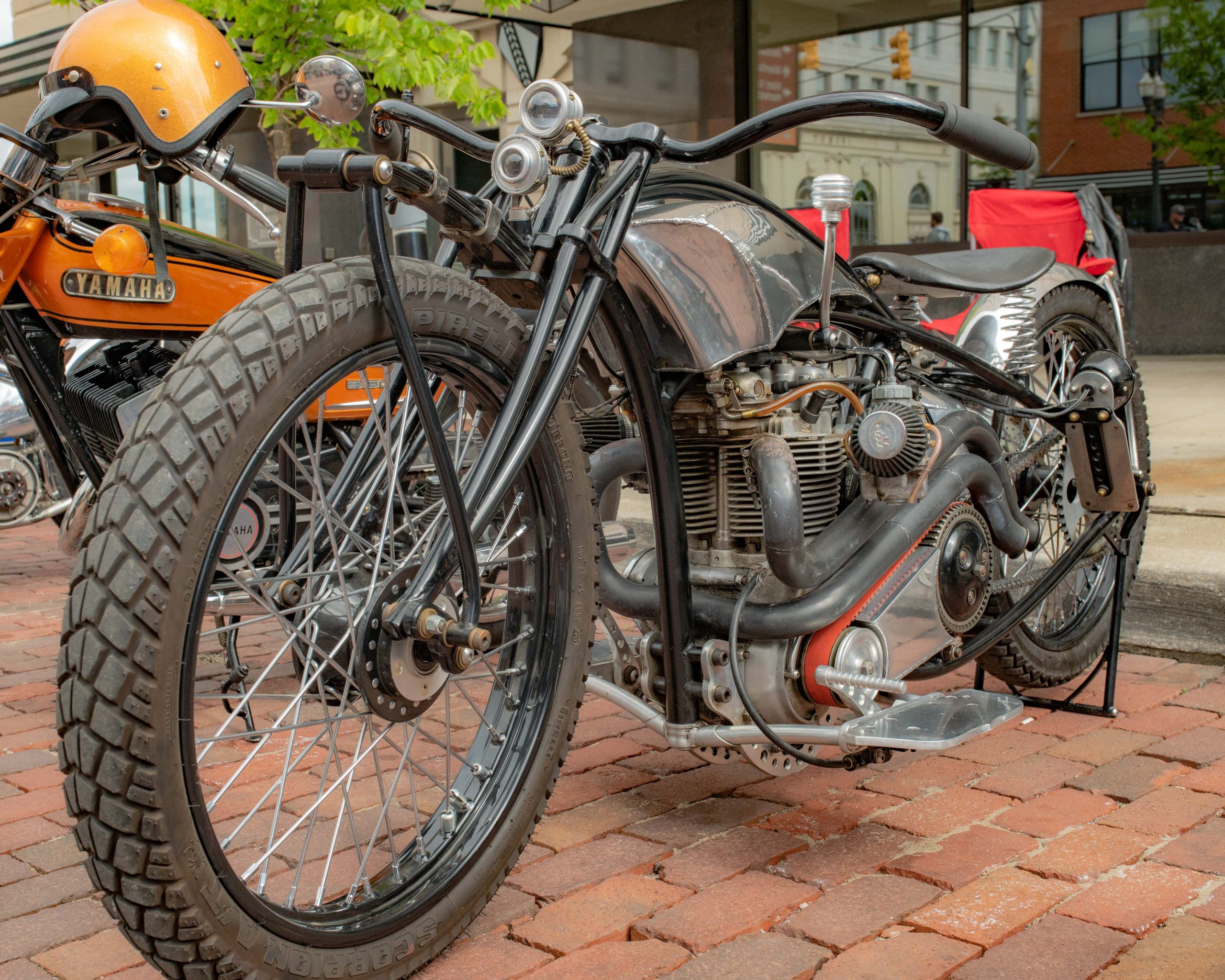 A motorcycle custom built by Patrick Knight, of Knight Cycle Works, is parked on Saginaw Street during Bikes on the Bricks in downtown Flint, Mich. on Saturday, Sept. 9, 2023. (Michael Indriolo | Flint Beat)