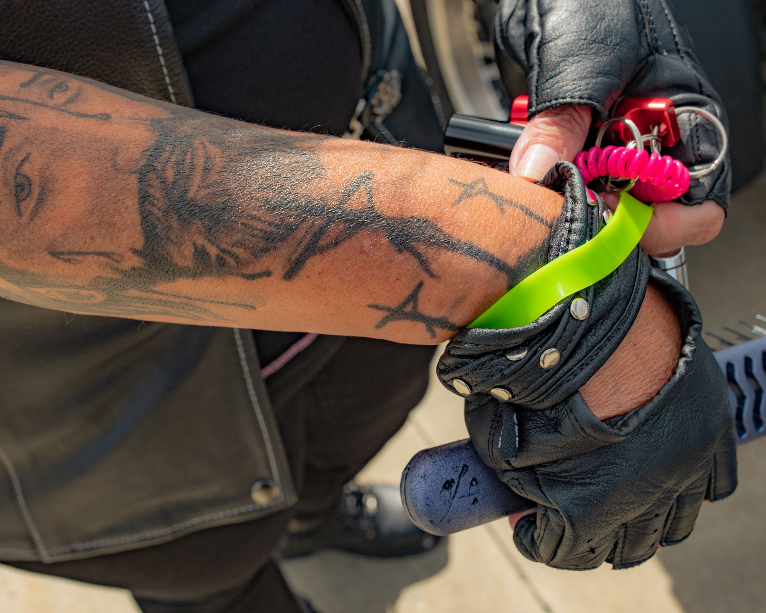 Sherry Riddle shows her tattoo of three crosses, which matches a painting on her motorcycle, at the Vehicle City Harley-Davidson as she prepares to roll out on a police-escorted to Bikes on the Bricks in downtown Flint, Mich. on Saturday, Sept. 9, 2023. (Michael Indriolo | Flint Beat)