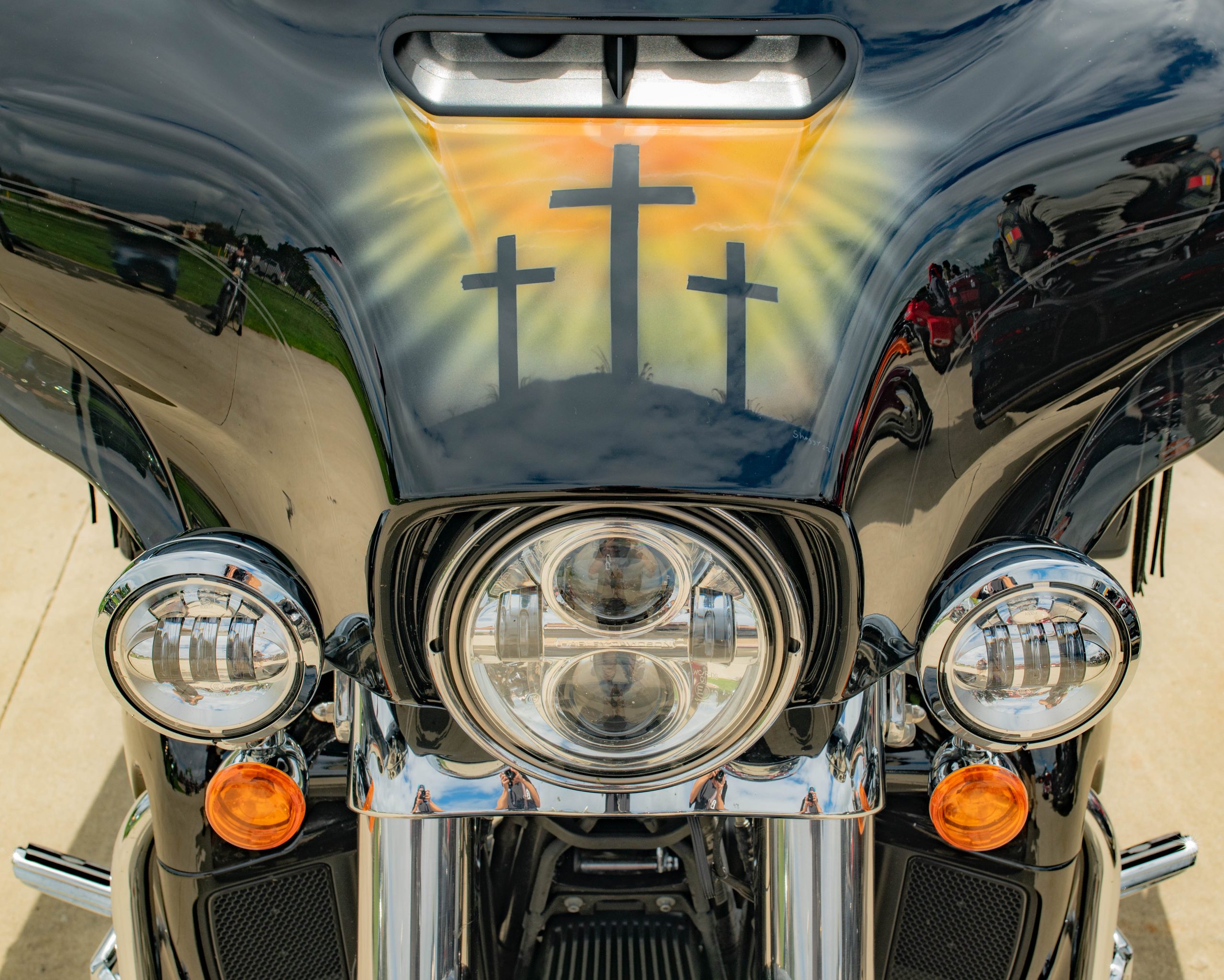 Sherry Riddle parks her motorcycle, which features a painting of three crosses on the front, at the Vehicle City Harley-Davidson as she prepares to roll out on a police-escorted to Bikes on the Bricks in downtown Flint, Mich. on Saturday, Sept. 9, 2023. (Michael Indriolo | Flint Beat)