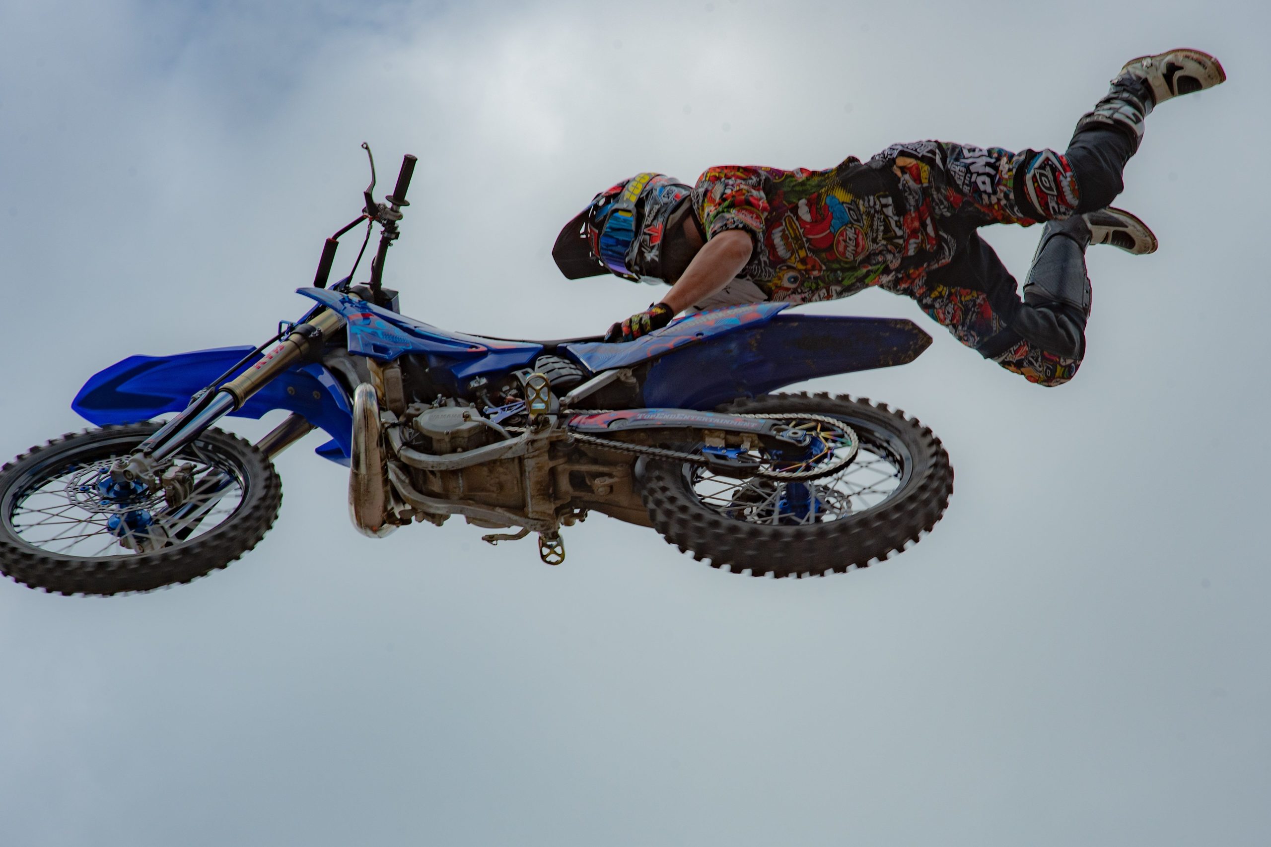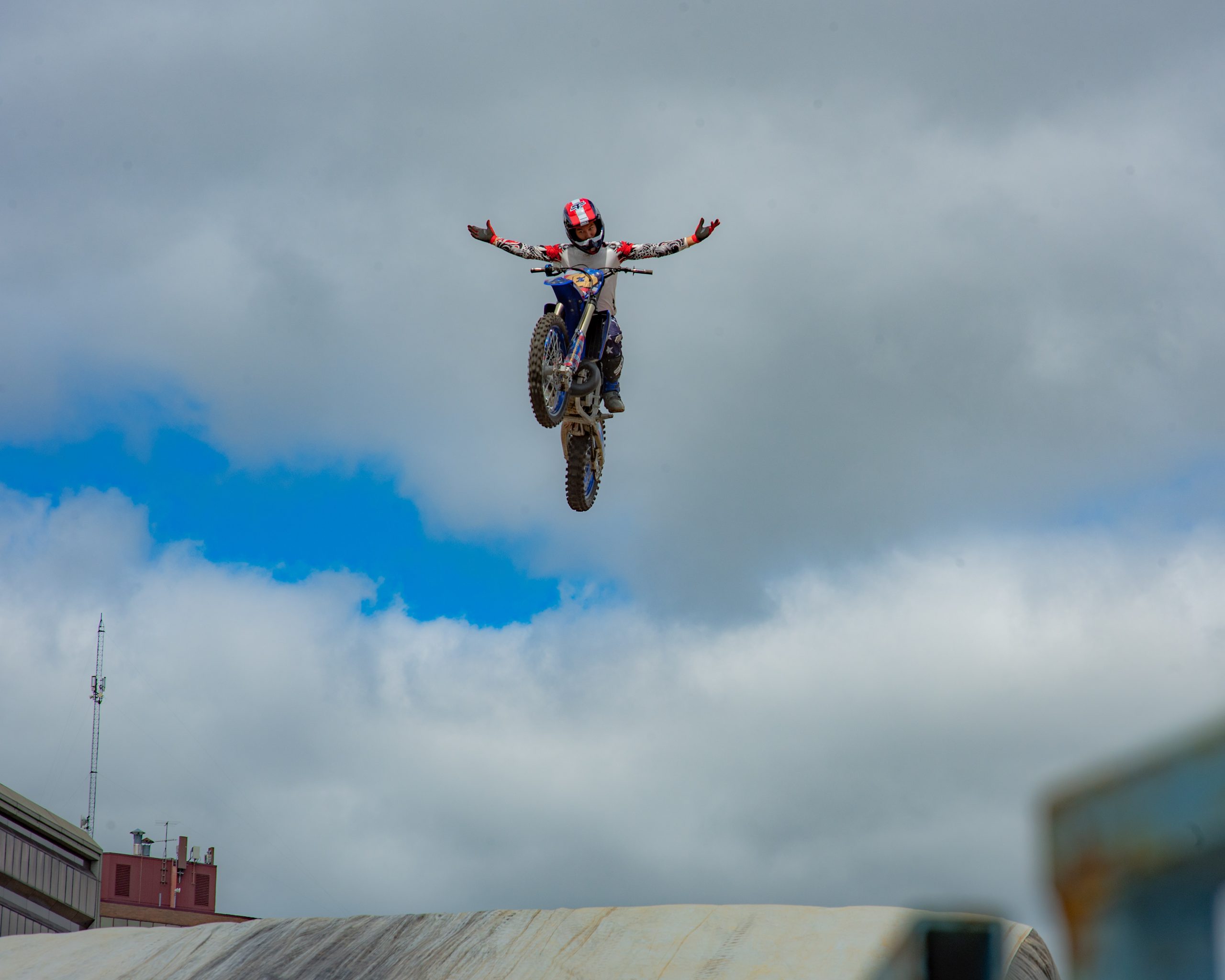 Dare devils perform aerial stunts during Bikes on the Bricks in downtown Flint, Mich. on Saturday, Sept. 9, 2023. (Michael Indriolo | Flint Beat)