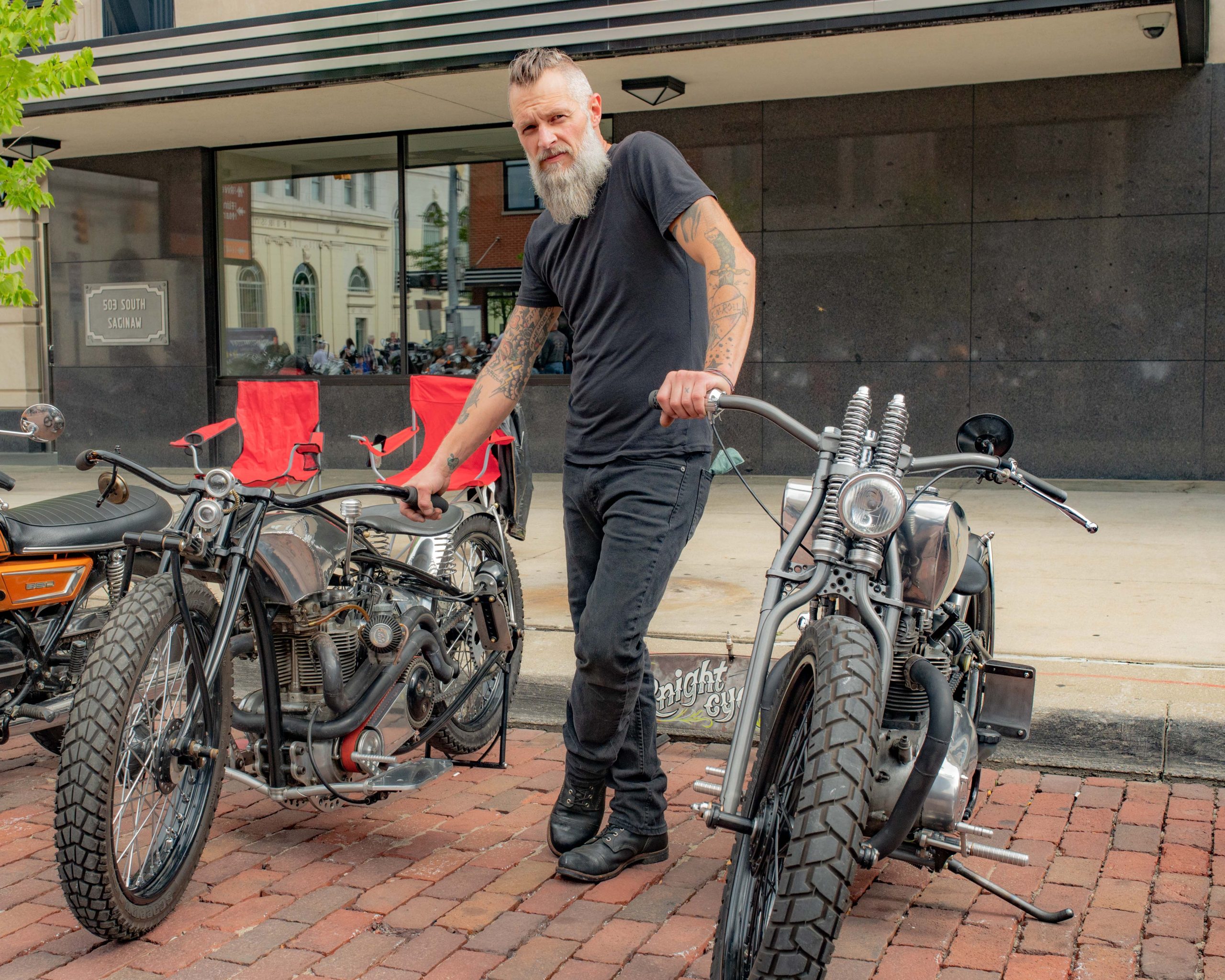 A fake skeleton wears beer goggles during Bikes on the Bricks in downtown Flint, Mich. on Saturday, Sept. 9, 2023. (Michael Indriolo | Flint Beat)Motorcyclists roll down Saginaw Street during Bikes on the Bricks in downtown Flint, Mich. on Saturday, Sept. 9, 2023. (Michael Indriolo | Flint Beat)Patrick Knight, of Knight Cycle Works, poses for a picture with two motorcycles he custom built during Bikes on the Bricks in downtown Flint, Mich. on Saturday, Sept. 9, 2023. (Michael Indriolo | Flint Beat)