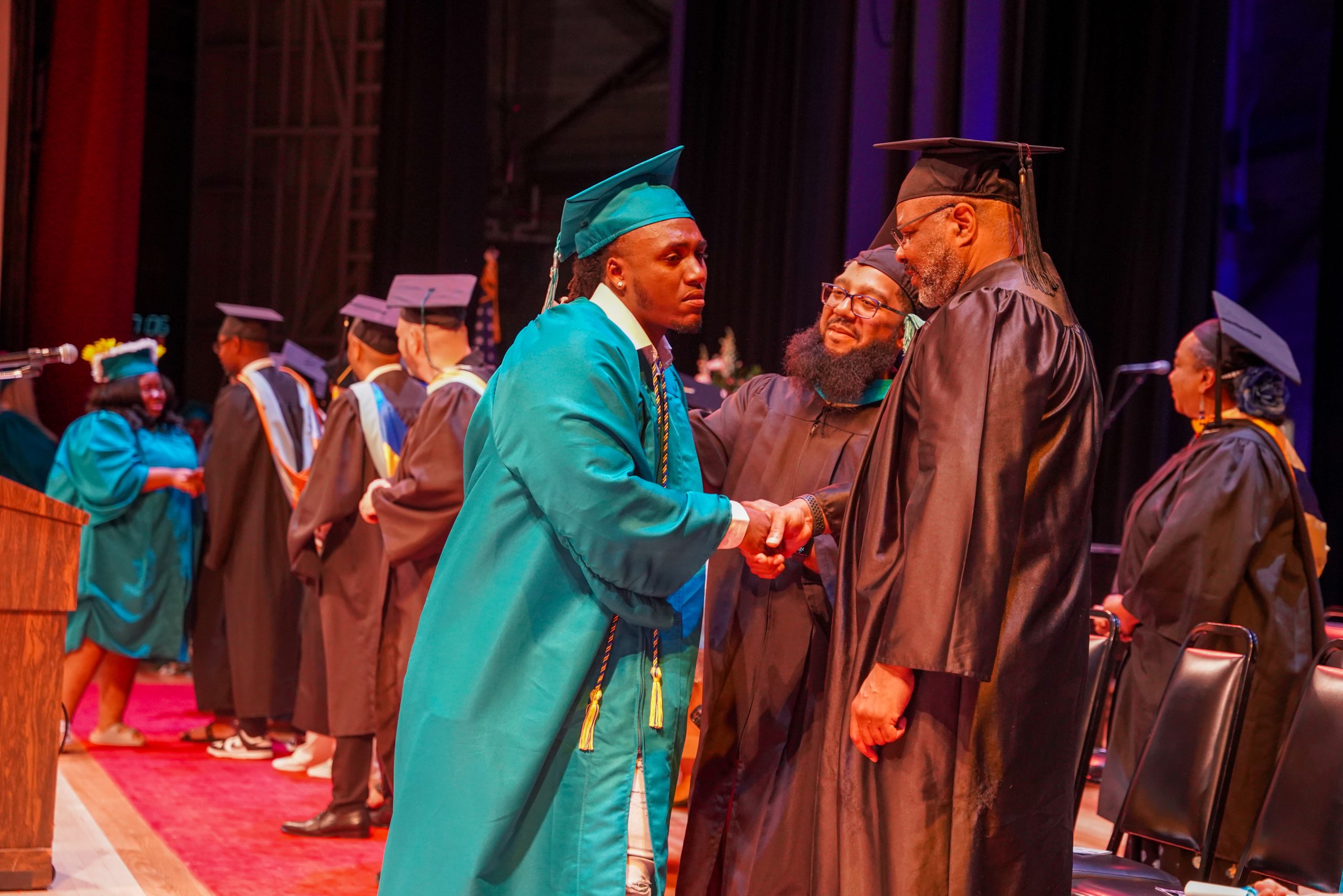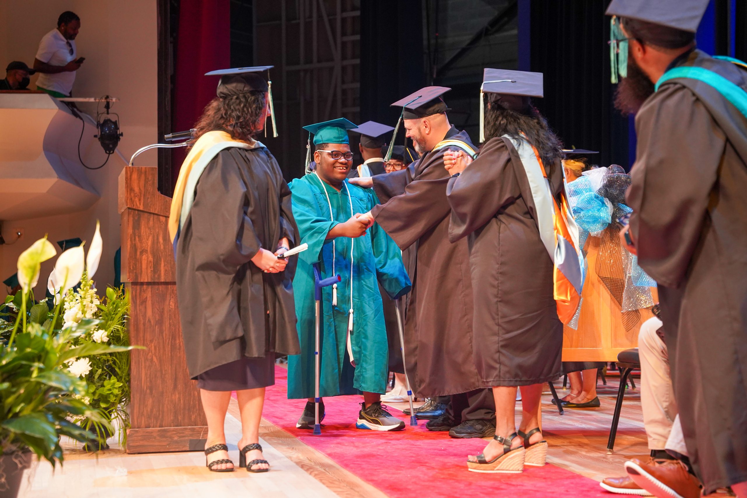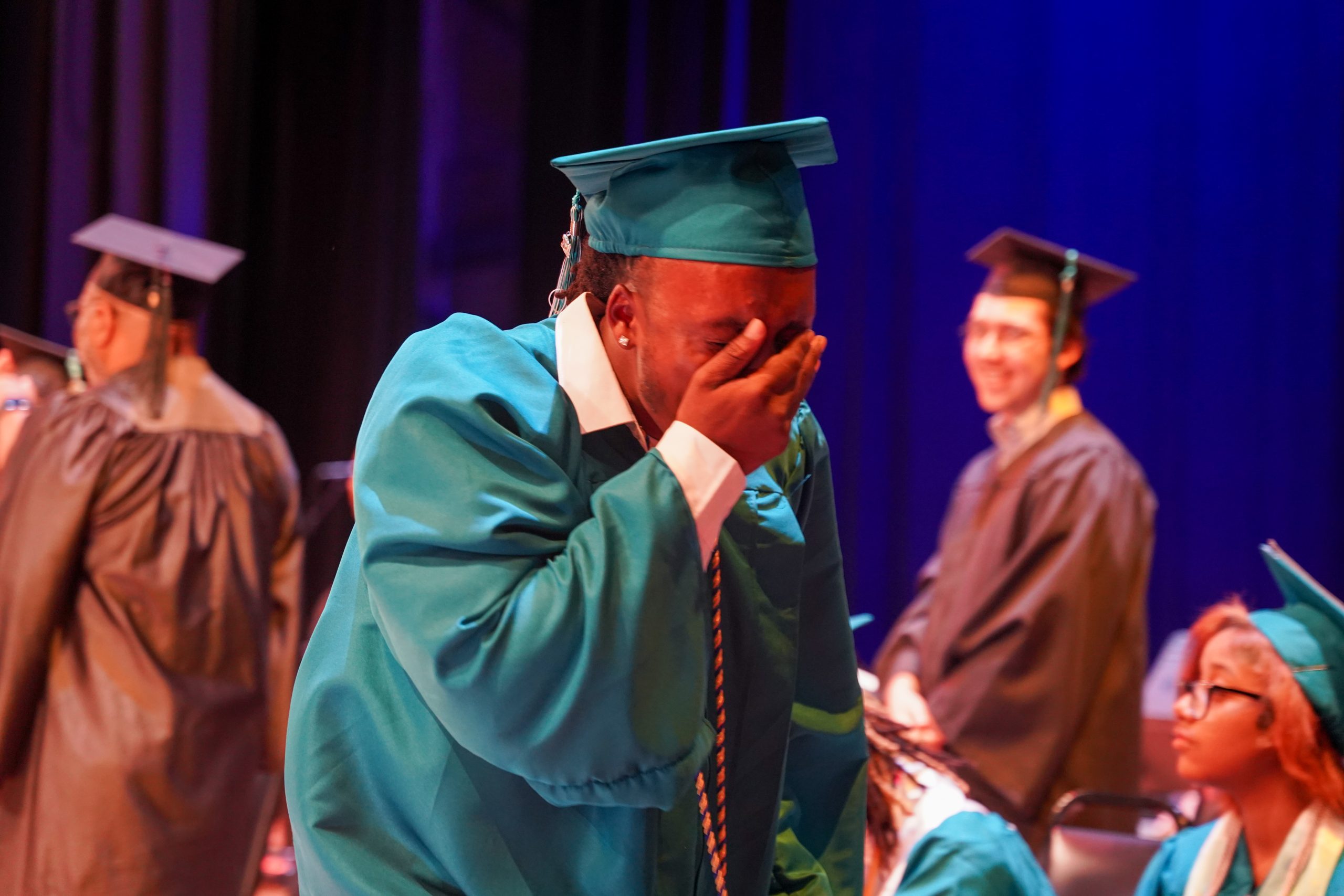 Quentin Edwards walks across the stage during the Flint Community Schools graduation ceremony at the Whiting Auditorium in Flint, Mich. on Tuesday, June 4, 2024. (Joshua Johnson| Flint Beat)