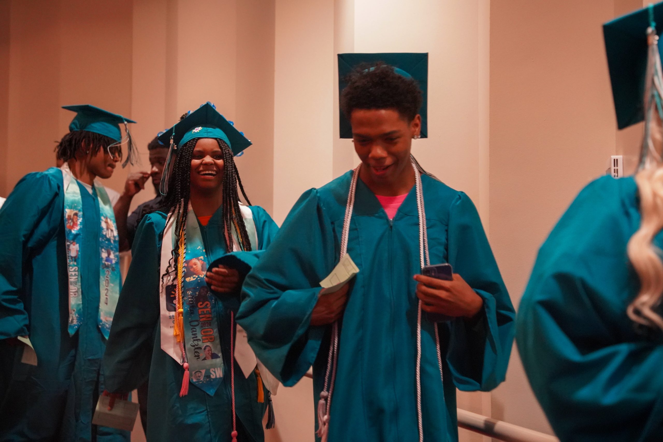 Kayla Dantzler and Jay’Querion Daniel make their way to the stage during the Flint Community Schools graduation ceremony at the Whiting Auditorium in Flint, Mich. on Tuesday, June 4, 2024. (Joshua Johnson| Flint Beat)