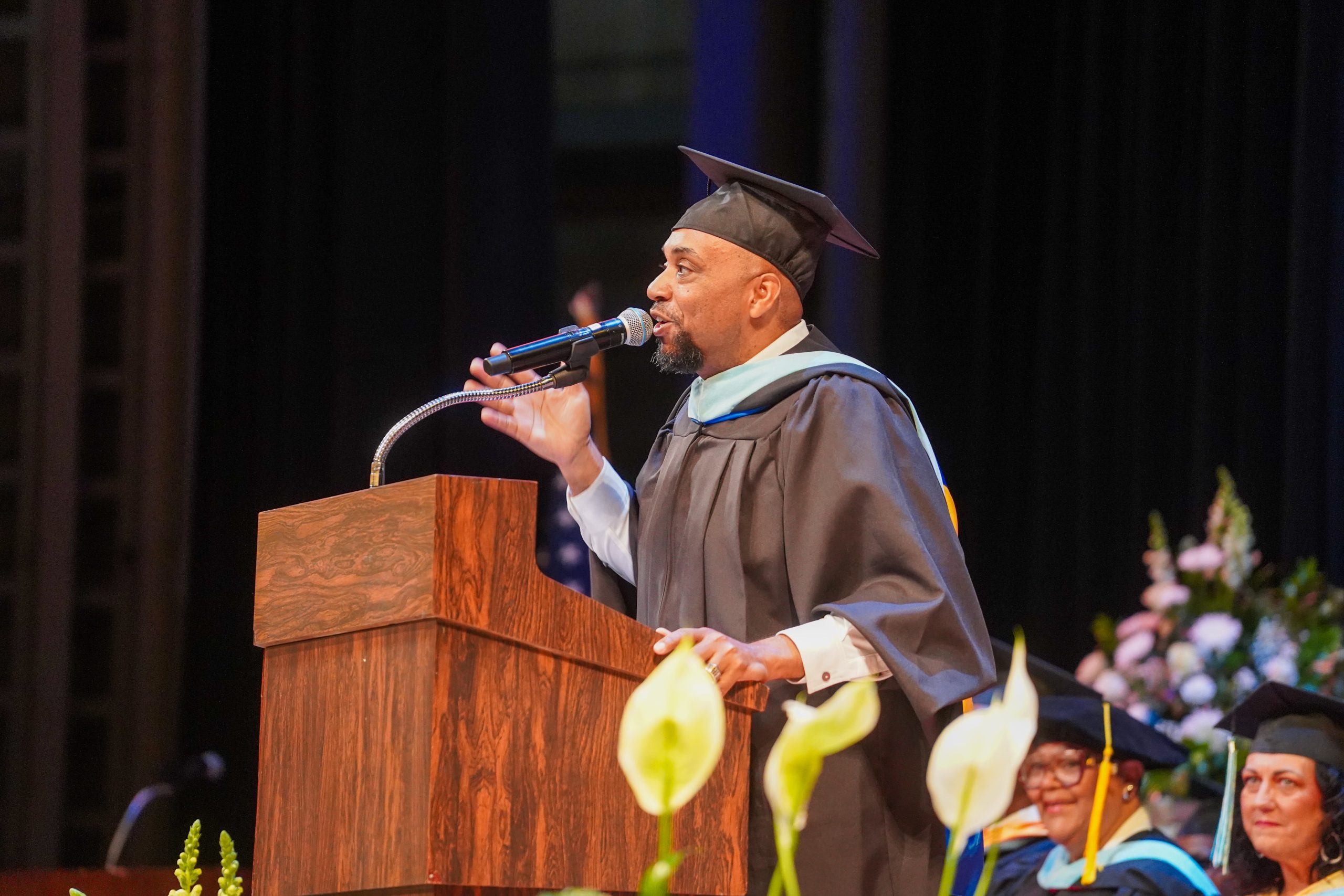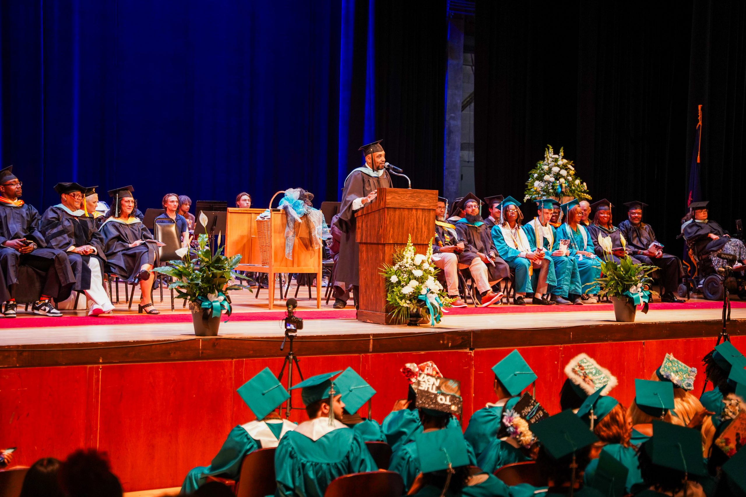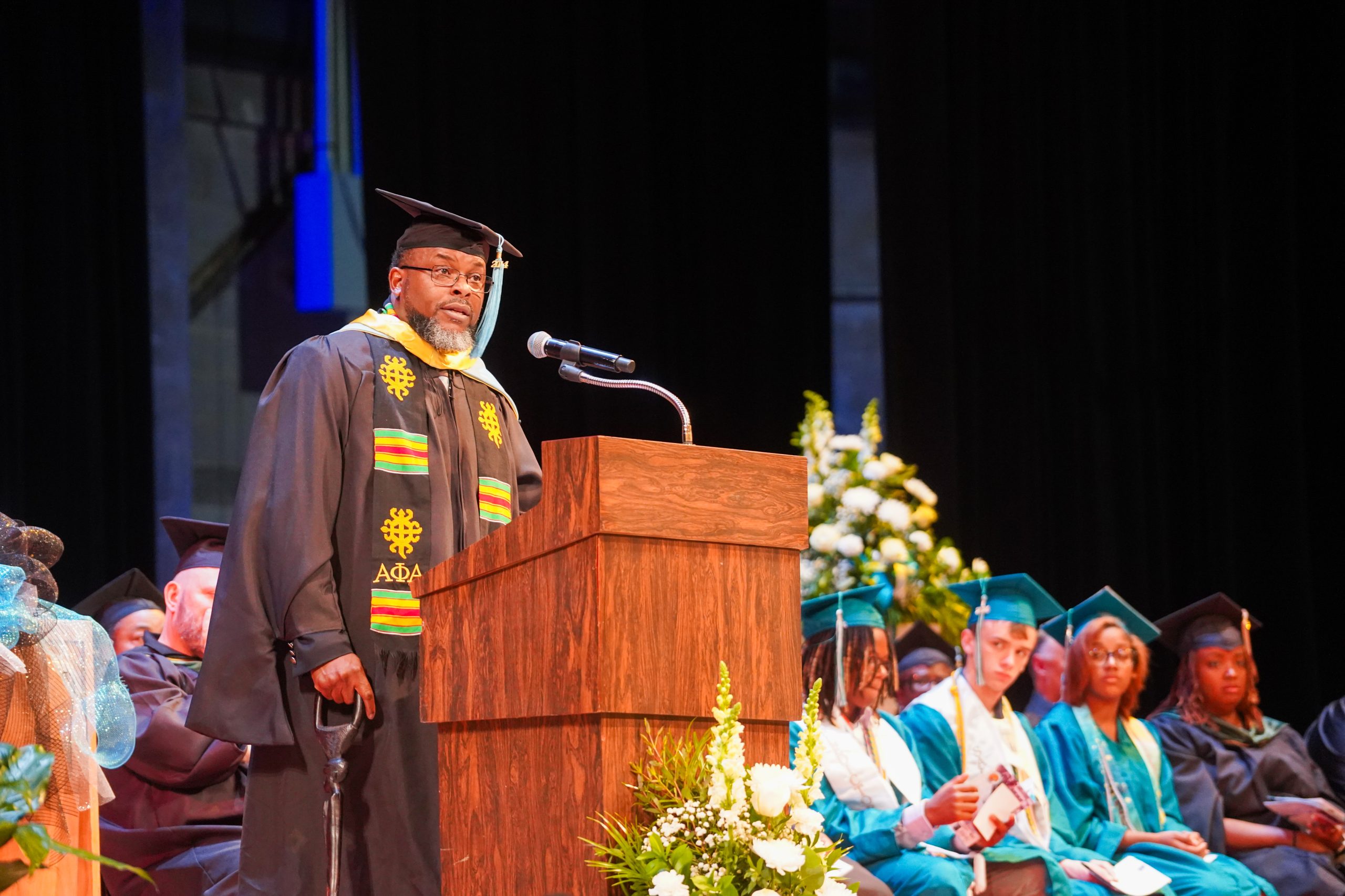 Flint Community Schools Superintendent Kevelin Jones speaks to high school graduates during the Flint Community Schools graduation ceremony at the Whiting Auditorium in Flint, Mich. on Tuesday, June 4, 2024. (Joshua Johnson| Flint Beat)