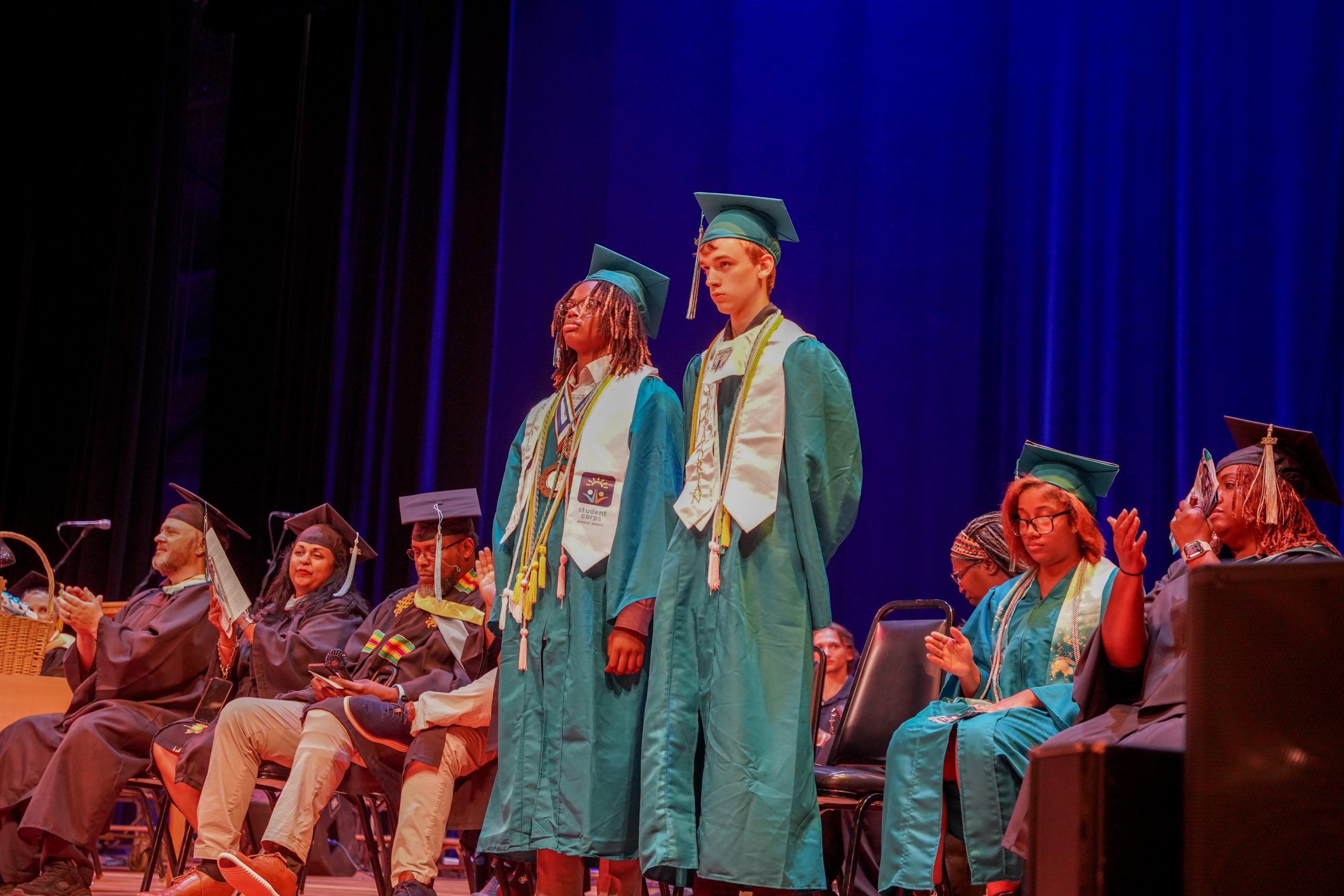 Valedictorian Micaiah Brown and Salutatorian John Lynch both stand and receive praise during the Flint Community Schools graduation ceremony at the Whiting Auditorium in Flint, Mich. on Tuesday, June 4, 2023. (Joshua Johnson| Flint Beat)