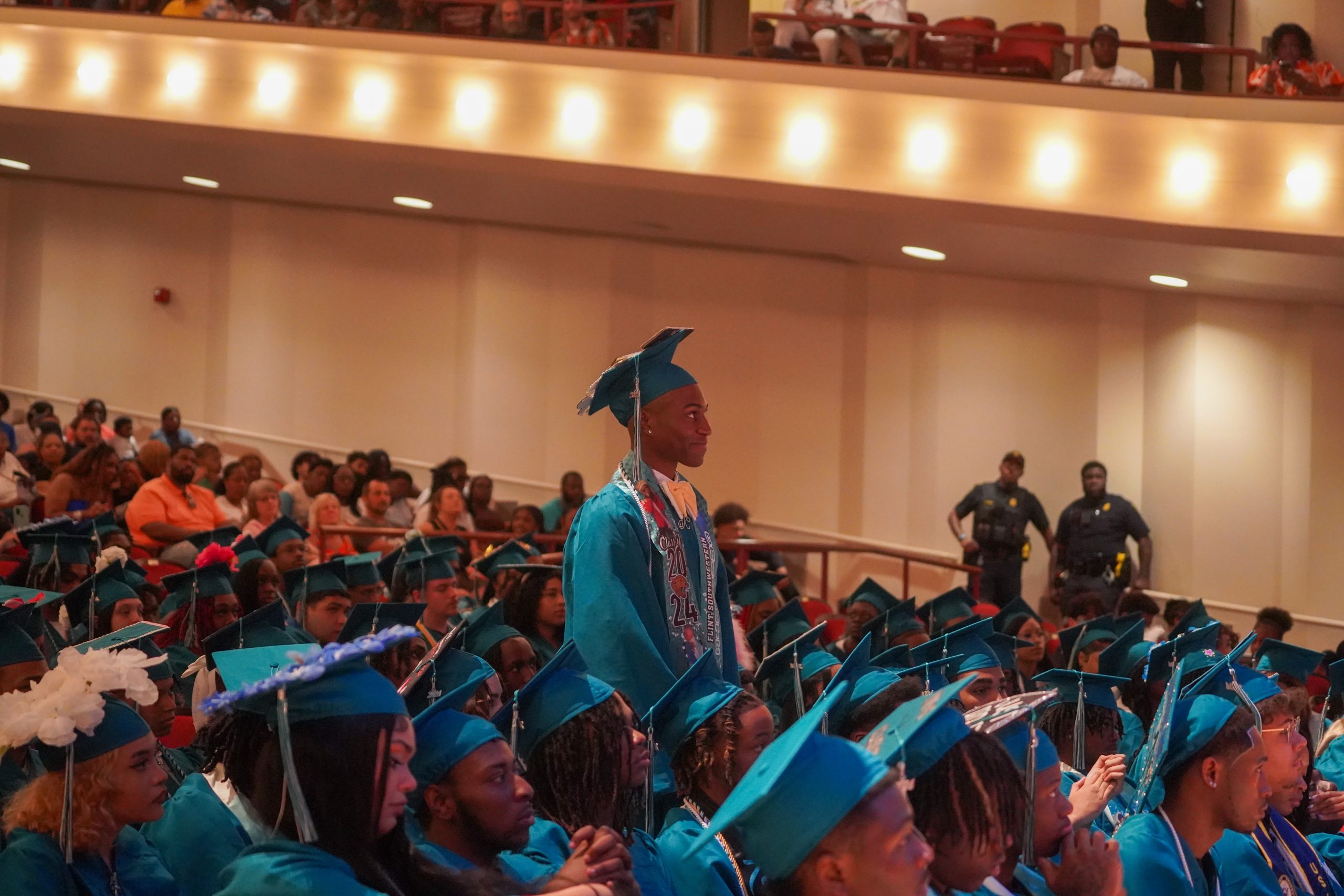 Kameron Hearod receiving recognition amongst pears during the Flint Community Schools graduation ceremony at the Whiting Auditorium in Flint, Mich. on Tuesday, June 4, 2024. (Joshua Johnson| Flint Beat)