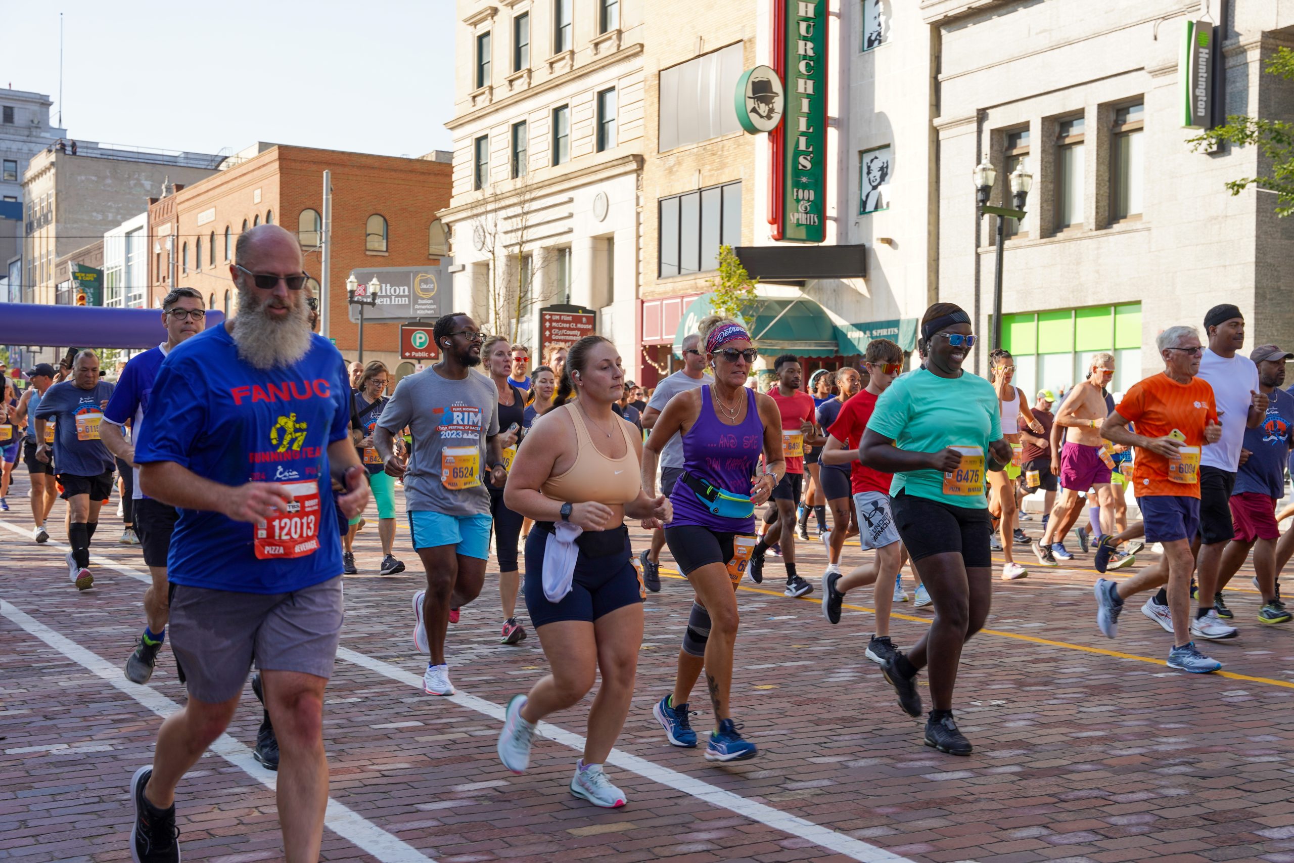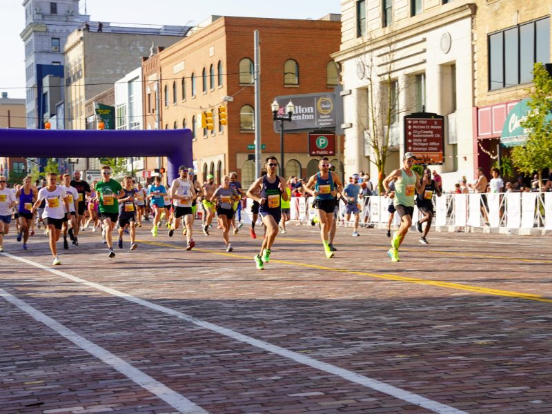 Racers take off from the starting line during the 47th annual HAP Crim Festival of Races in downtown Flint, Michigan on Saturday, Aug. 25, 2024. (Joshua Johnson