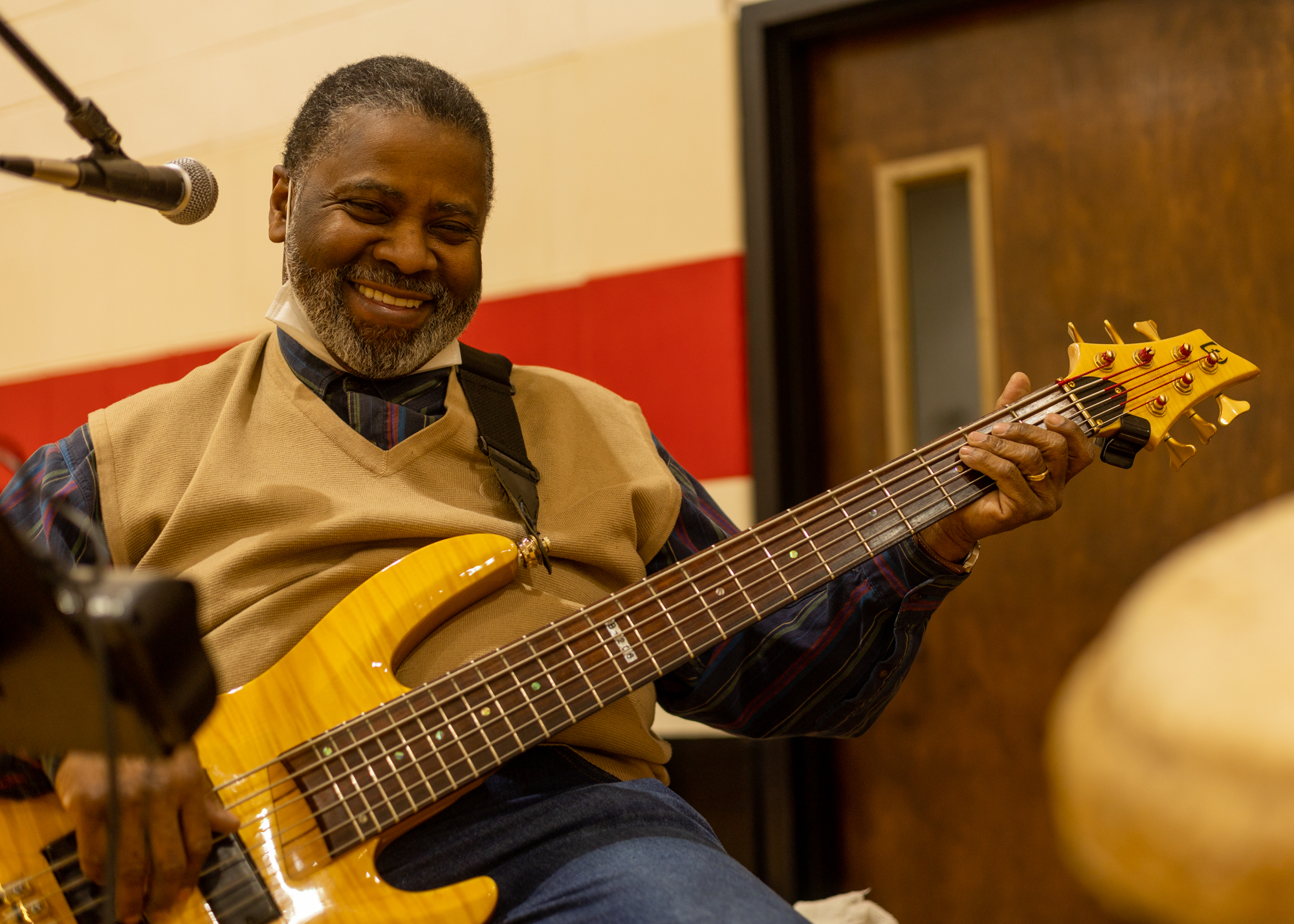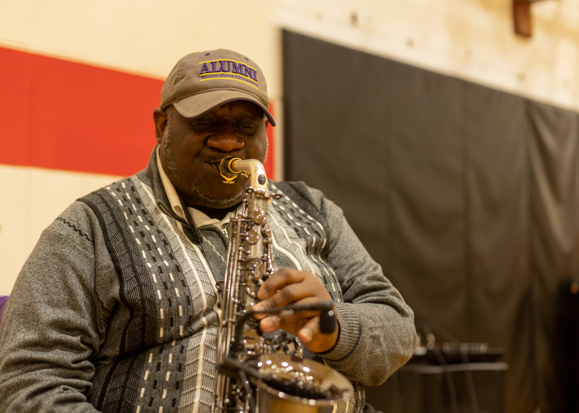 Before going out to Blackstones to celebrate his 7th wedding anniversary, Flint resident Phil Young, 71, joins his friends to play jazz at the Celebrating Black History at the Y event in downtown Flint, Mich. on Feb. 25, 2022. (KT Kanazawich