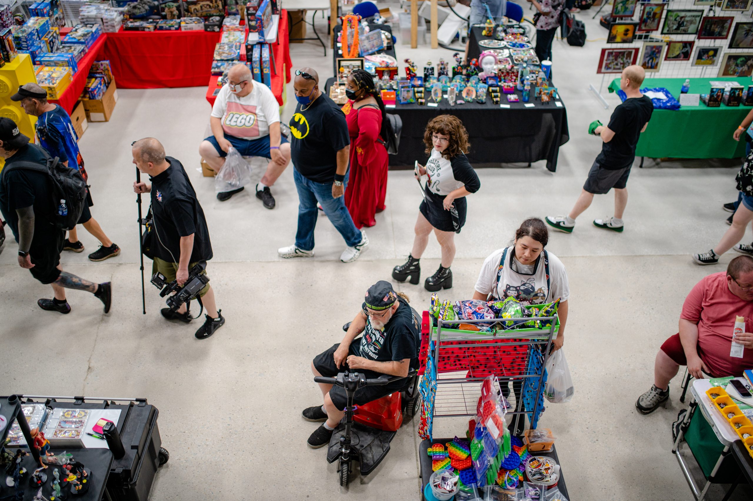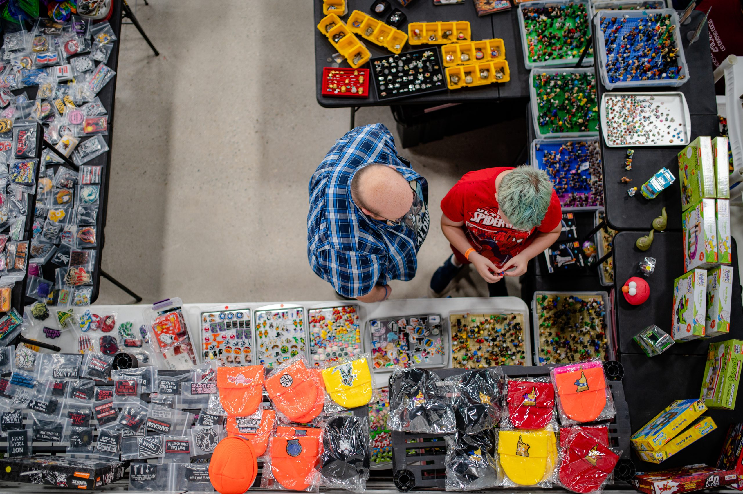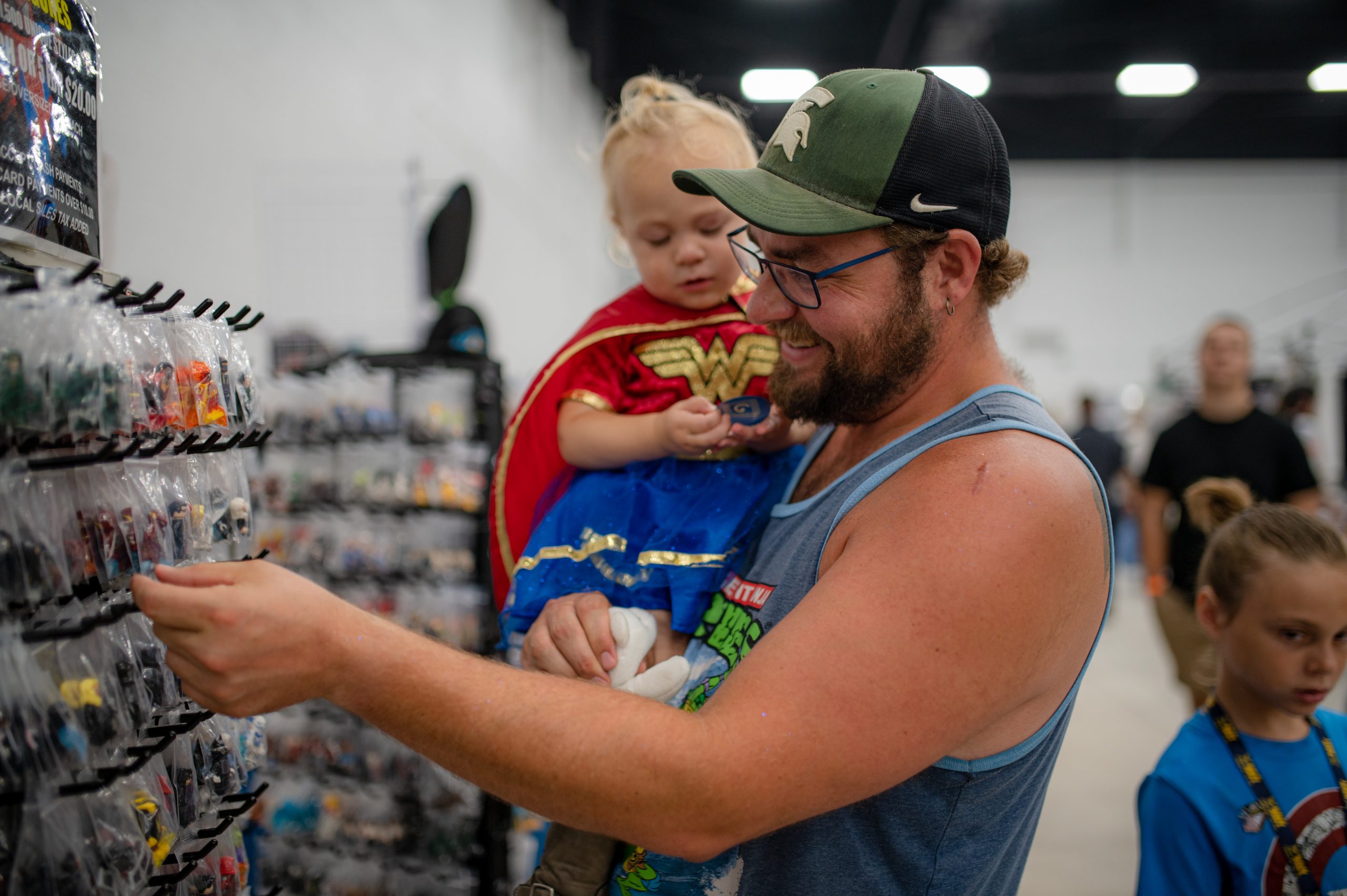 Jess Whelan, dressed as Boo from the movie “Monsters, Inc.,” walks through vendor booths with Jordan Moore, dressed as Sully from same movie, during Really Cool Comic Con at the Dort Financial Center in Flint, Mich. on August 6, 2022. Randy Reynolds, not pictured, created the costumes. (Michael Indriolo | Flint Beat)Jesse Burcar and Chris Burcar shop for Lego minifigures during Really Cool Comic Con at the Dort Financial Center in Flint, Mich. on August 6, 2022. (Michael Indriolo | Flint Beat)