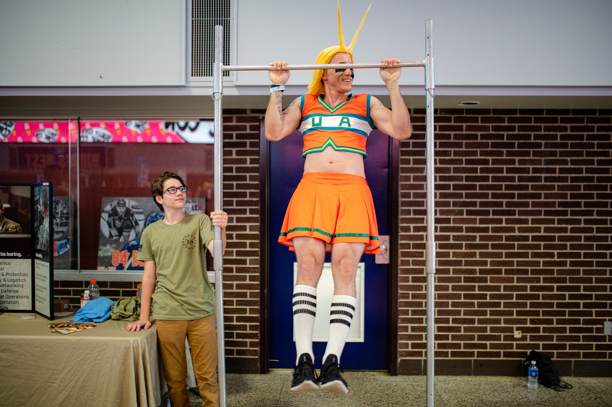 Lucas Lawrence, dressed as All Might from the anime “My Hero Academia,” tests his strength with a round of pull-ups during Really Cool Comic Con at the Dort Financial Center in Flint, Mich. on August 6, 2022. (Michael Indriolo | Flint Beat)