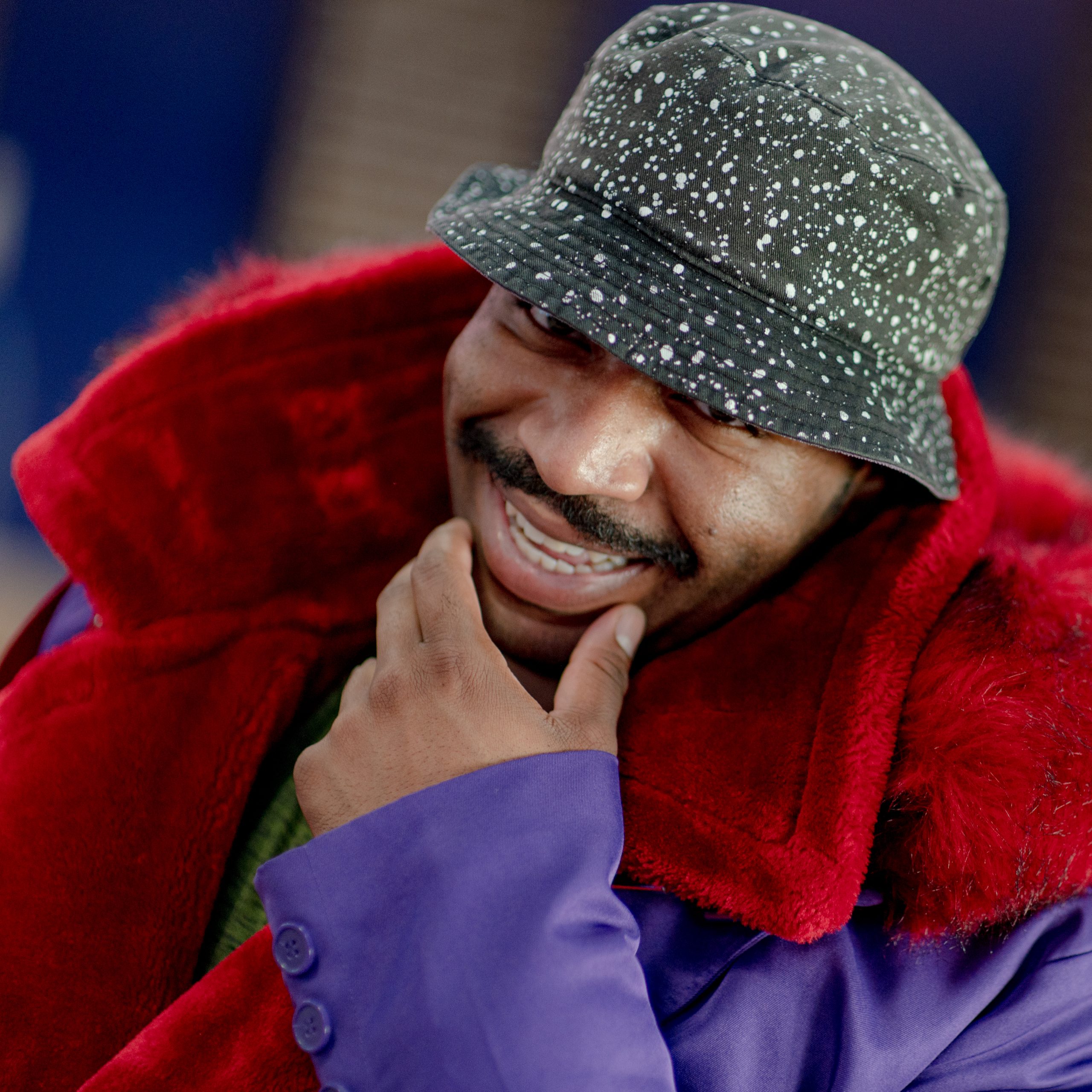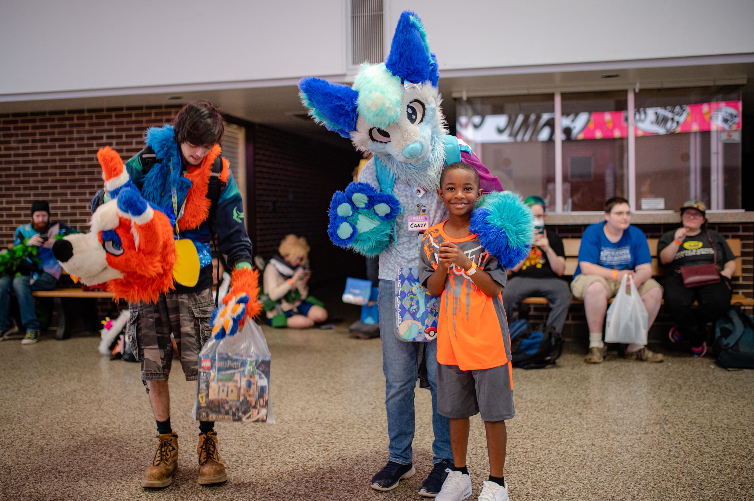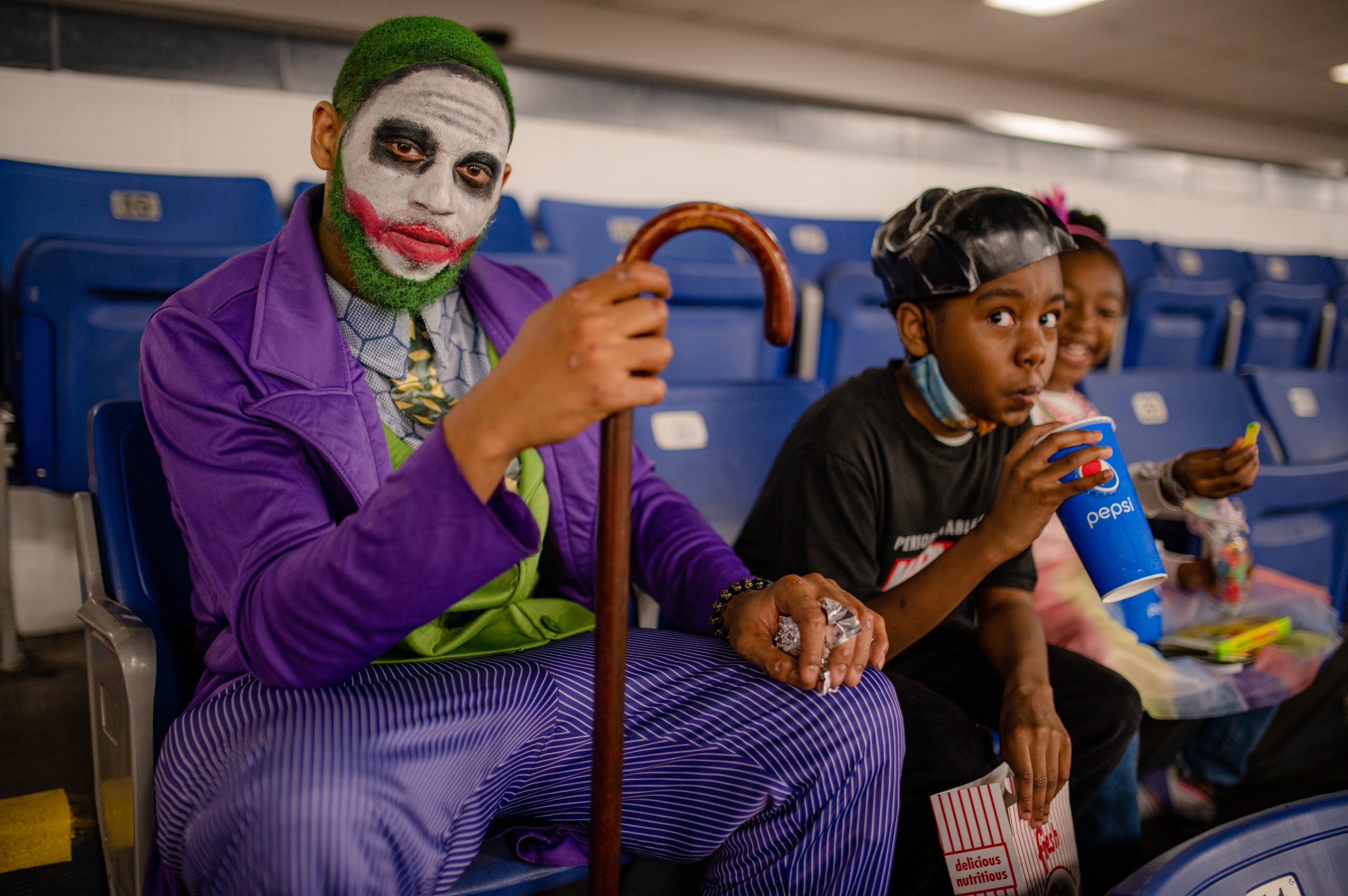 Jay Price poses for a picture with Glaycier and Tided Pod during Really Cool Comic Con at the Dort Financial Center in Flint, Mich. on August 6, 2022. (Michael Indriolo | Flint Beat)