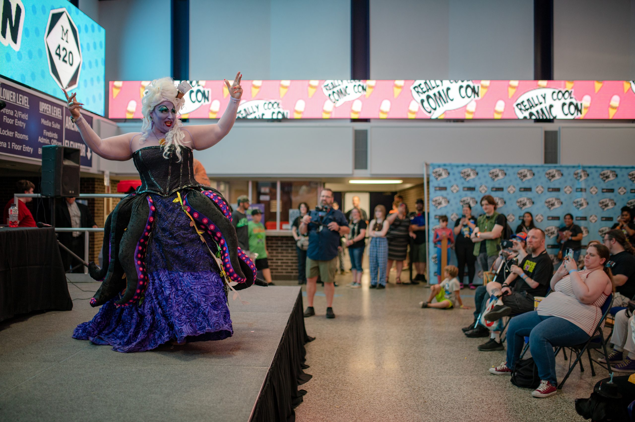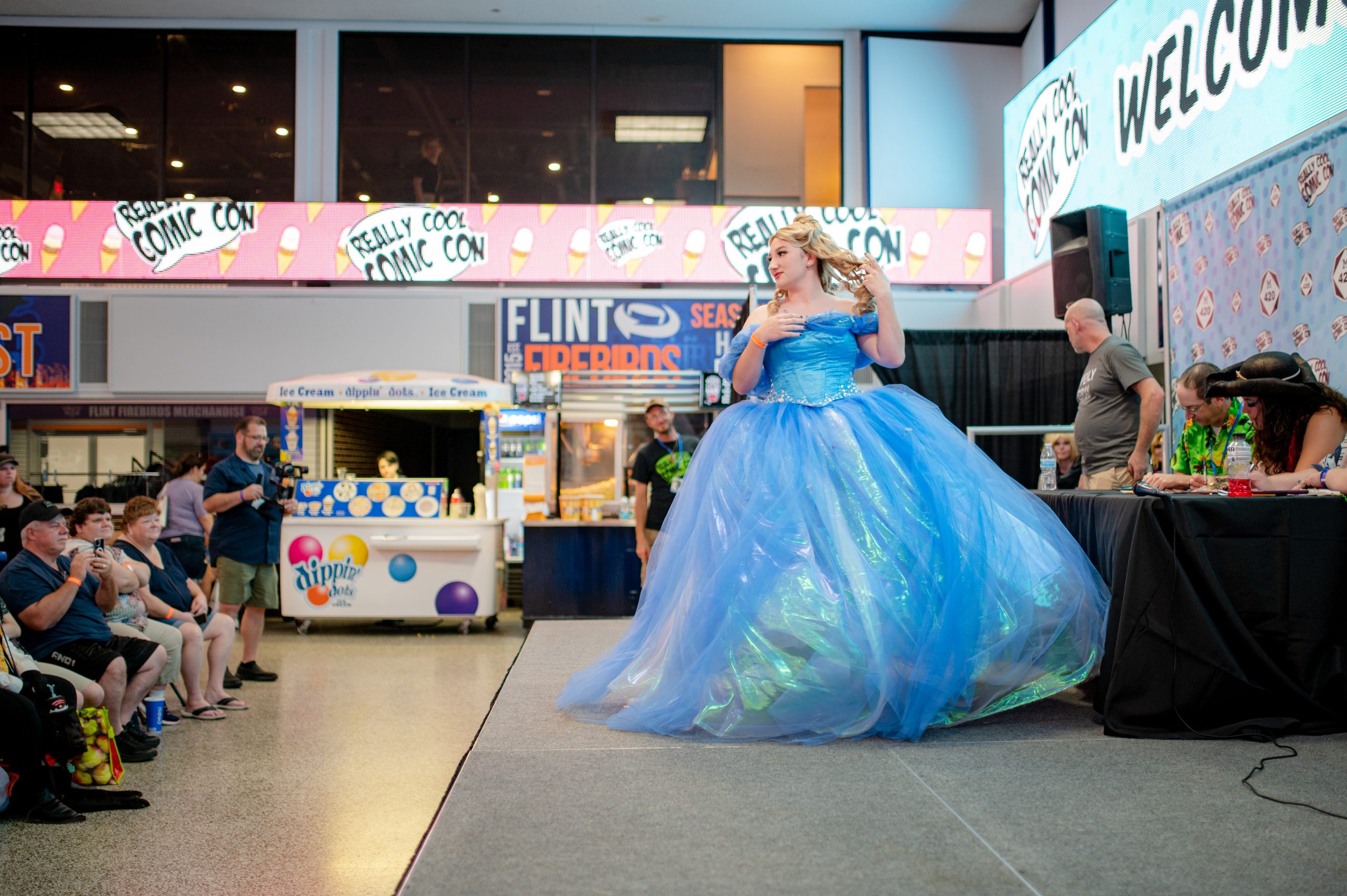 A cosplayer dressed as Cinderella takes to the stage during the cosplay contest at Really Cool Comic Con at the Dort Financial Center in Flint, Mich. on August 6, 2022. (Michael Indriolo | Flint Beat)