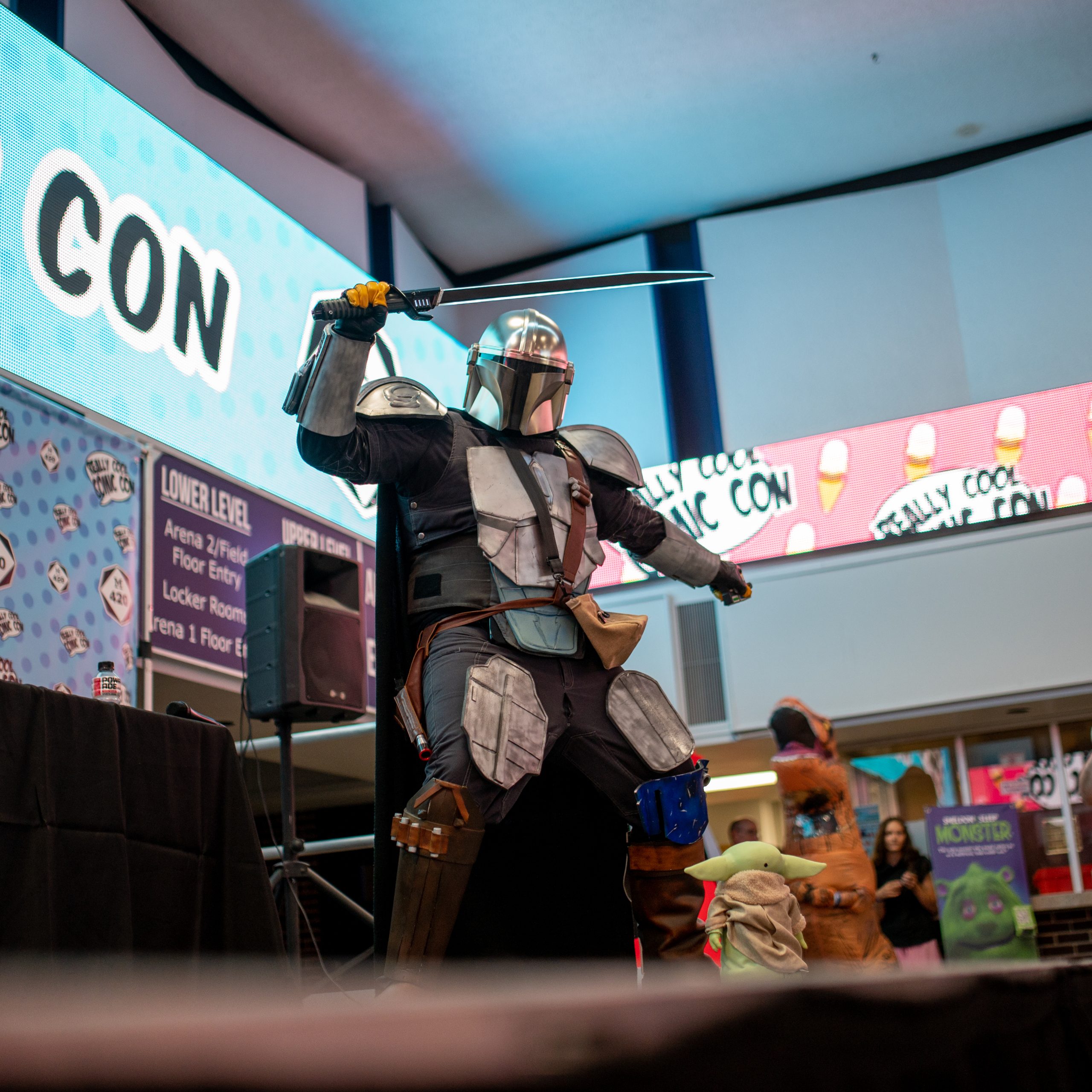 Azrael Ortega, dressed as Din Djarin from the television show “The Mandolorian,” strikes a pose during the Cosplay Contest at Really Cool Comic Con at the Dort Financial Center in Flint, Mich. on August 6, 2022. (Michael Indriolo | Flint Beat)
