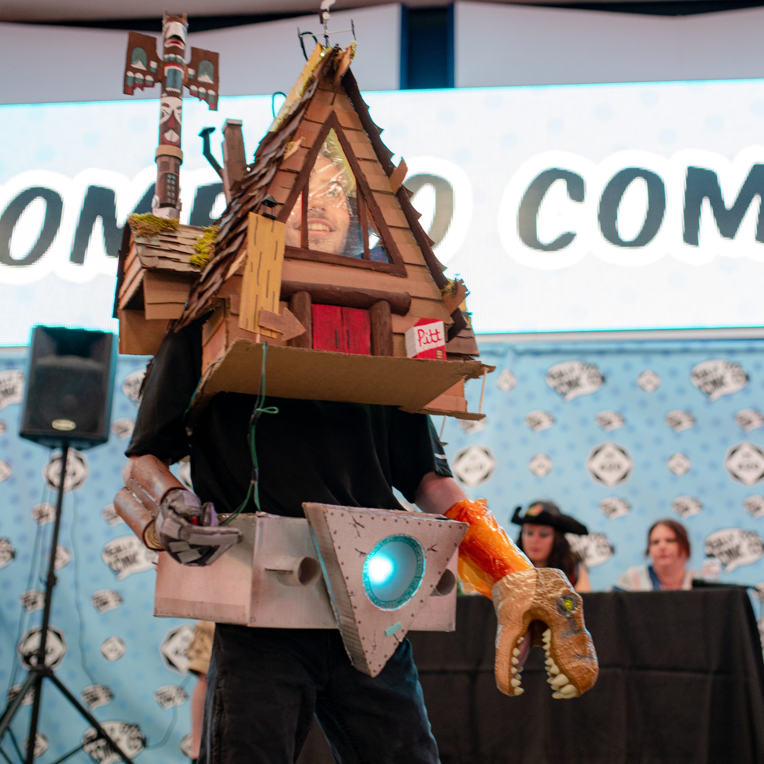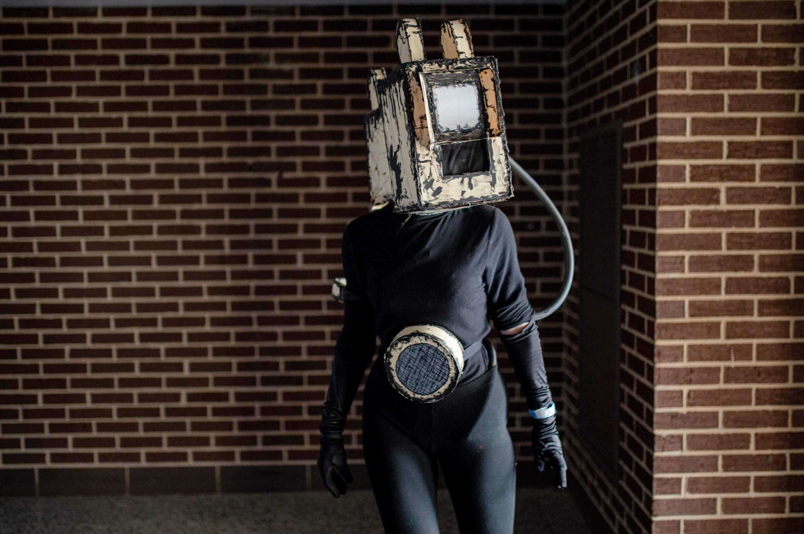A cosplayer dressed as Shacktron from the television show “Gravity Falls” shows his costume during the Cosplay Contest at Really Cool Comic Con at the Dort Financial Center in Flint, Mich. on August 6, 2022. (Michael Indriolo | Flint Beat)