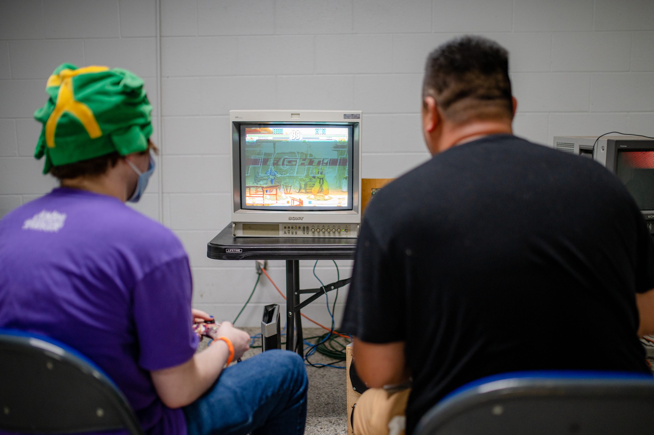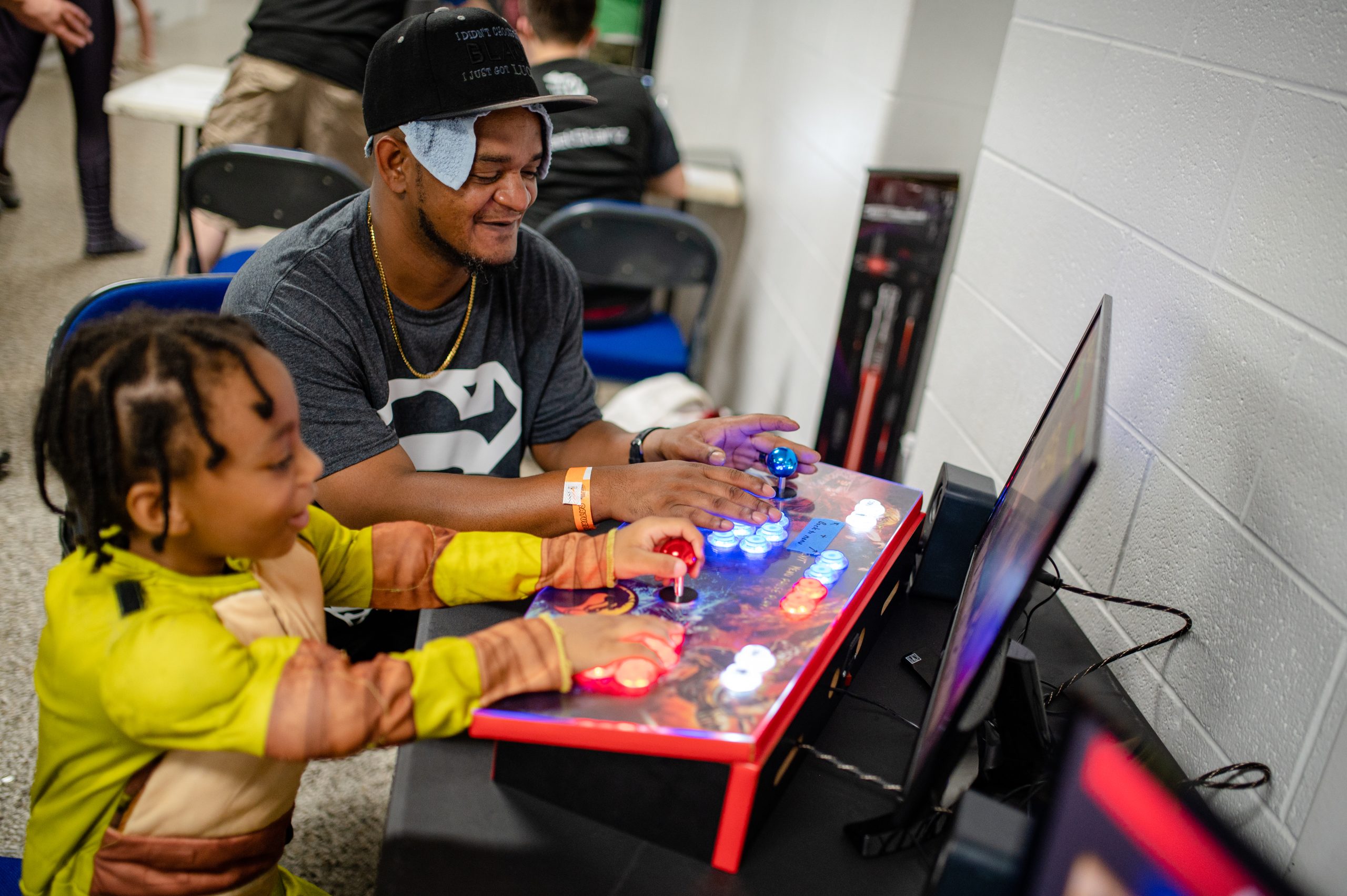 Johnny Walker and Jayden Walker play the video game “Mortal Kombat” during Really Cool Comic Con at the Dort Financial Center in Flint, Mich. on August 6, 2022. (Michael Indriolo | Flint Beat)