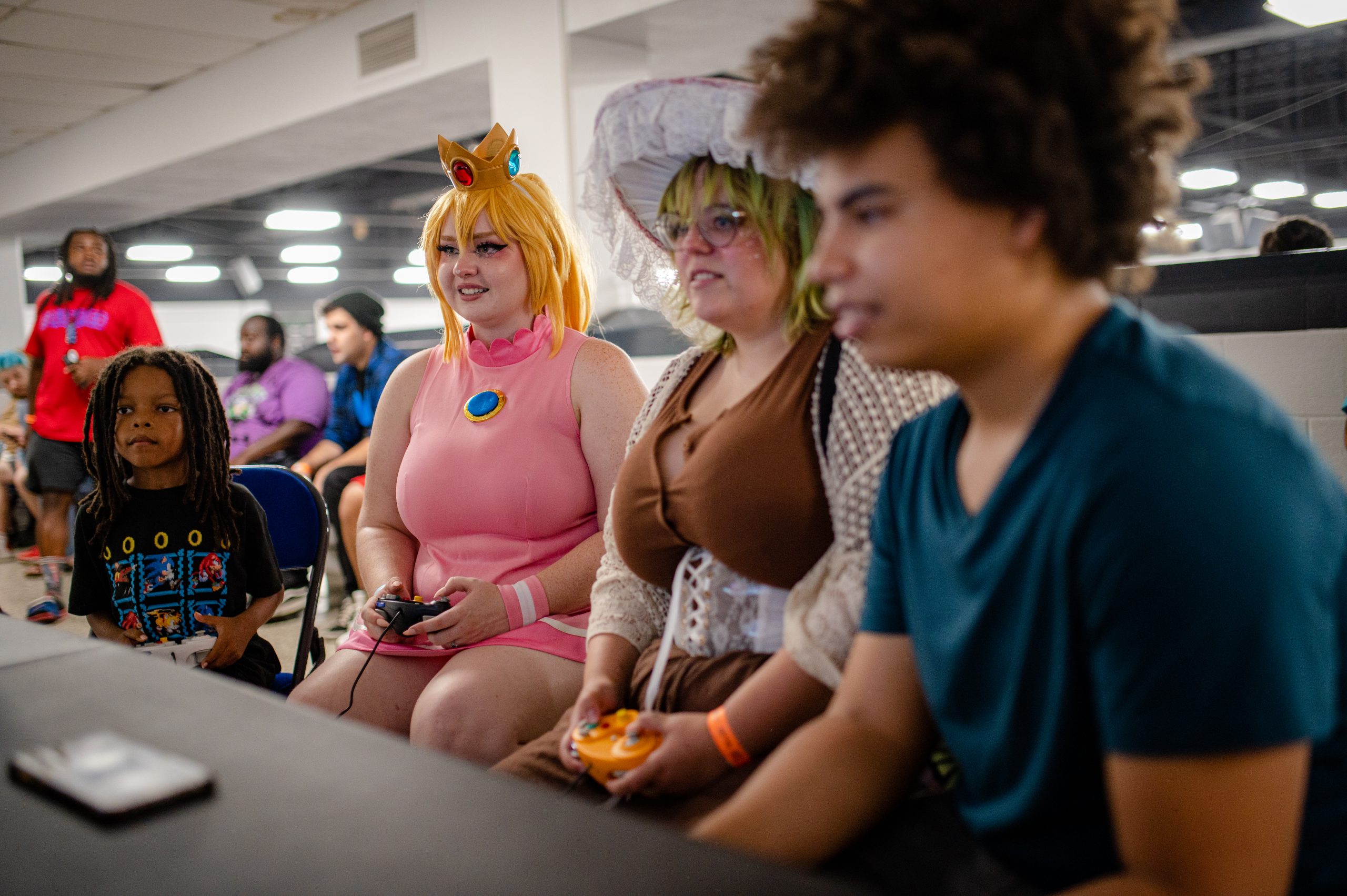 Johann Thomas, Hollister Henry, Oleander Drumm and Jason Jones play the video game “Super Smash Bros. Melee” during Really Cool Comic Con at the Dort Financial Center in Flint, Mich. on August 6, 2022. (Michael Indriolo | Flint Beat)