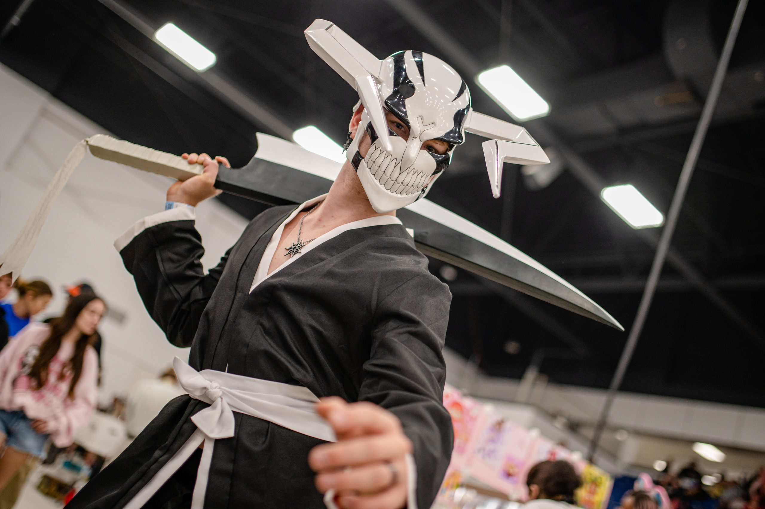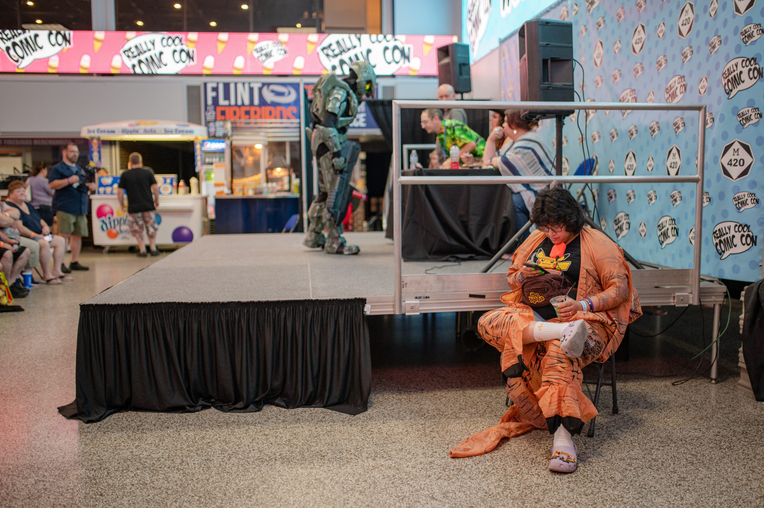 Ricardio Garcia and Adrian Headley face off in the video game “Street Fighter III: Third Strike” during Really Cool Comic Con at the Dort Financial Center in Flint, Mich. on August 6, 2022. (Michael Indriolo | Flint Beat)Mason Smith, dressed as Full Hollow Ichigo from the anime “Bleach” poses for a photo during Really Cool Comic Con at the Dort Financial Center in Flint, Mich. on August 6, 2022. (Michael Indriolo | Flint Beat)Tyler Shephard, dressed as Sniper Mask from the anime “High-Rise Invasion,” poses for a photo during the Cosplay Contest at Really Cool Comic Con at the Dort Financial Center in Flint, Mich. on August 6, 2022. (Michael Indriolo | Flint Beat)Attendees wait in line for an autograph from WWE Hall-of-Fame wrestler “Hacksaw” Jim Duggan during Really Cool Comic Con at the Dort Financial Center in Flint, Mich. on August 6, 2022. (Michael Indriolo | Flint Beat)