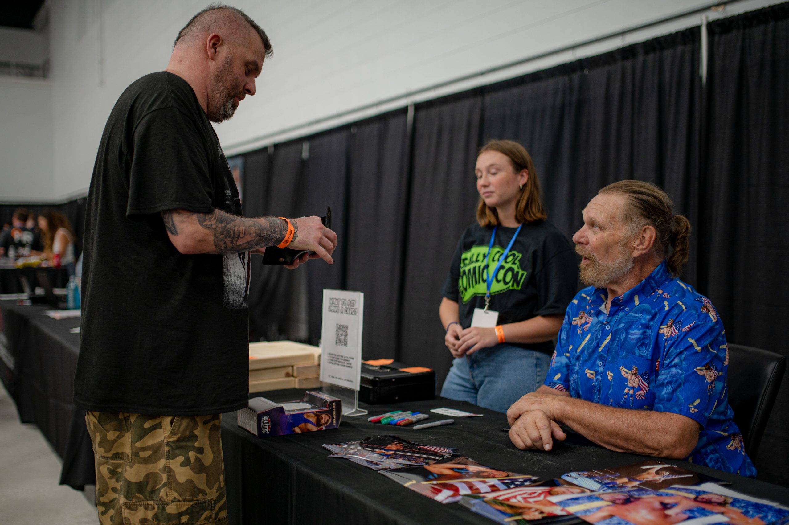WWE Hall-of-Fame wrestler “Hacksaw” Jim Duggan speaks with Jeremy Donley before signing a figure for him during Really Cool Comic Con at the Dort Financial Center in Flint, Mich. on August 6, 2022. (Michael Indriolo | Flint Beat)