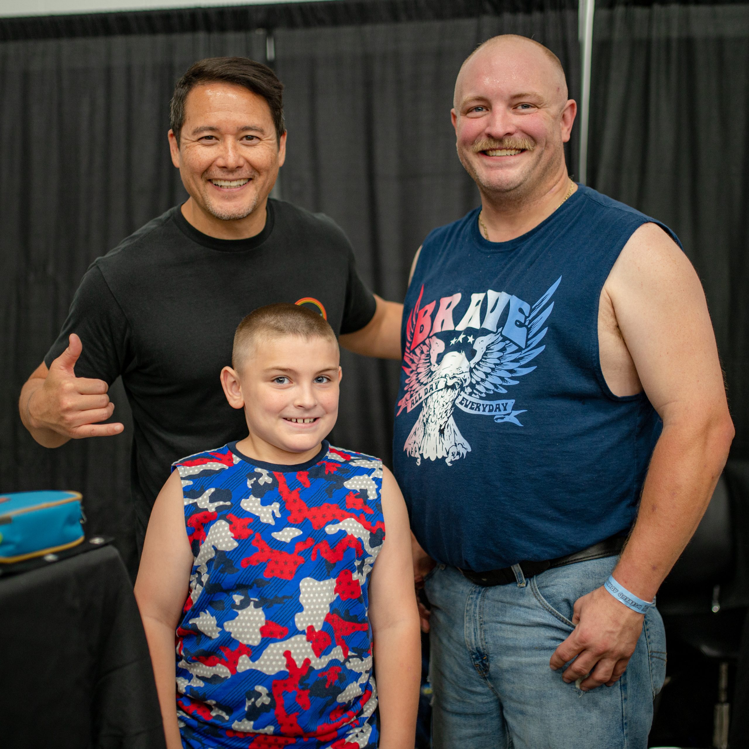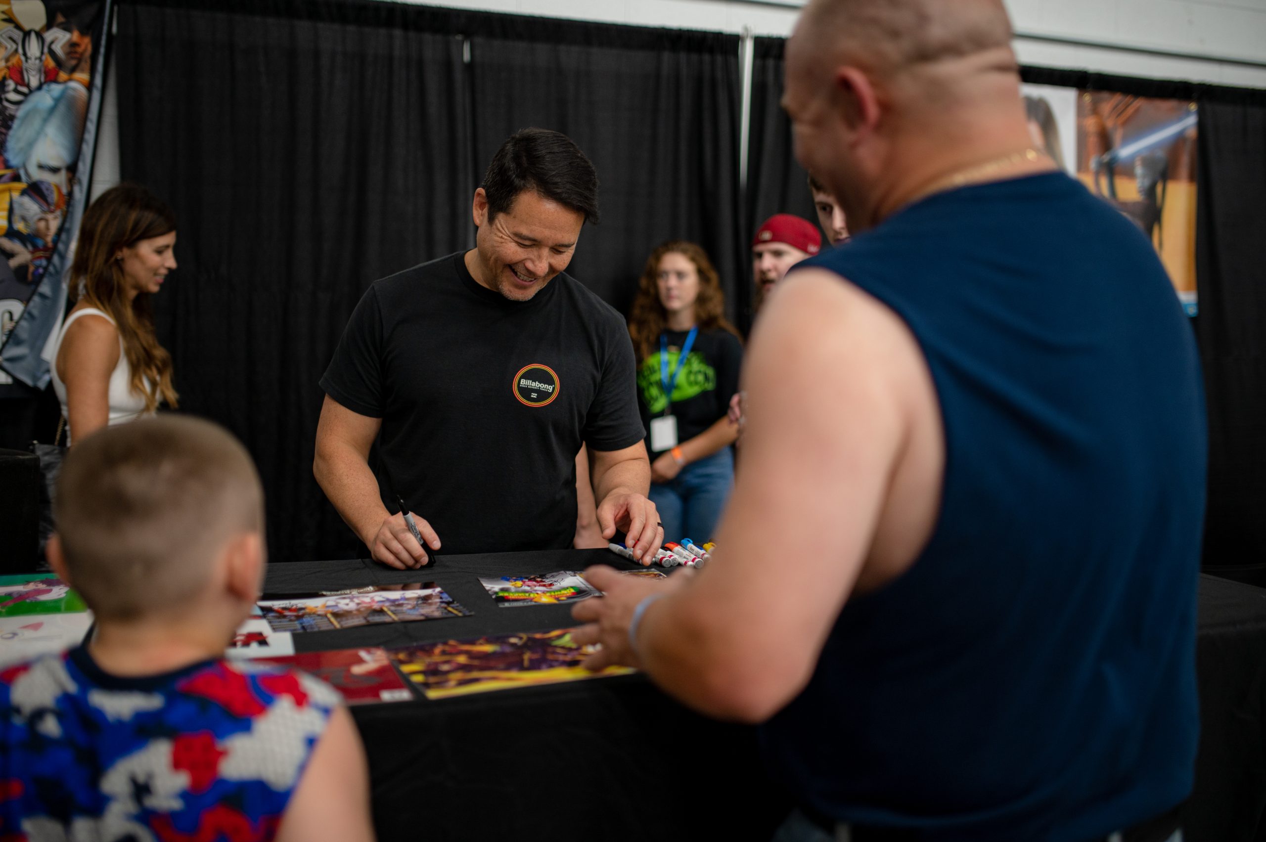 Famed actor Johnny Yong Bosch autographs a Power Rangers comic for Aaron Torpey and Gavin Torpey during Really Cool Comic Con at the Dort Financial Center in Flint, Mich. on August 6, 2022. Bosch has acted in multiple “Power Rangers” television series, and he has voiced characters in notable anime productions such as “Akira” and “Bleach.” (Michael Indriolo | Flint Beat)