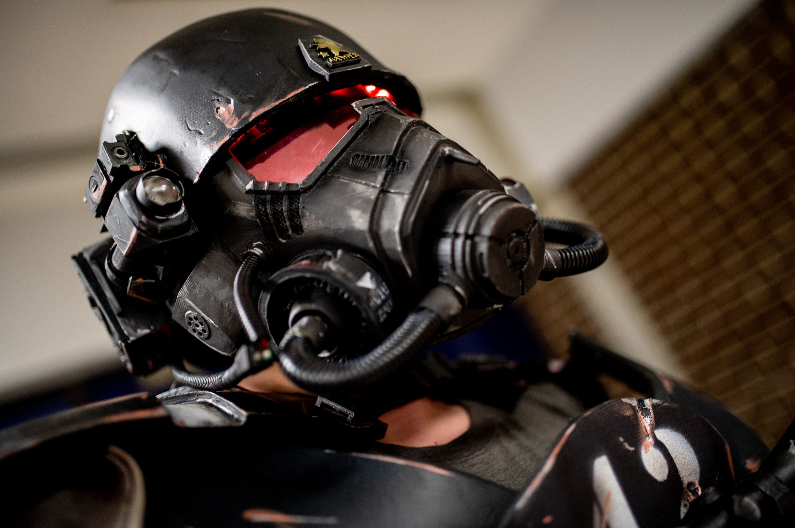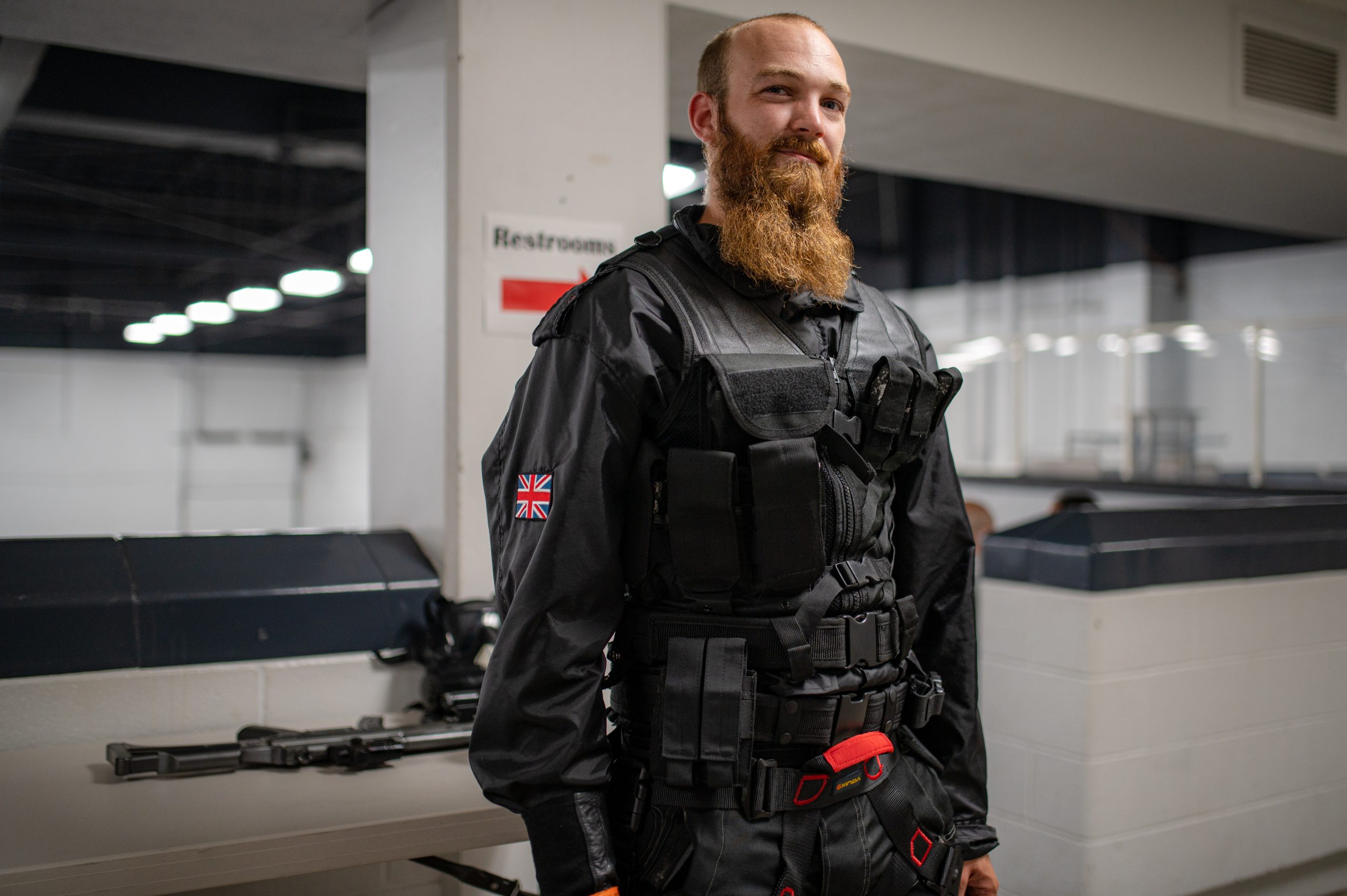 Christian Devries, dressed as Mute from the video game “Tom Clancy’s Rainbow Six Seige,” poses for a photo during Really Cool Comic Con at the Dort Financial Center in Flint, Mich. on August 6, 2022. (Michael Indriolo | Flint Beat)