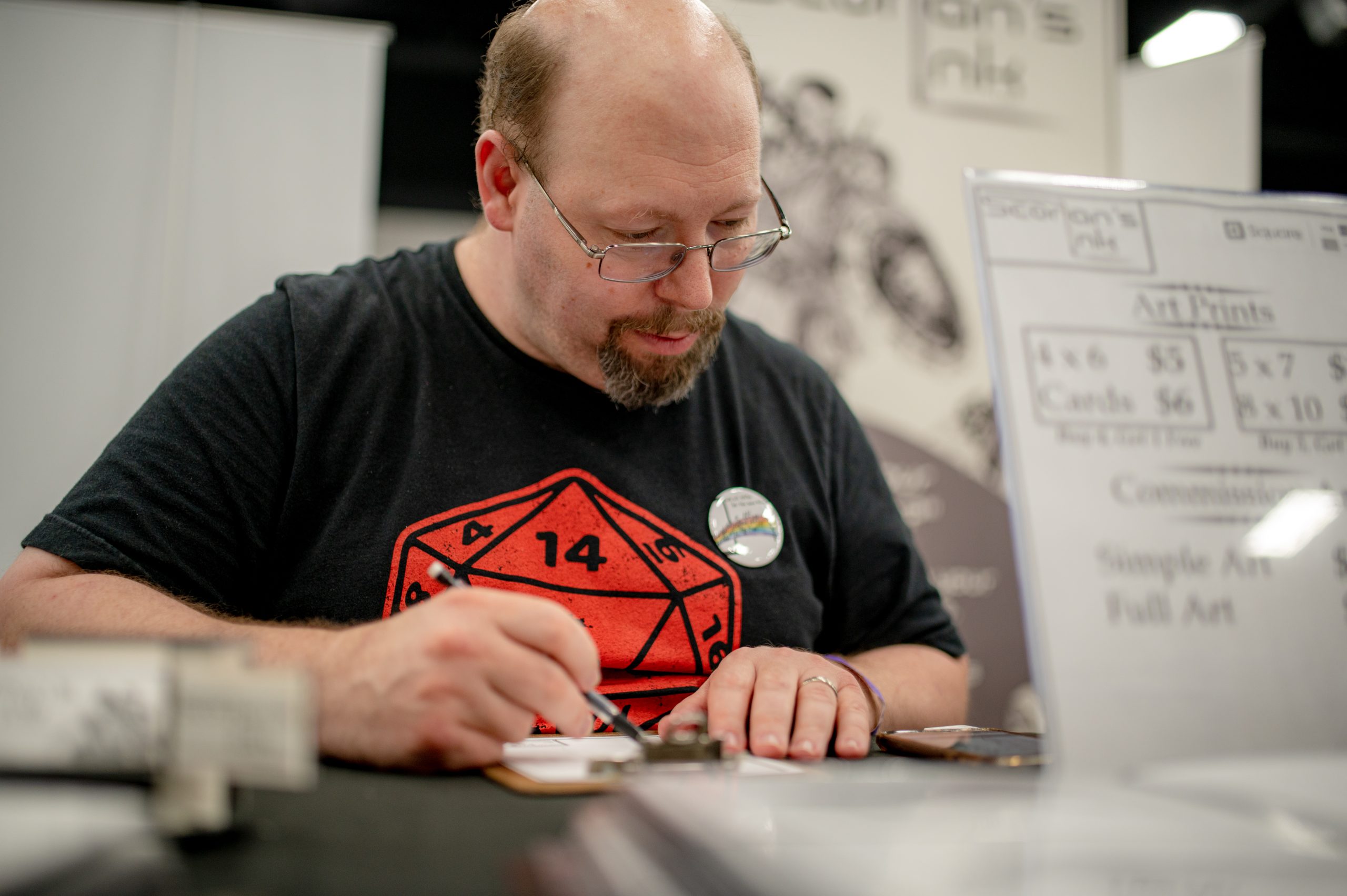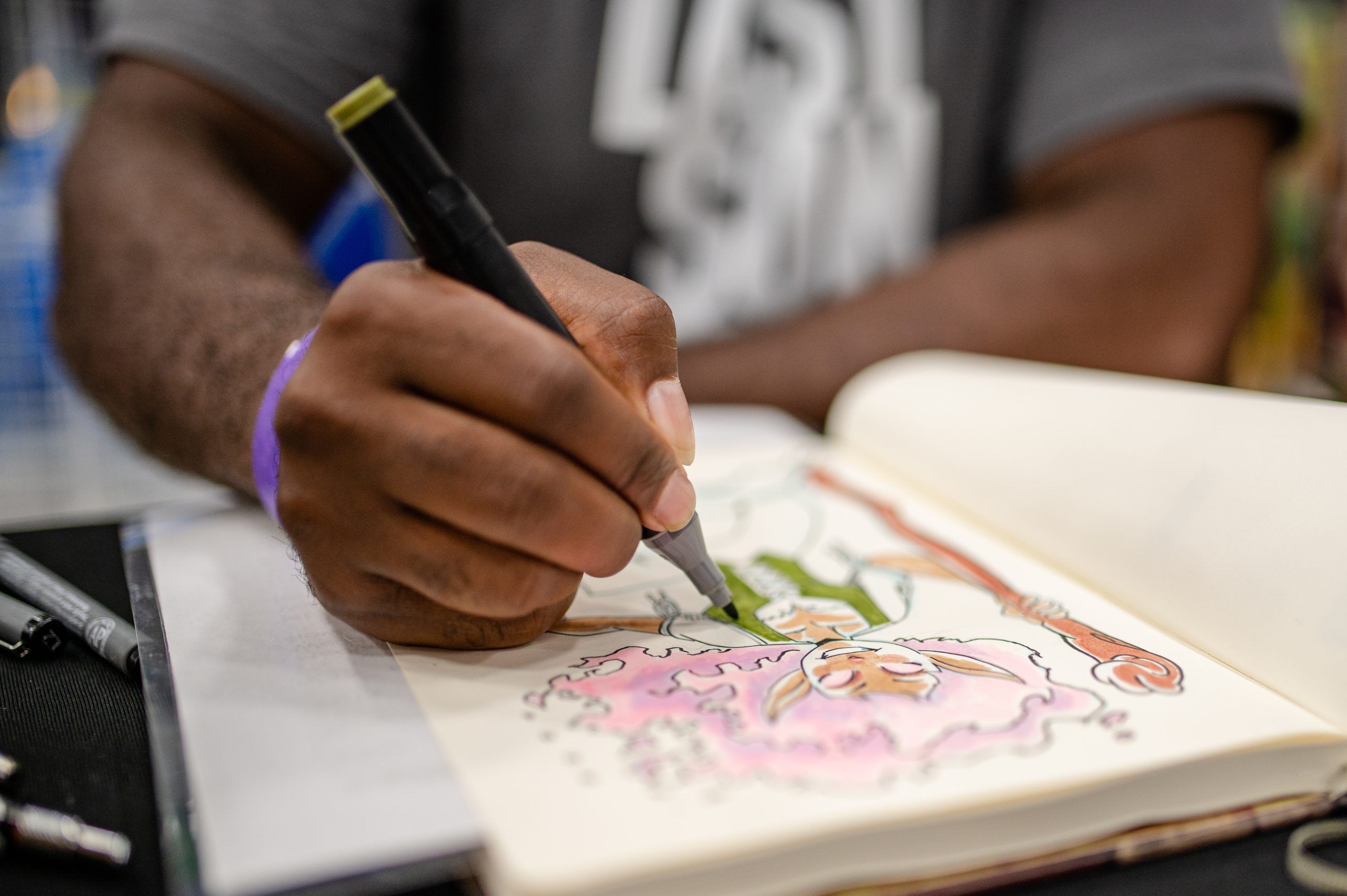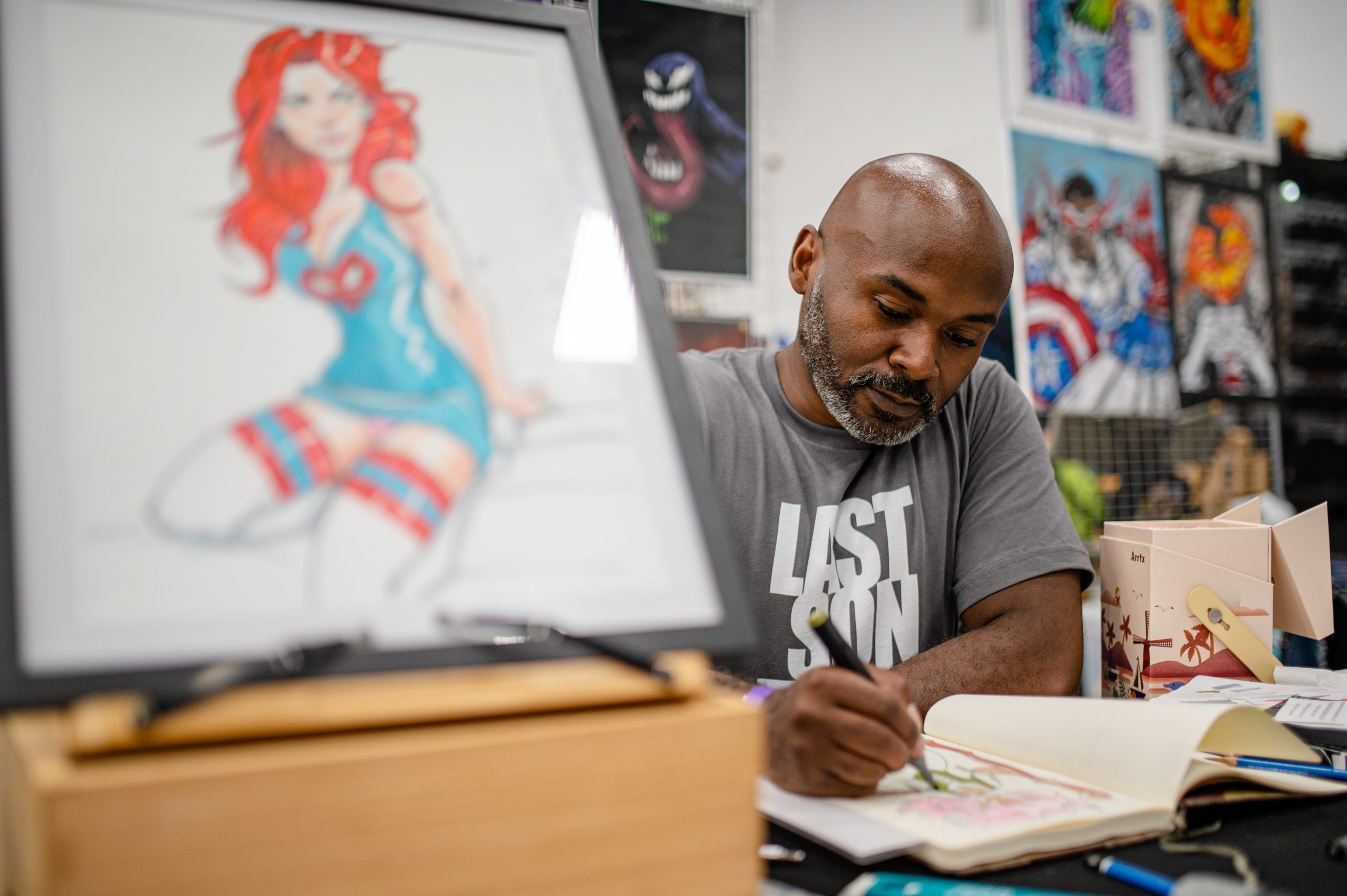 Terrell Culbert, a comic artist with the publishing company Last Son Comics, colors in a character during Really Cool Comic Con at the Dort Financial Center in Flint, Mich. on August 6, 2022. Culbert, from the Detroit area, has been drawing for more than 20 years, he said (Michael Indriolo | Flint Beat)