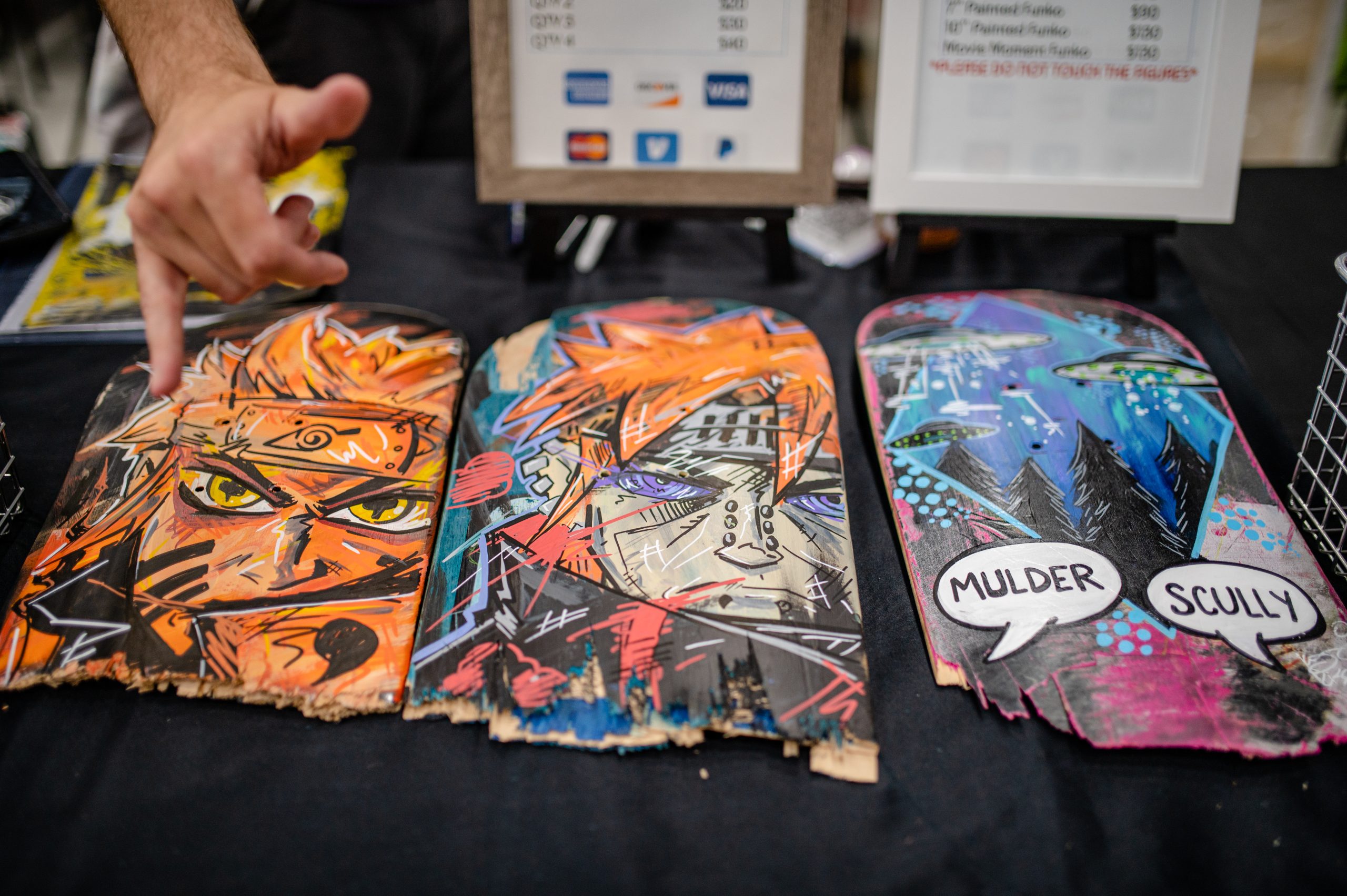 Artist Kyle Irving points out details on one of his skate board paintings during Really Cool Comic Con at the Dort Financial Center in Flint, Mich. on August 6, 2022. (Michael Indriolo | Flint Beat)