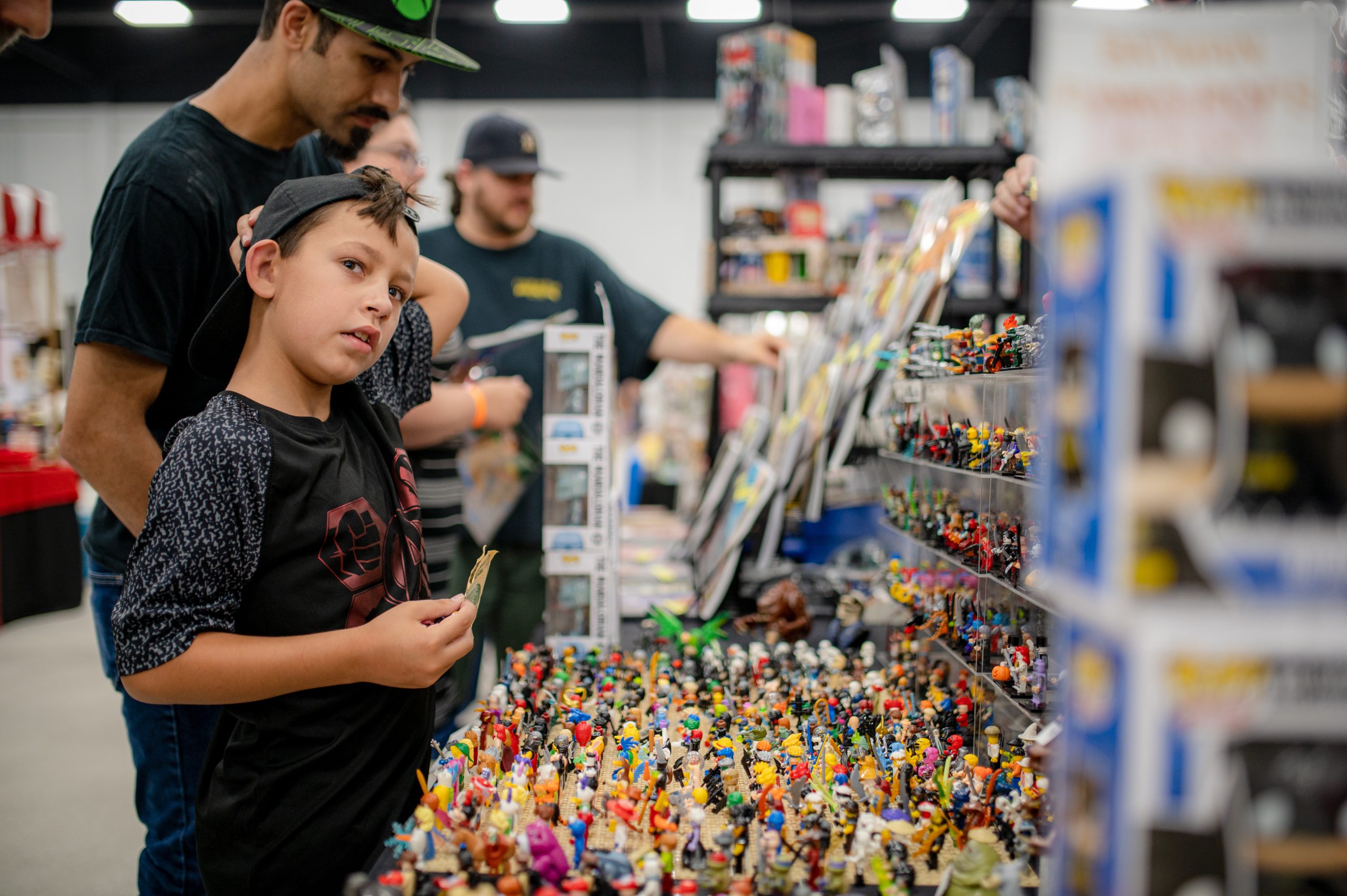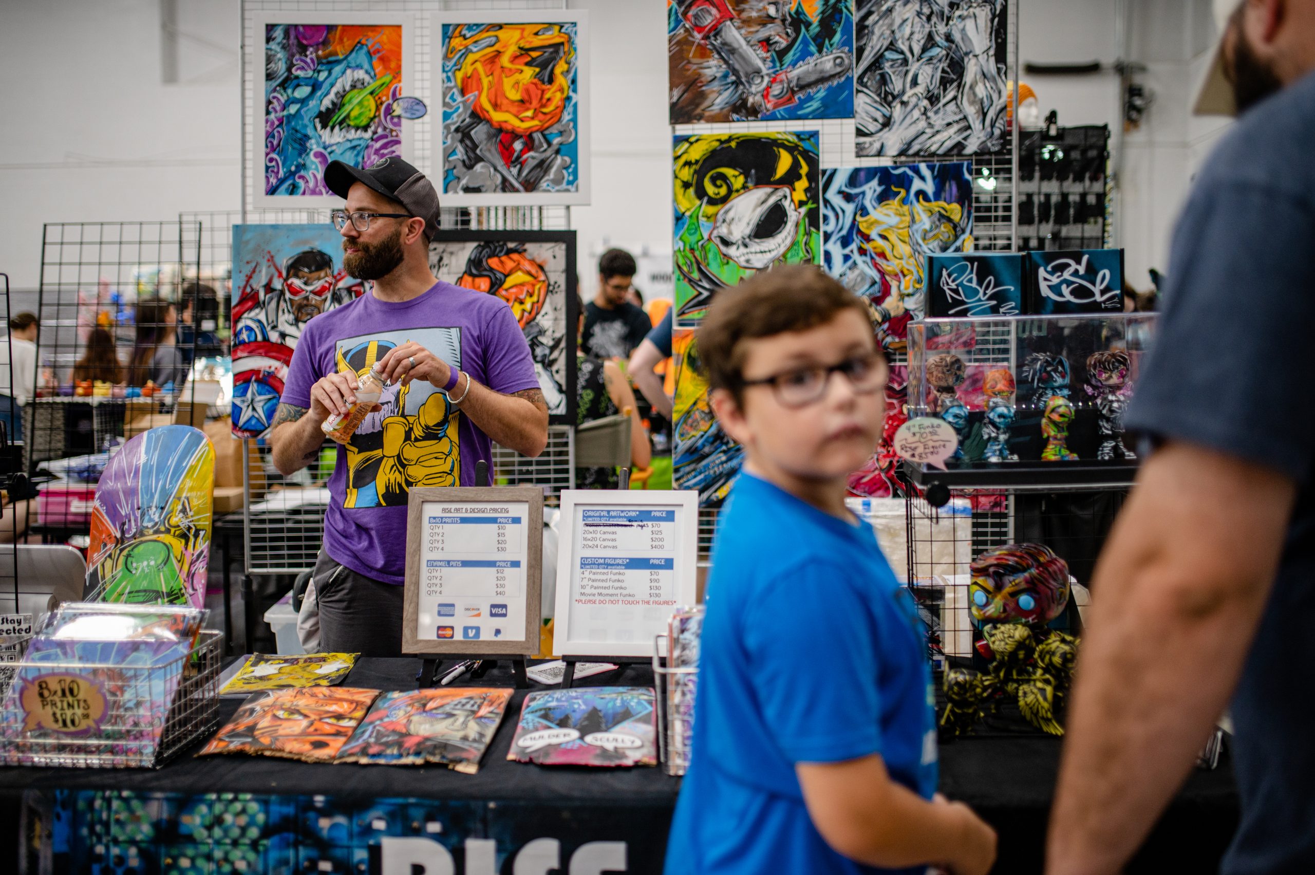 Scooter Husbenet and Parker Husbenet look at custom-pinted figures made by Kyle Irving during Really Cool Comic Con at the Dort Financial Center in Flint, Mich. on August 6, 2022. (Michael Indriolo | Flint Beat)