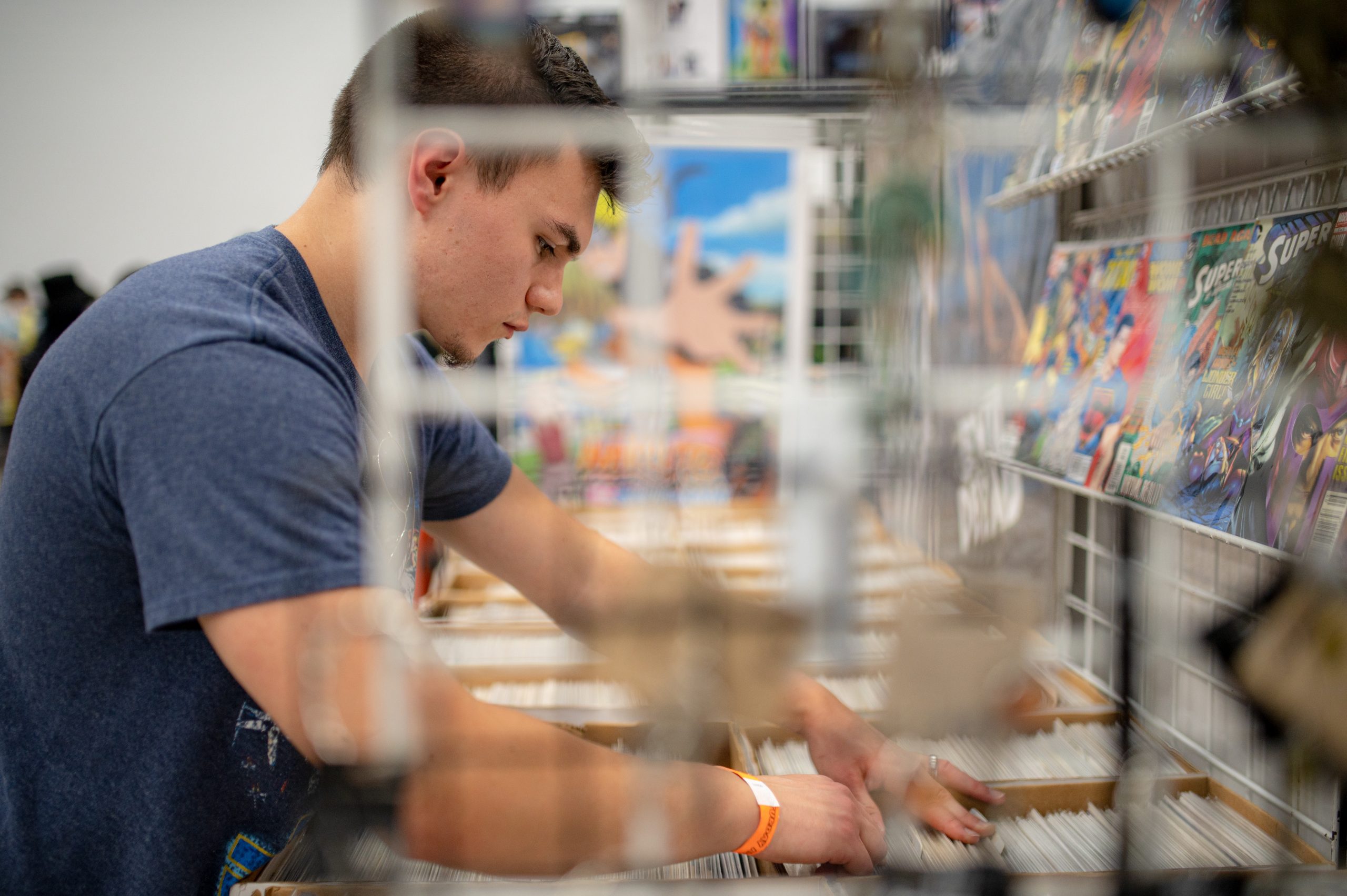 Brendan Kurtz looks through comics during Really Cool Comic Con at the Dort Financial Center in Flint, Mich. on August 6, 2022. (Michael Indriolo | Flint Beat)
