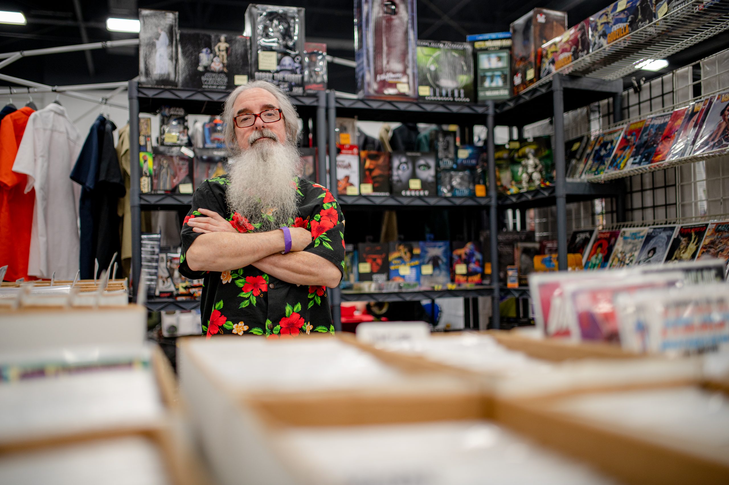 Jeff Ryder, owner of the store Ryder Hobbies in Royal Oak, Mich., poses for a photo during Really Cool Comic Con at the Dort Financial Center in Flint, Mich. on August 6, 2022. Ryder started working at his father’s hobby store in 1974 and has been in the industry ever since. (Michael Indriolo | Flint Beat)