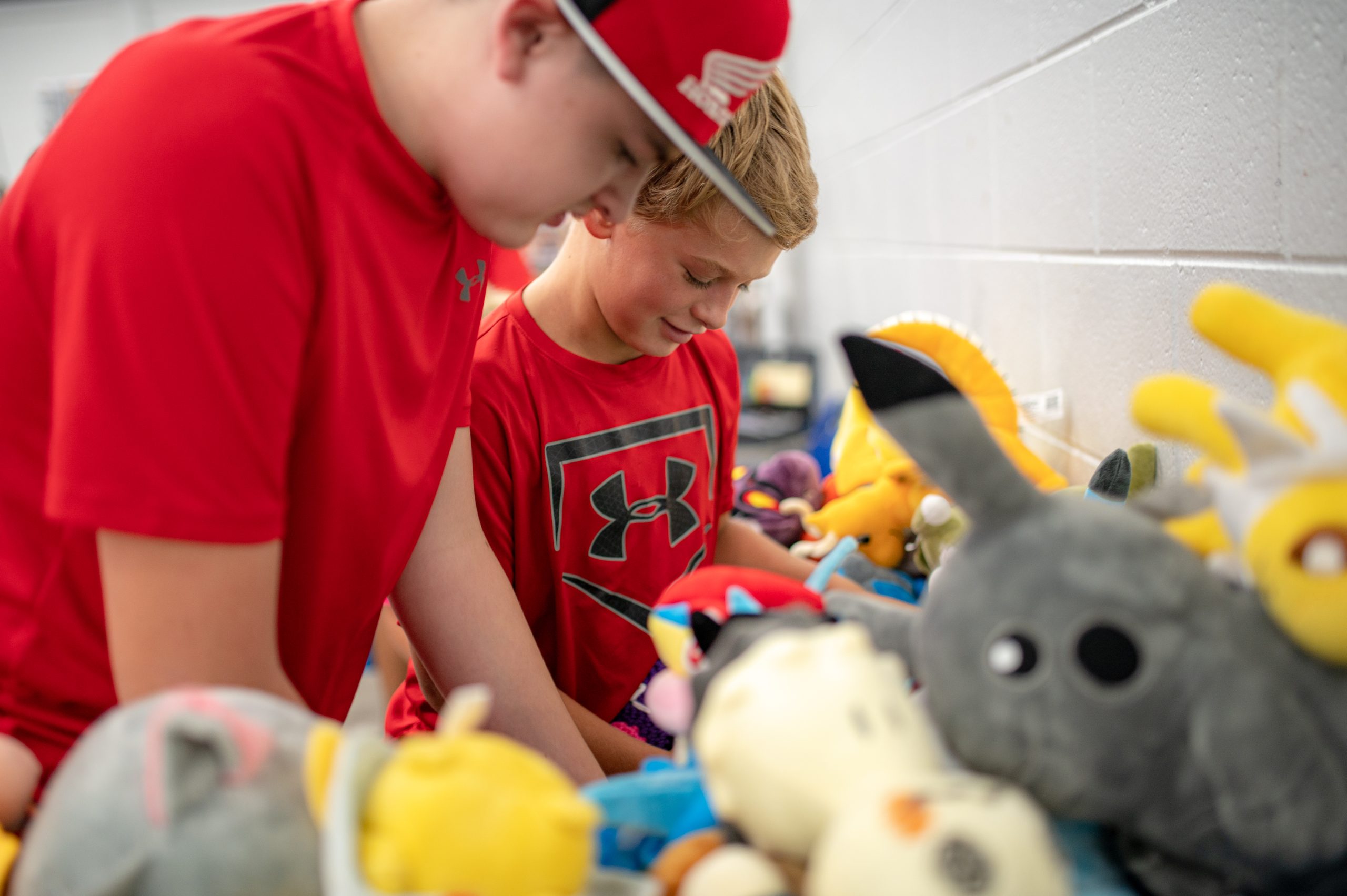 Jaydan Hunt and Nick Hunt look through “Pokemon” plushes during Really Cool Comic Con at the Dort Financial Center in Flint, Mich. on August 6, 2022. (Michael Indriolo | Flint Beat)