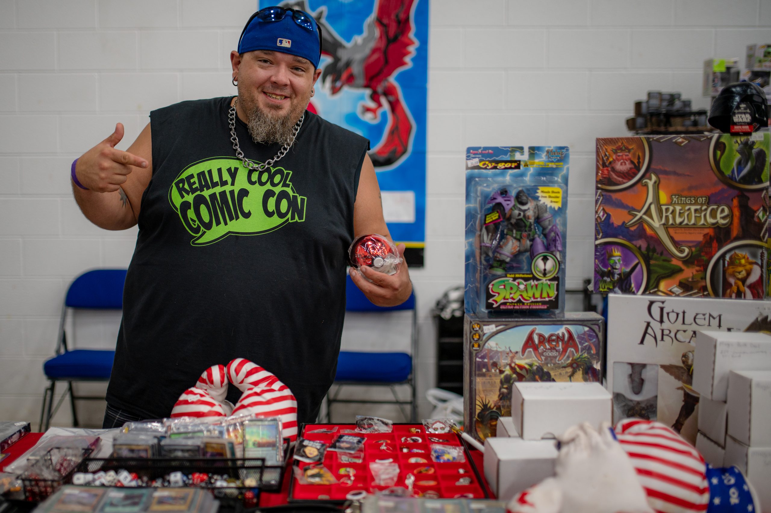 John Hartzler, owner of Mr. J’s Toy Box, poses for a photo at his booth during Really Cool Comic Con at the Dort Financial Center in Flint, Mich. on August 6, 2022. Hartzler bought his first brick-and-mortar store when he was 19 years old, he said. He bought the store from his friend, a comic artist who sold it after landing a job with Marvel, he said. (Michael Indriolo | Flint Beat)