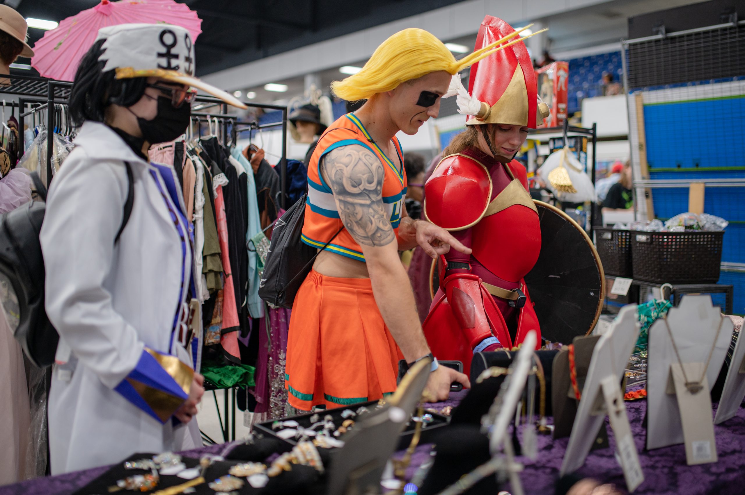 Makayla Lawrence, dressed as Jotaro Kujo from the anime “JoJo’s Bizzare Adventures,” Lucas Lawrence, dressed as All Might from the anime “My Hero Academia,” and Nicole Harris, dressed as Shield Knight from the video game “Shovel Knight” look through jewelery during Really Cool Comic Con at the Dort Financial Center in Flint, Mich. on August 6, 2022. (Michael Indriolo | Flint Beat)