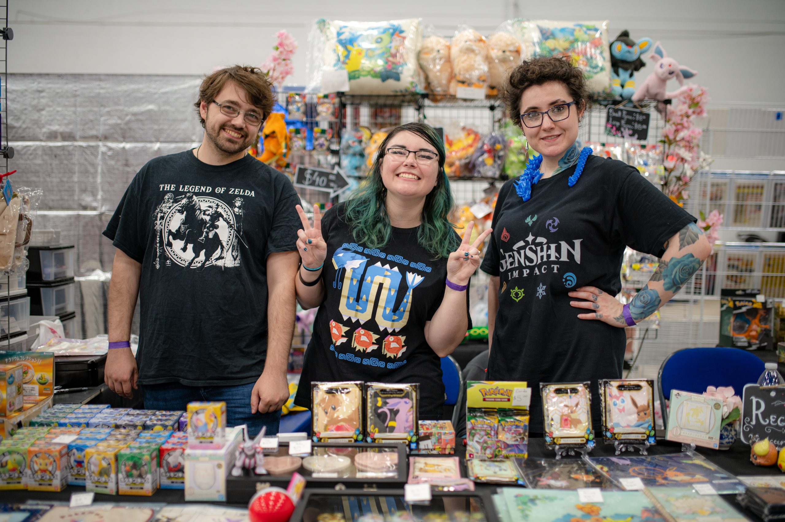 Luna Wight, owner of the toy shop Legendary Japanese Imports, poses for a photo with her coworkers Cody Hill and Tania Butto during Really Cool Comic Con at the Dort Financial Center in Flint, Mich. on August 6, 2022. (Michael Indriolo | Flint Beat)