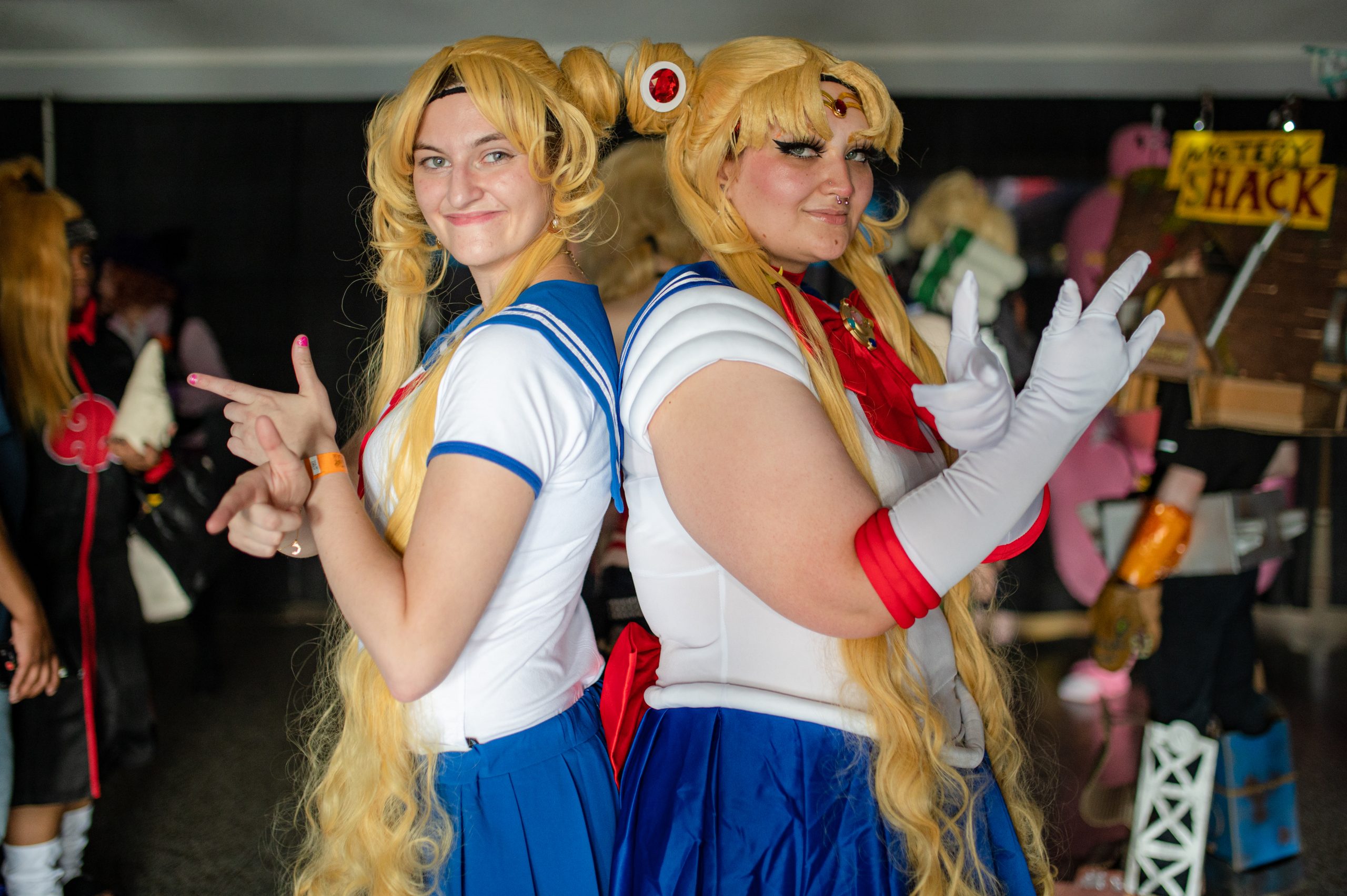 Jordan Pitock, dressed as Usagi Tsukino from the television show “Sailor Moon,” poses for a photo with Melannie Lincoln, dressed as Sailor Moon from the same show during the Cosplay Contest at Really Cool Comic Con at the Dort Financial Center in Flint, Mich. on August 6, 2022. (Michael Indriolo | Flint Beat)