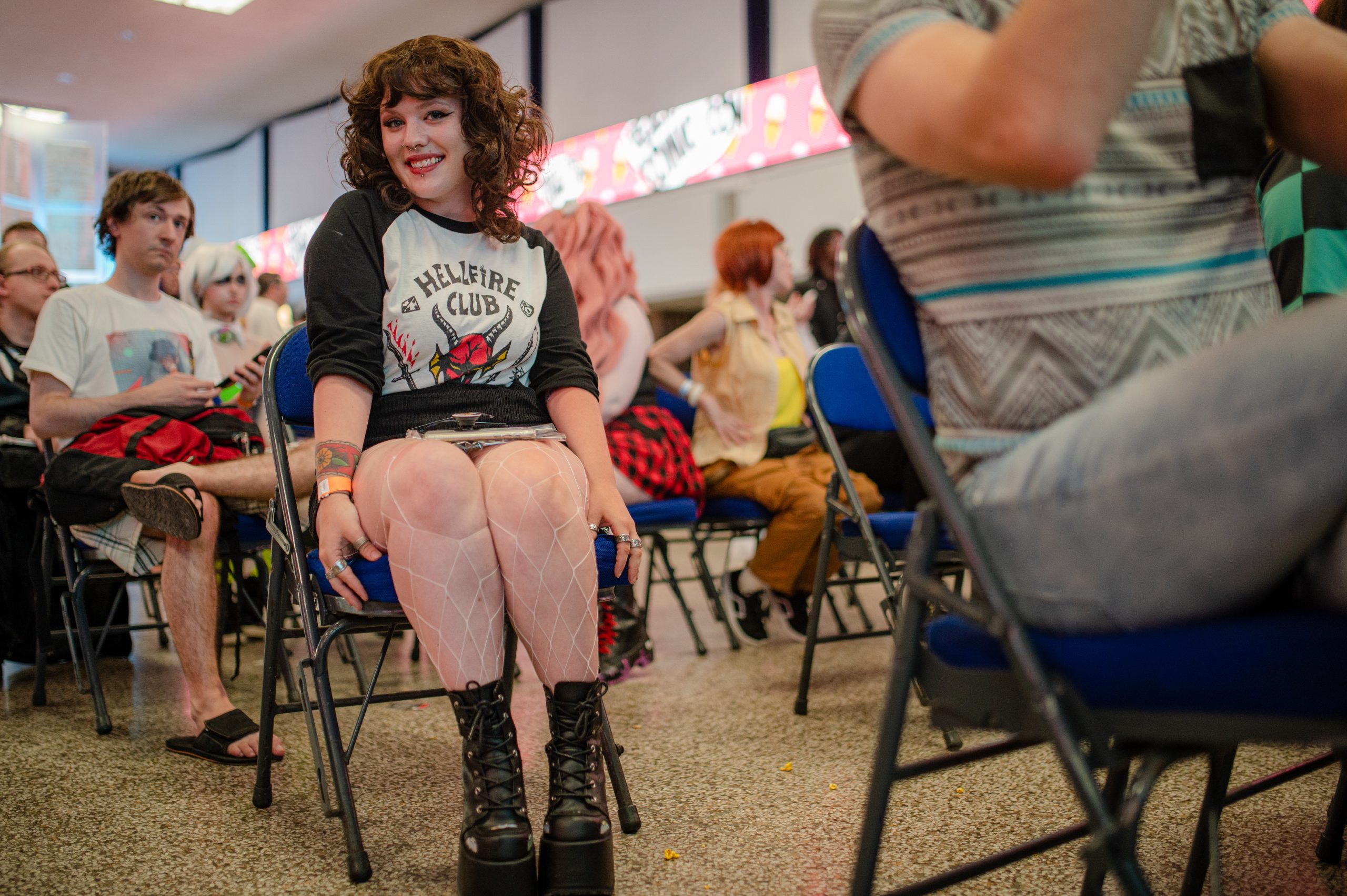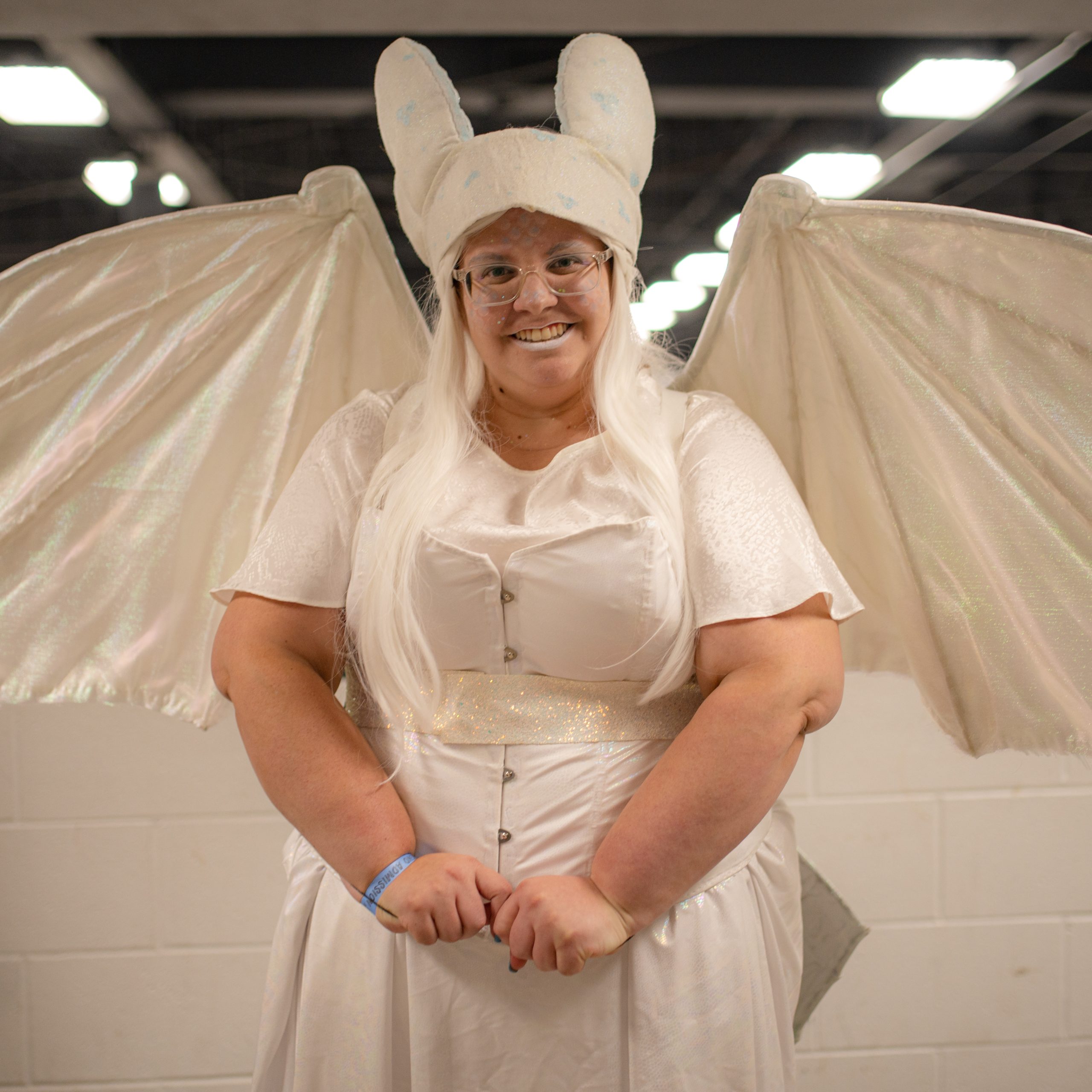 A festival attendee wearing a deflated T-rex costume checks their phone during the cosplay contest at Really Cool Comic Con at the Dort Financial Center in Flint, Mich. on August 6, 2022. (Michael Indriolo | Flint Beat)Heather Rieger, dressed as Light Fury from the movie series “How to Train Your Dragon,” during Really Cool Comic Con at the Dort Financial Center in Flint, Mich. on August 6, 2022. (Michael Indriolo | Flint Beat)