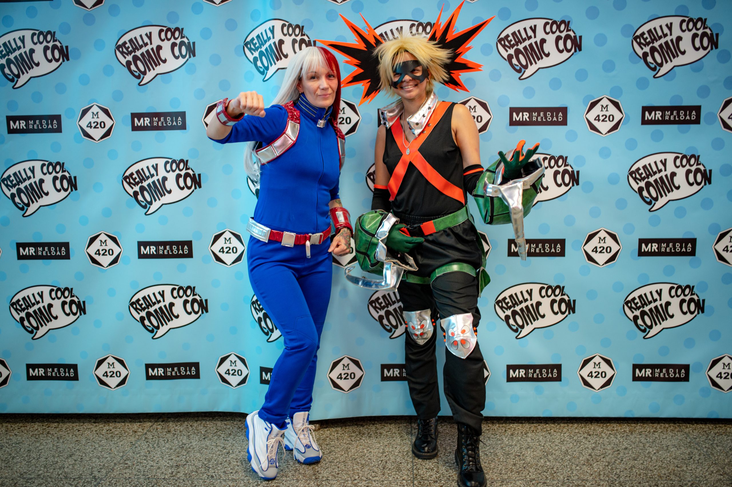 Xaria Bailey, dressed as Katsuki Bakugo from the anime “My Hero Academia,” and Carmen Bailey, dressed as Todoroki Shoto from the same anime, pose for a photo during Really Cool Comic Con at the Dort Financial Center in Flint, Mich. on August 6, 2022. (Michael Indriolo | Flint Beat)