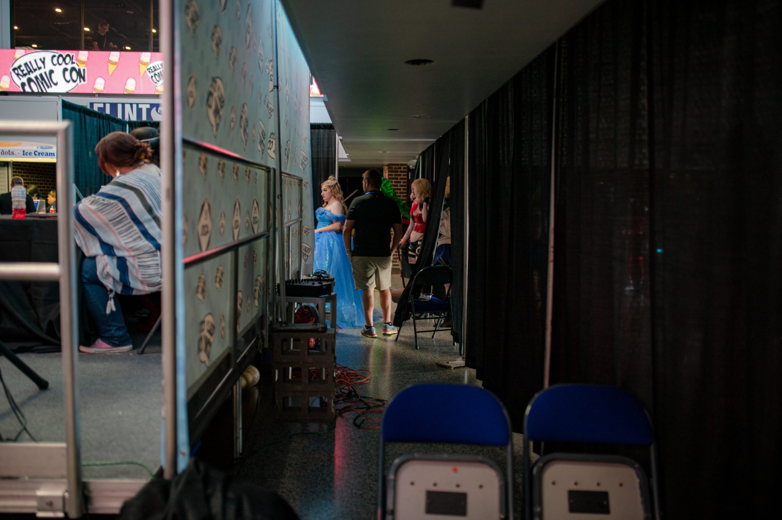 A cosplayer dressed as Cinderella prepares to go on stage during the cosplay contest at Really Cool Comic Con at the Dort Financial Center in Flint, Mich. on August 6, 2022. (Michael Indriolo | Flint Beat)