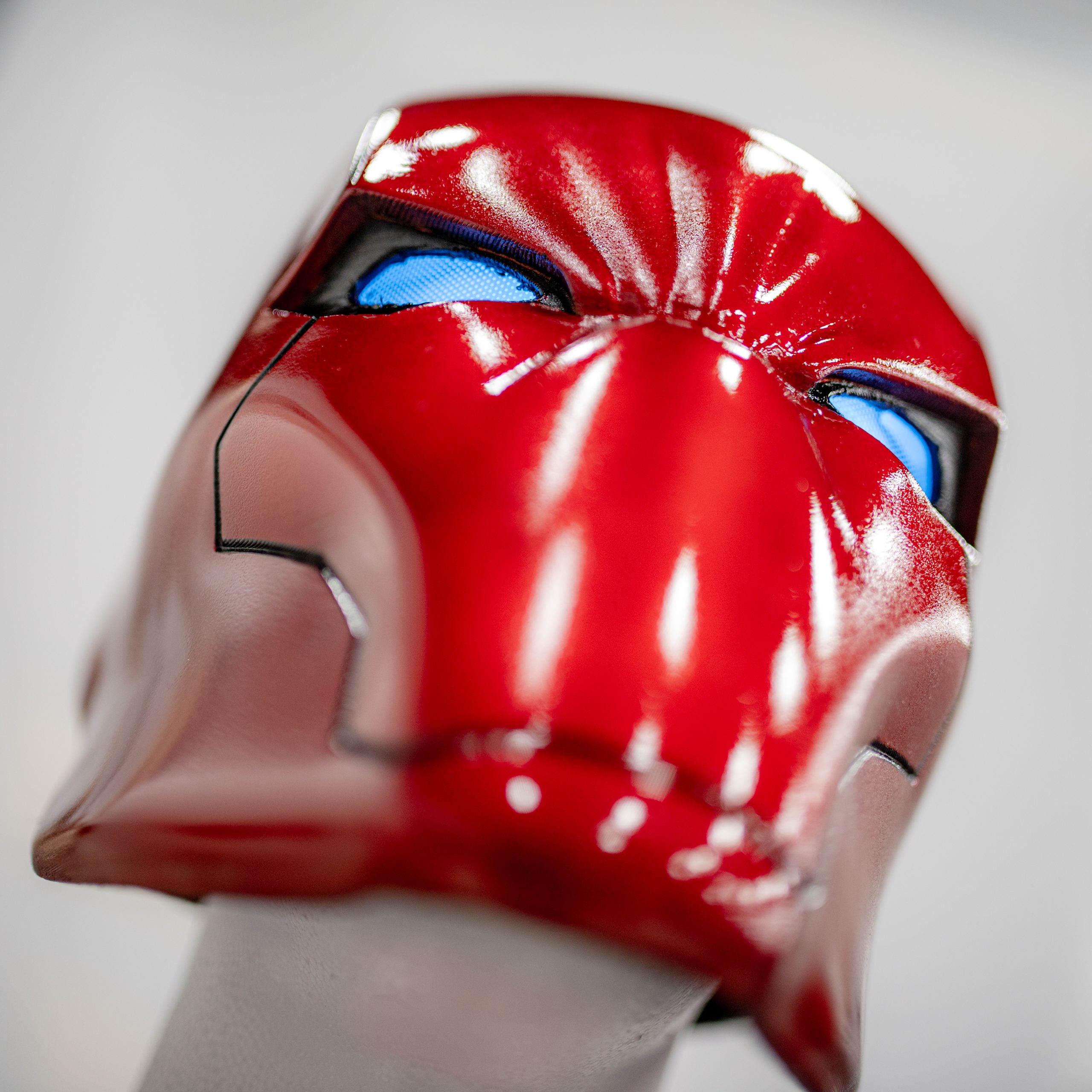 A mask made by Rob Brang, of the prop house called Odd Man Out, rests on a pedestal during Really Cool Comic Con at the Dort Financial Center in Flint, Mich. on August 6, 2022. (Michael Indriolo | Flint Beat)